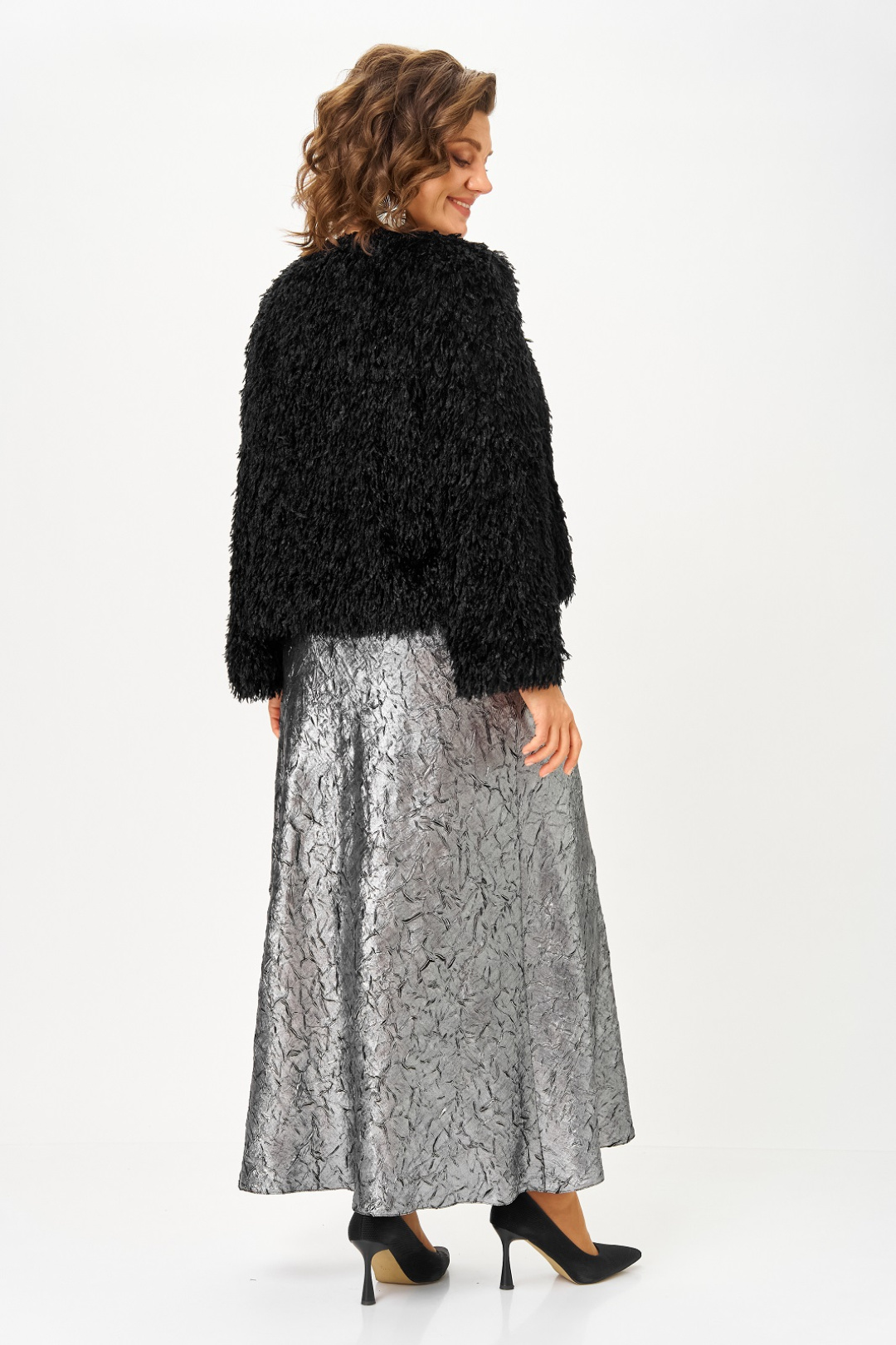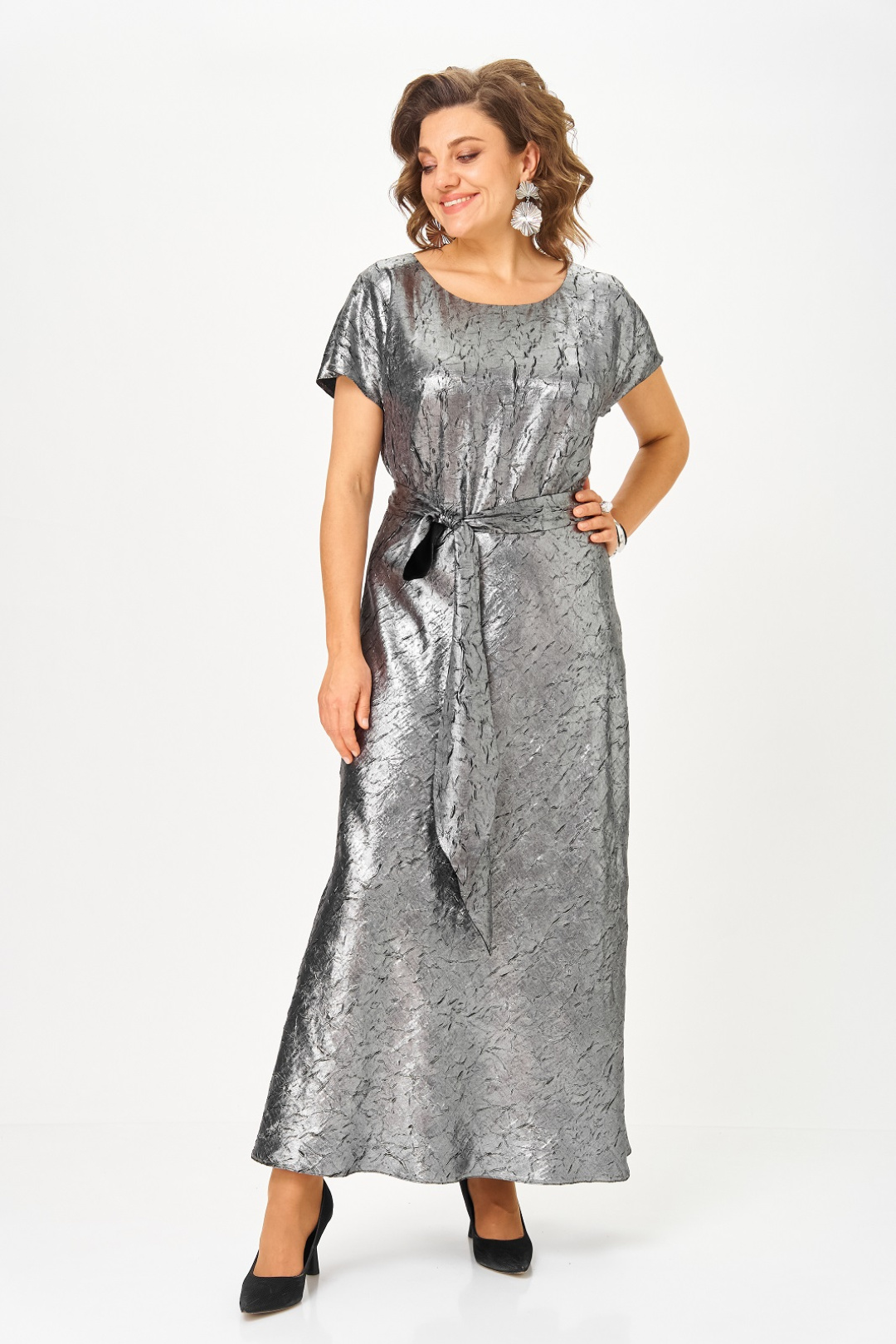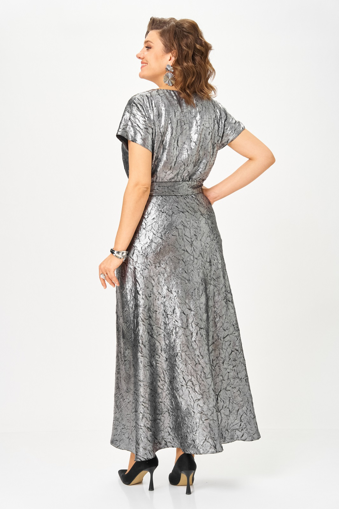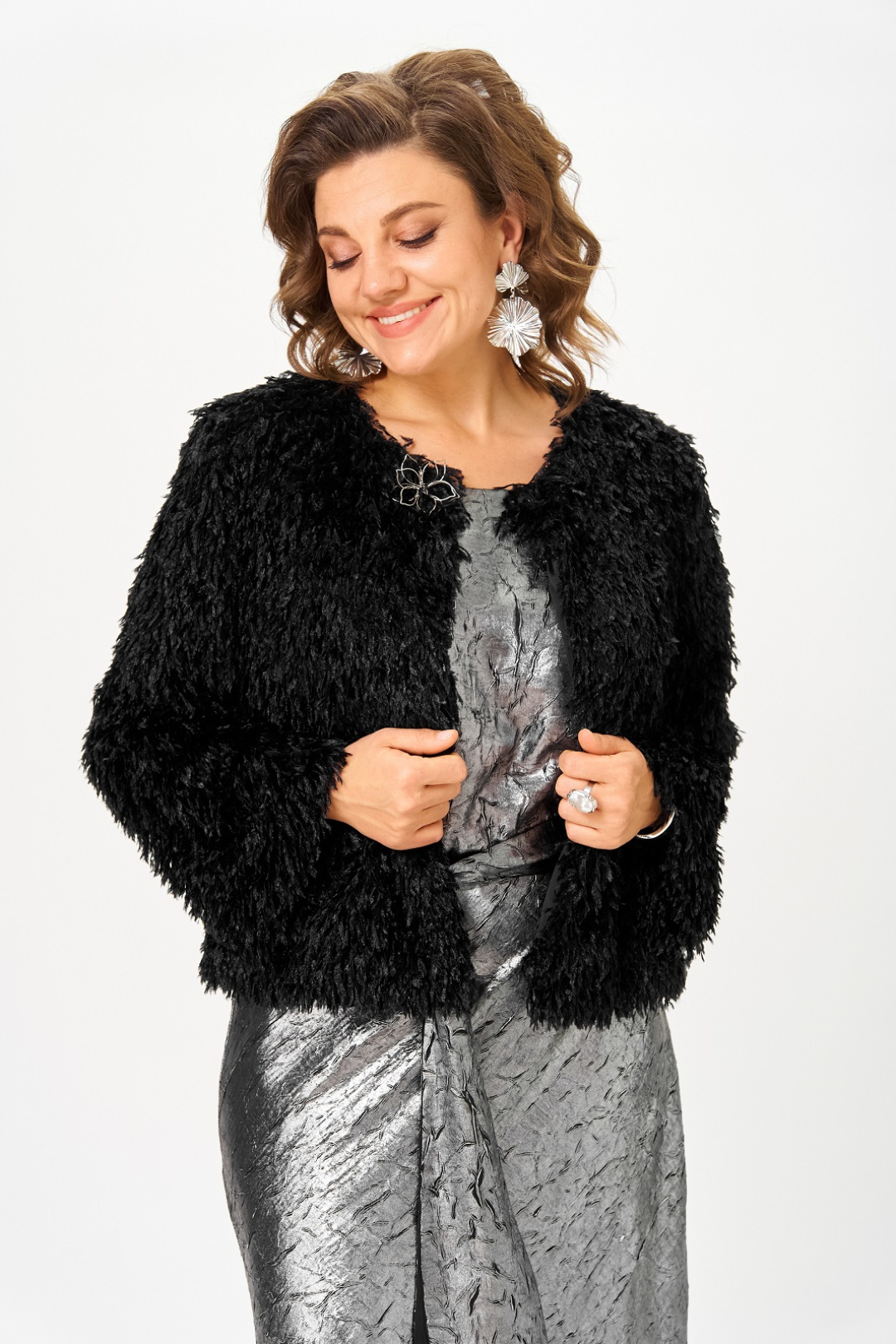 Нарядный женский комплект, состоящий из платья и жакета на подкладке. Платье из атласа с добавлением шелка, фактура ткани с эффектом "крэш". Удлиненное, отрезное по линии талии, вырез горловины круглый, рукав цельнокроенный, короткий, в боковом шве потайная молния, юбка расширена к низу, съемный пояс двухсторонний. Жакет на подкладке, из ткани с имитацией ворса, что придает особенный шик и нарядность, вырез горловины круглый с застежкой на кнопку и декоративной брошью. Рукав длинный.