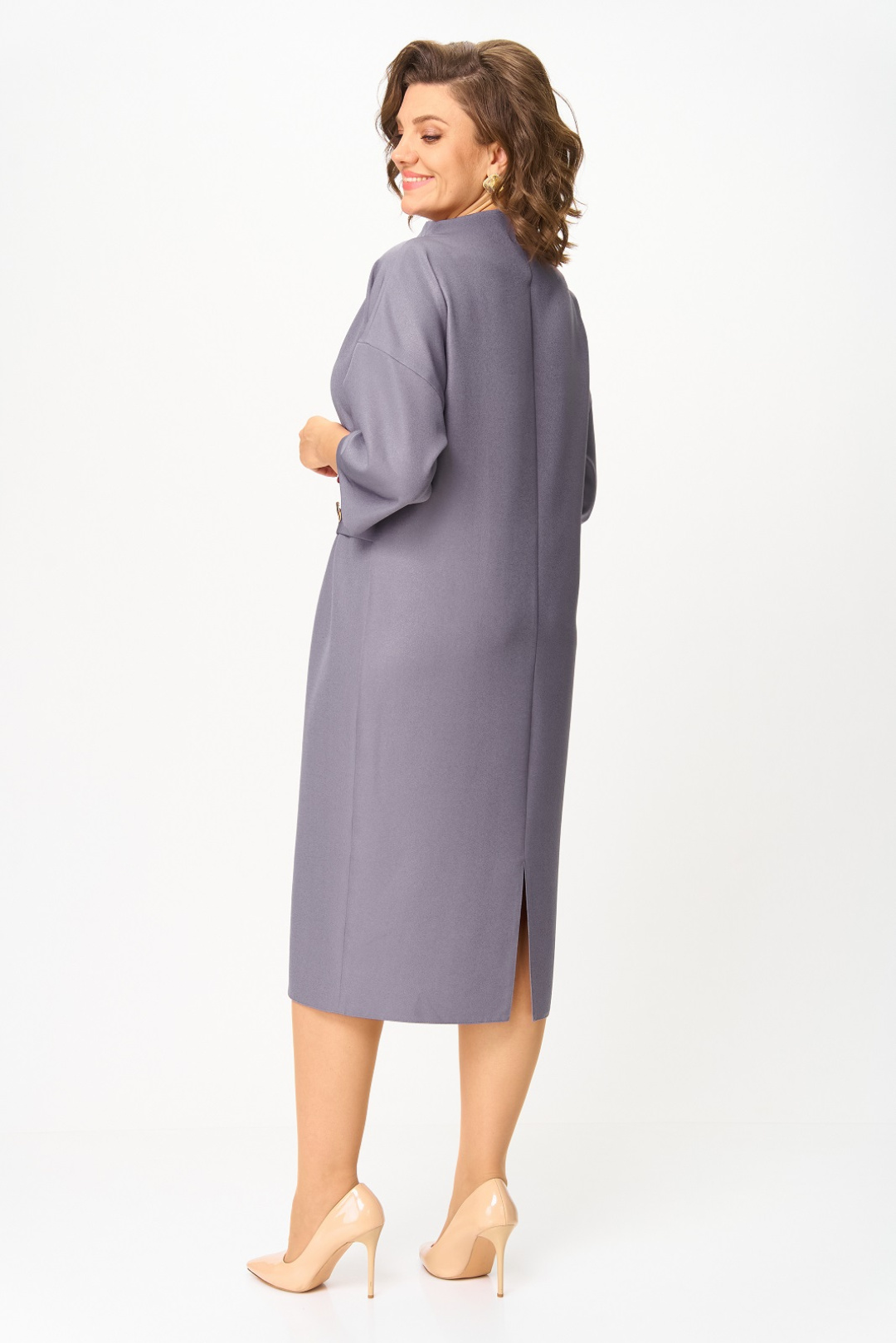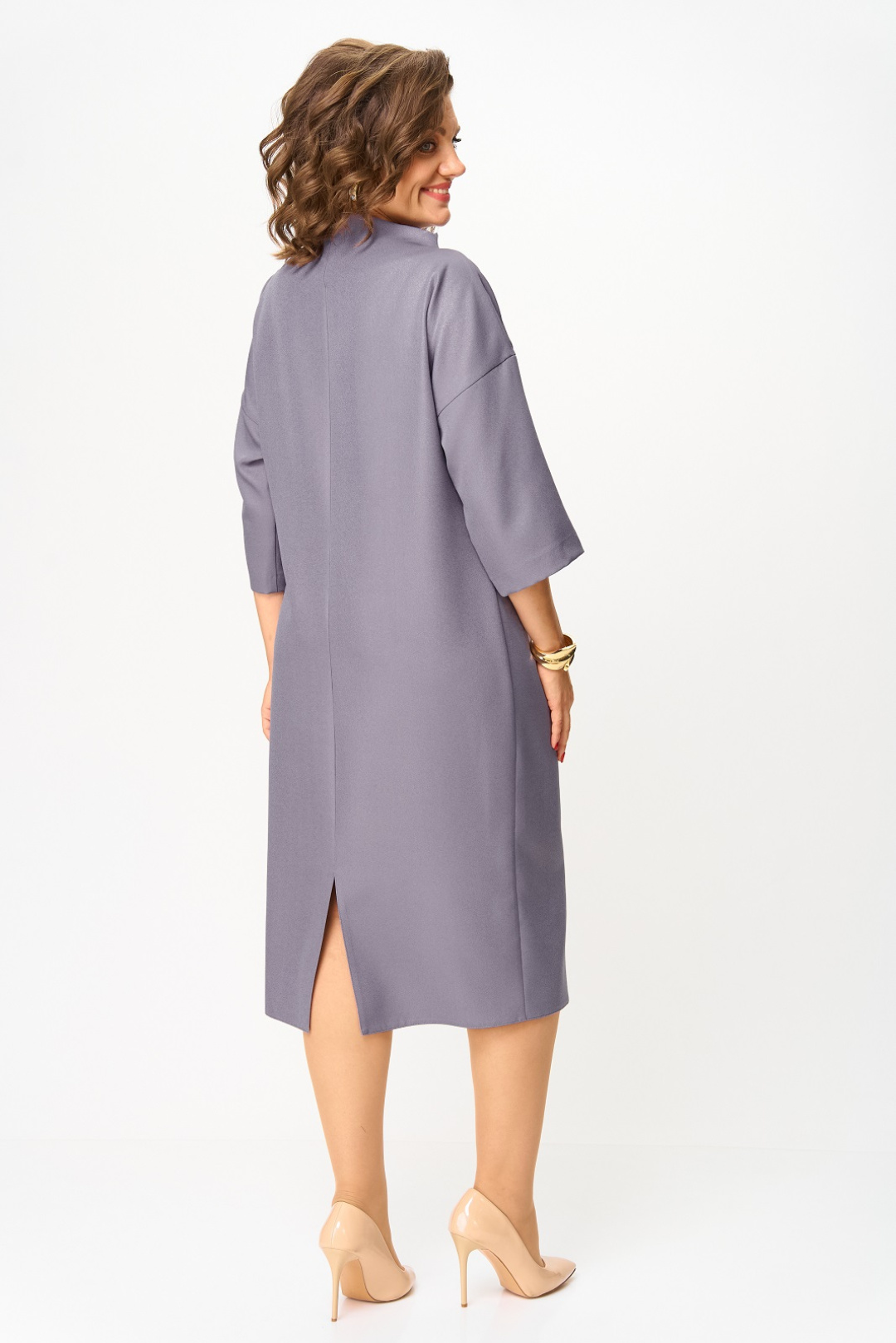 Нарядное женское платье из плательной ткани с легким блеском. Силуэт прямой, длина чуть ниже колена, с невысокой цельнокроеной стойкой. Линия плеча слегка опущена, рукав 3/4, по переду ассиметричные складки на уровне талии, с отлетной деталью в виде пояса, украшенного большими декоративными пуговицами, по спинке в среднем шве разрез.