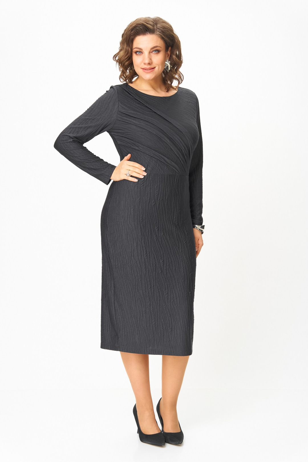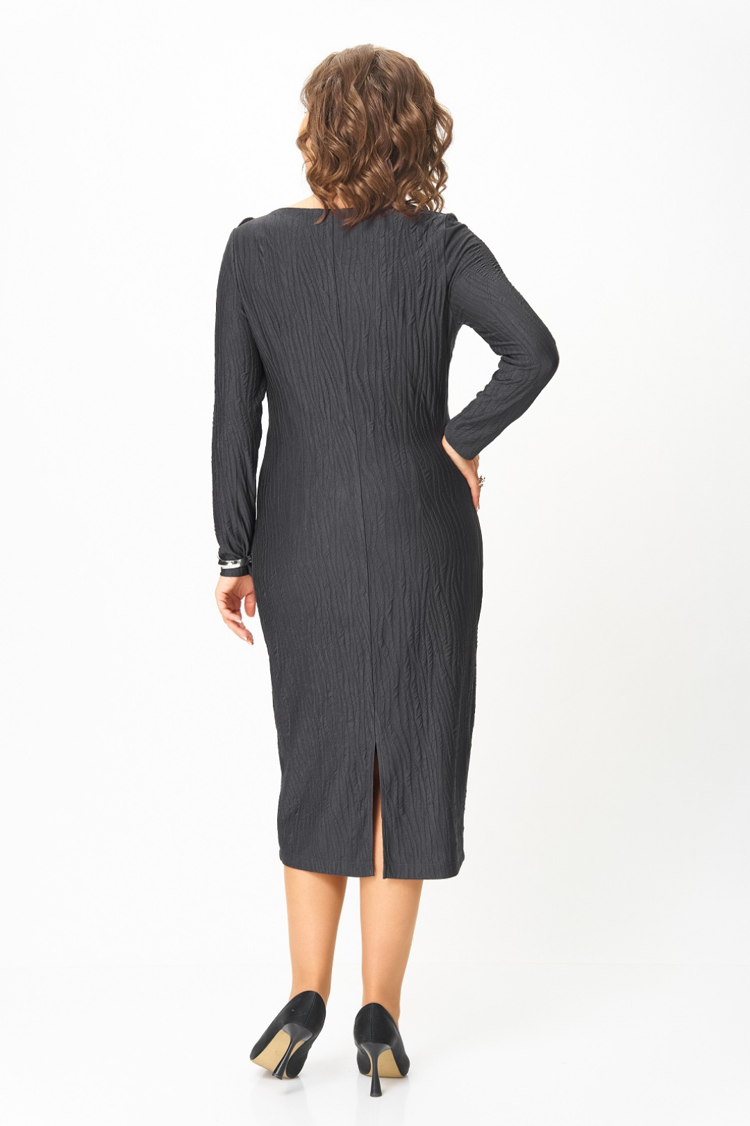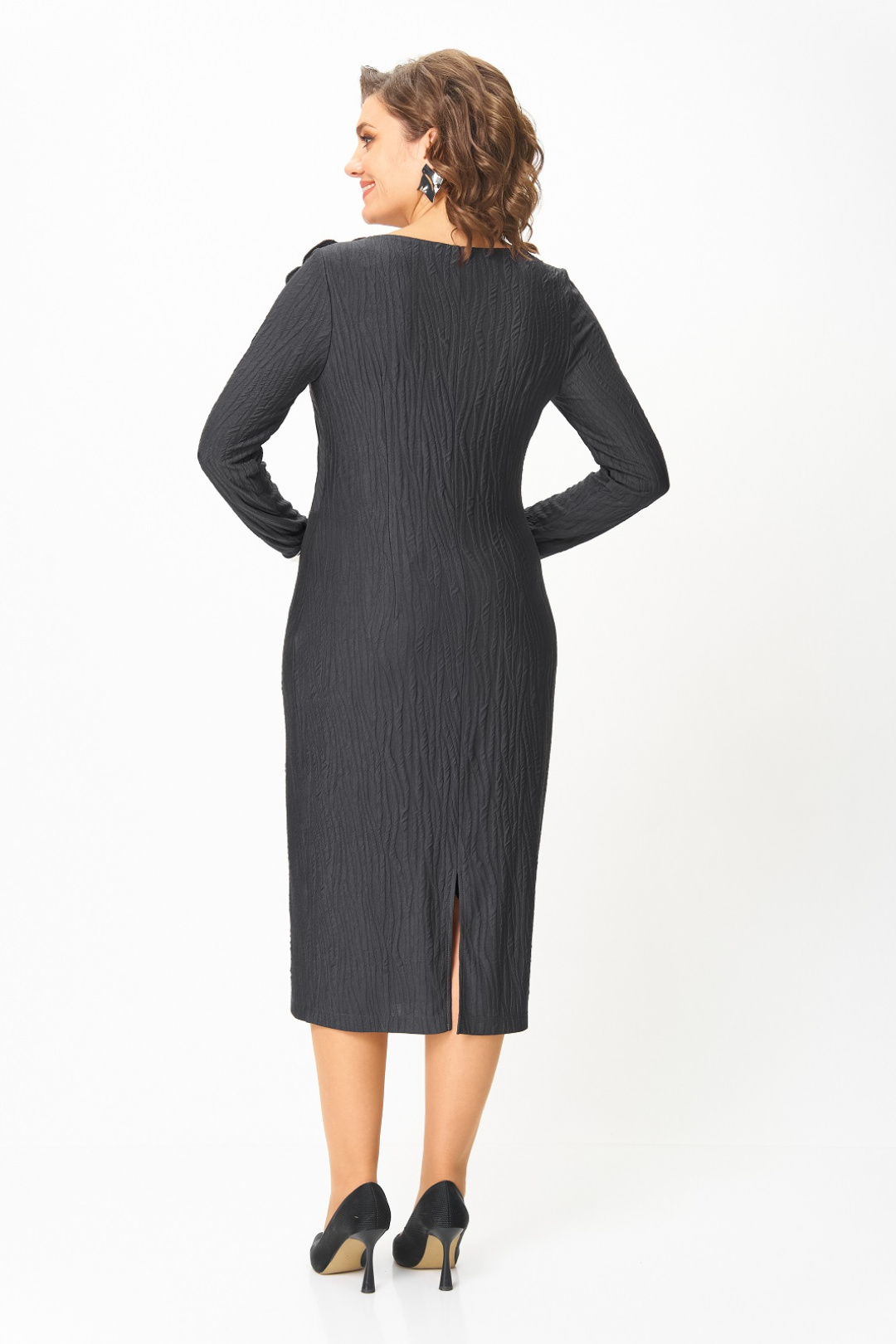 Нарядное женское платье из трикотажного полотна с добавлением вискозы, с оригинальной выпуклой фактурой с рисунком в тон. Силуэт полуприлегающий, по переду отрезное по линии талии, по лифу наклонные бантовые складки, вырез горловины круглый, рукав длинный, по спинке в среднем шве разрез. Съемный цветок украшен декоративными пуговицами-стразами.