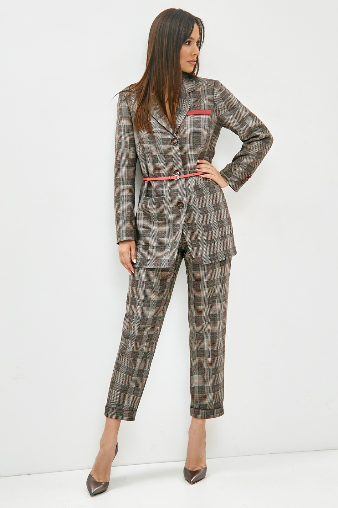 Стильный комплект, состоящий из жакета и брюк из мягкой костюмной ткани с легким стрейчем. Жакет прямого кроя, на подкладке, с центральной застежкой на пришивные пуговицы. Дополнен функциональными карманами и съемным поясом (в комплекте). Брюки классического кроя, слегка заужены к низу, с притачным поясом, с застежкой на пришивные пуговицы и молнию. Дополнены функциональными боковыми карманами.