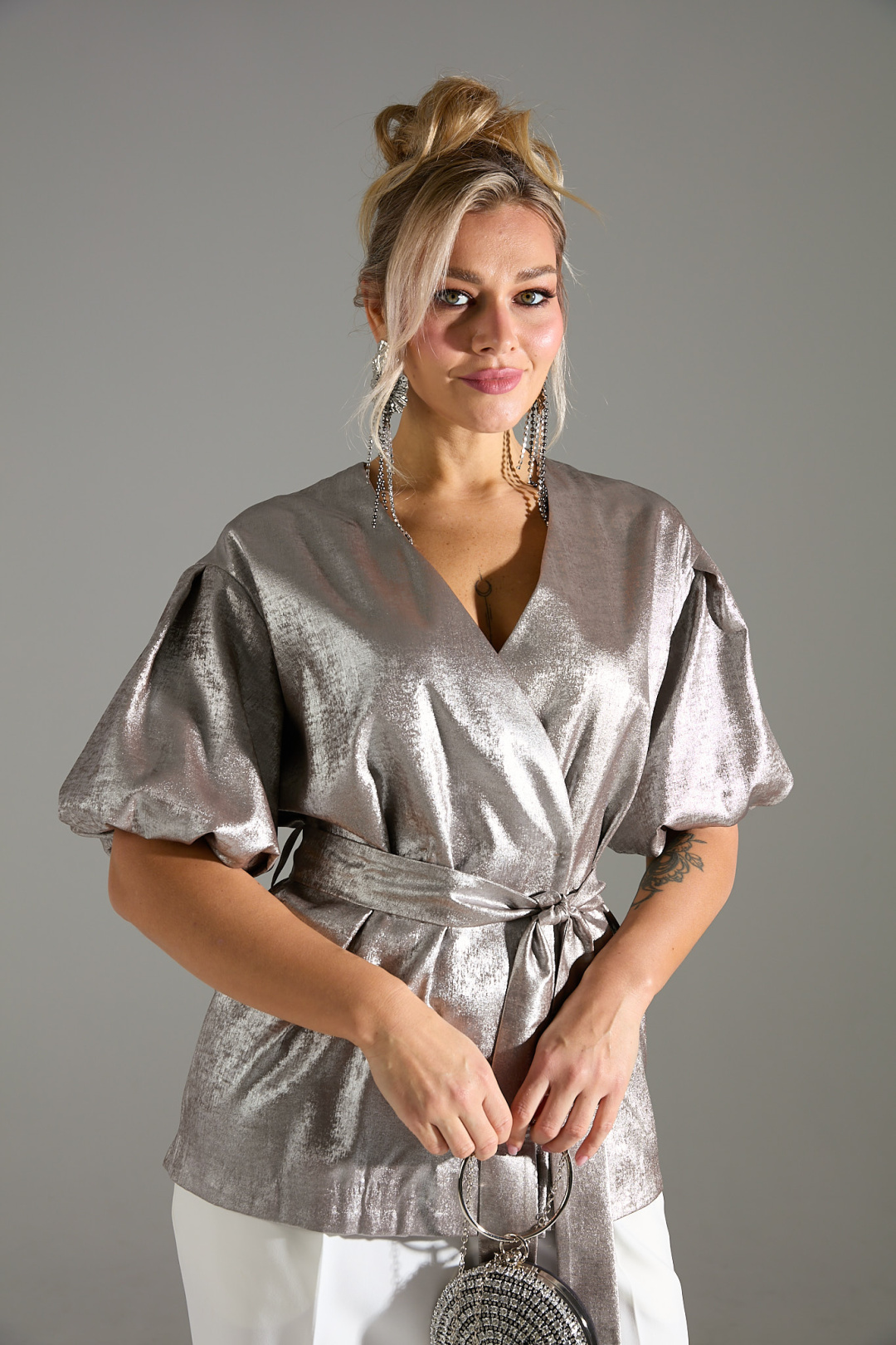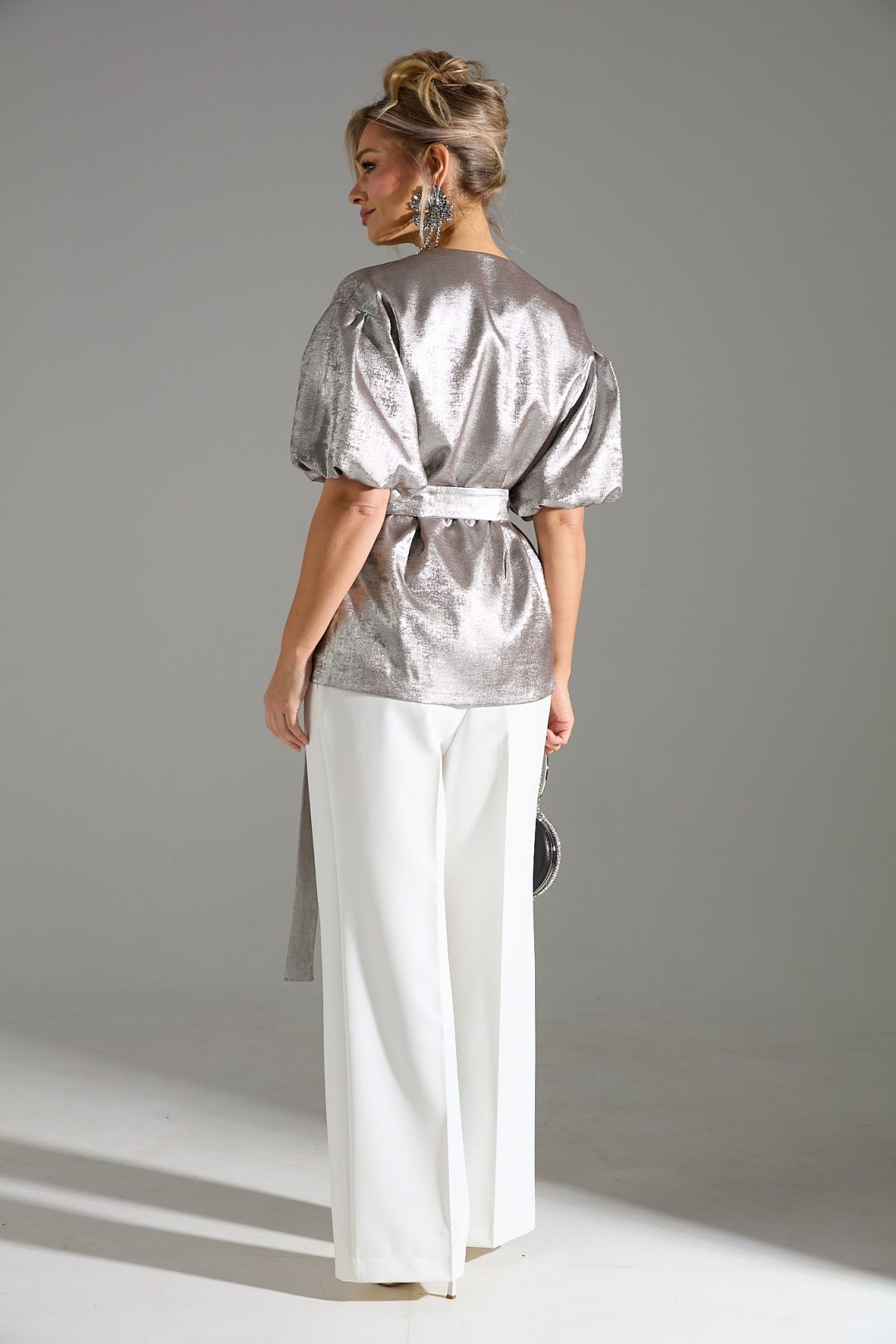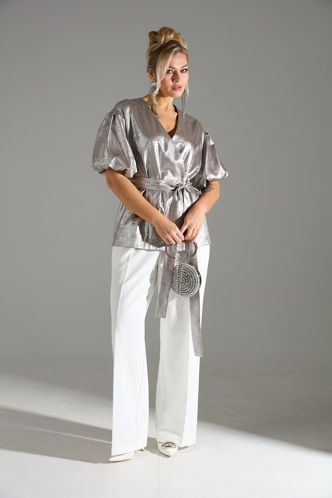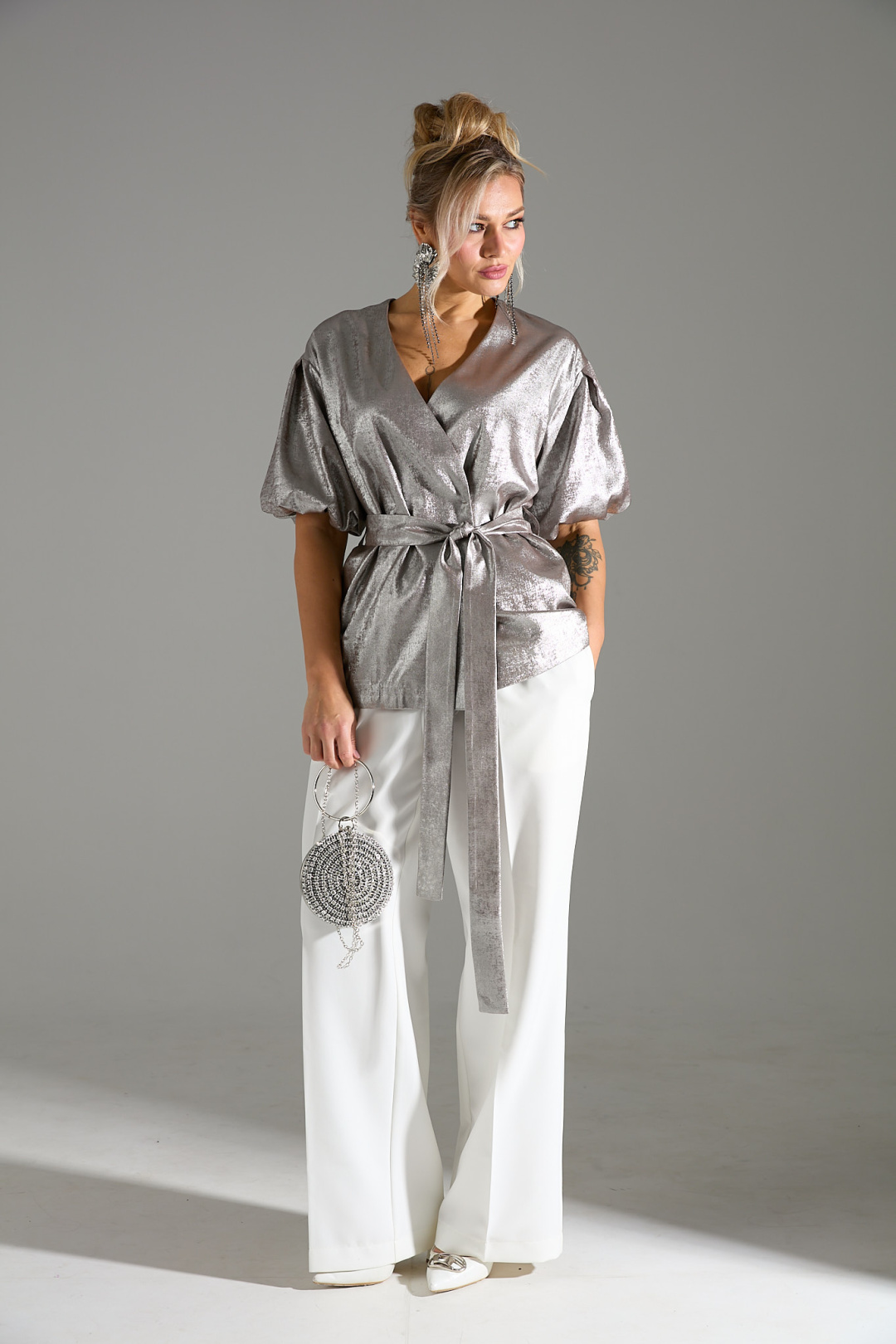 Комплект 2ка, состоящий из жакета и брюк. Легкий жакет на подкладке с объёмными рукавами. Перед на запах без застежки, под пояс по талии.