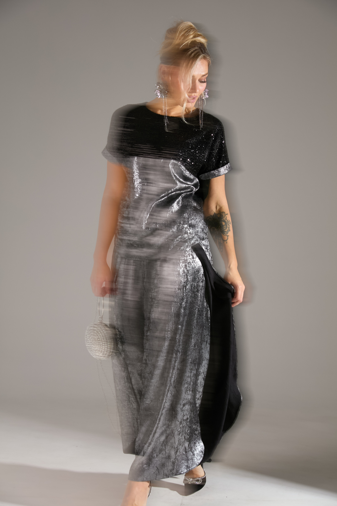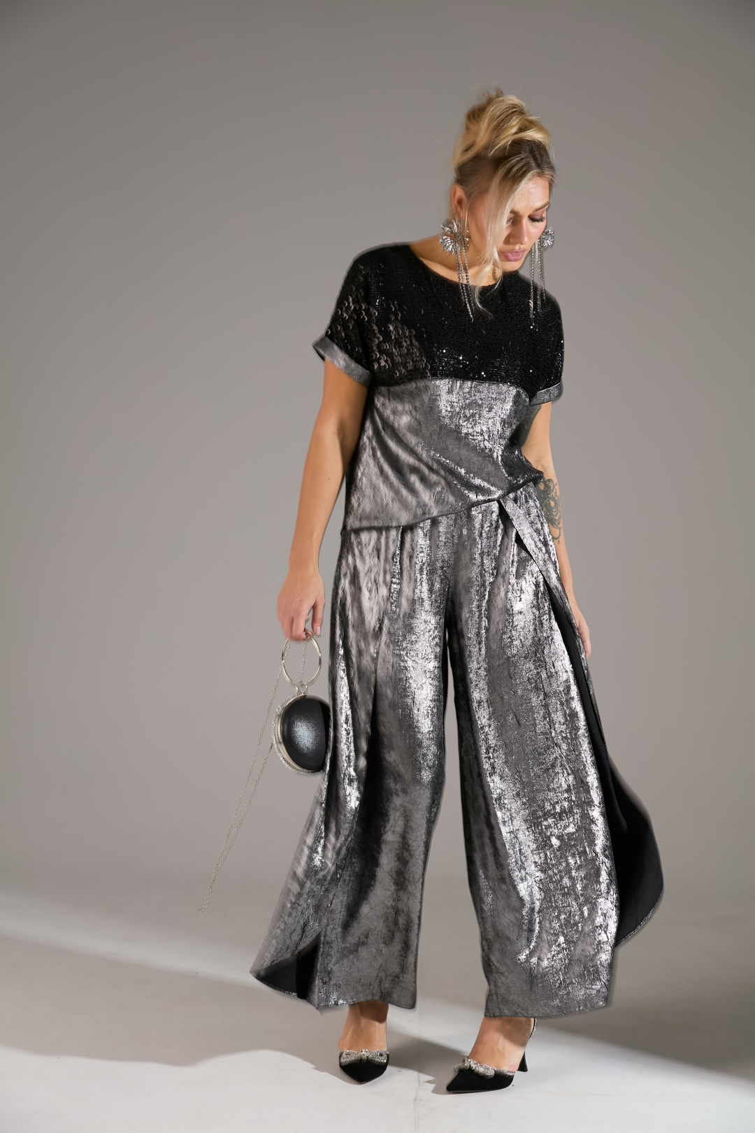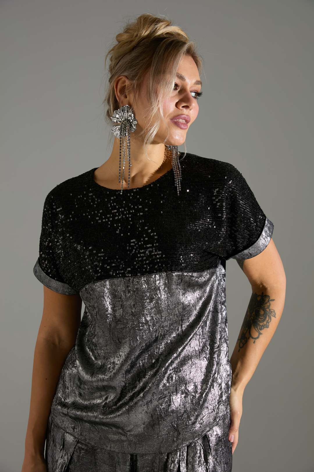 Блузка свободного объёма с короткими цельнокроеными рукавами с подворотами. Вырез горловины круглый. По переду подрез ниже линии груди. Верх блузки по переду выполнен из ткани расшитой пайетками.