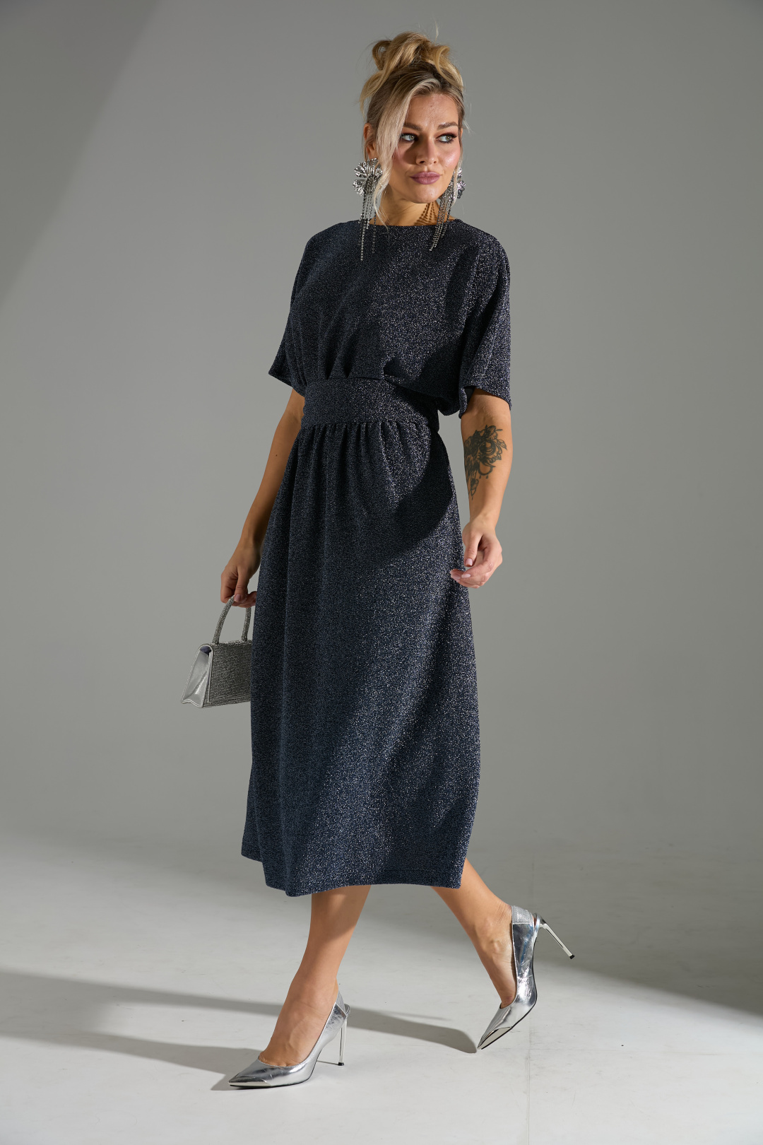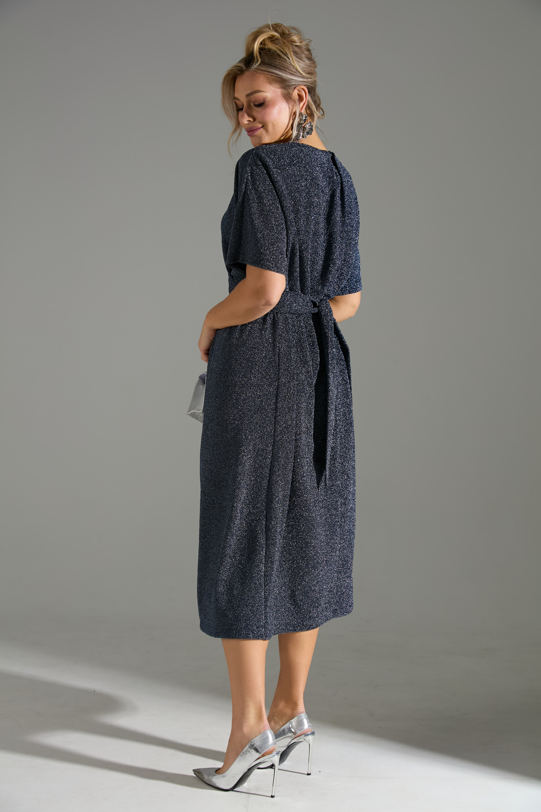 Изысканное миди-платье презентует собой идеальный выбор для элегантного вечернего или повседневного образа. Дизайн платья включает в себя свободную юбку, которая элегантно обрамляет силуэт, добавляя женственности образу. На передней части находится пришивной пояс, акцентирующий талию. Цельнокроеные рукава мягко обрамляют линию плеч и добавляют утонченности. На спинке выполнены встречные складки, а также предусмотрена практичная застежка на пуговицу в области горловины, что упрощает процесс одевания и добавляет изящества деталям. Это платье — превосходный выбор для тех, кто ценит утонченность и комфорт.