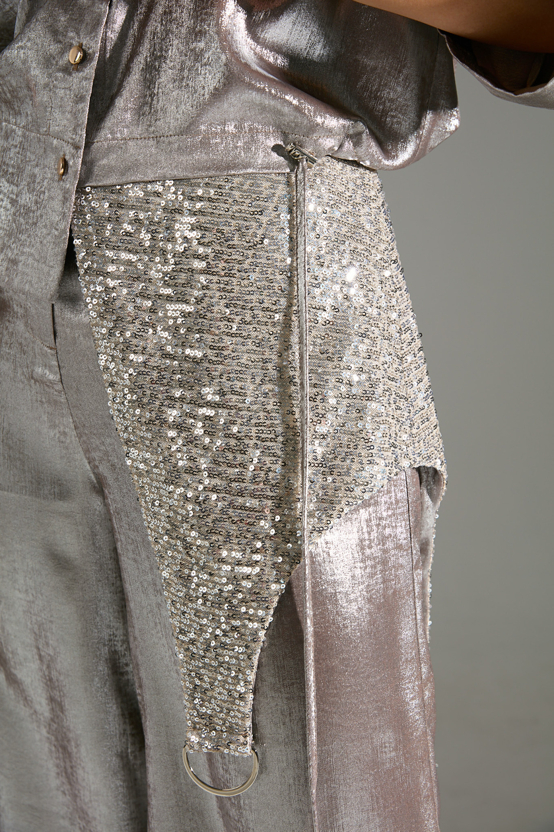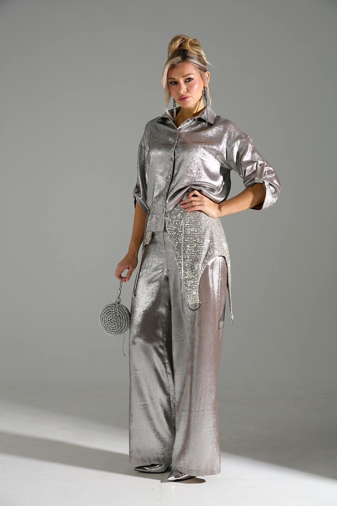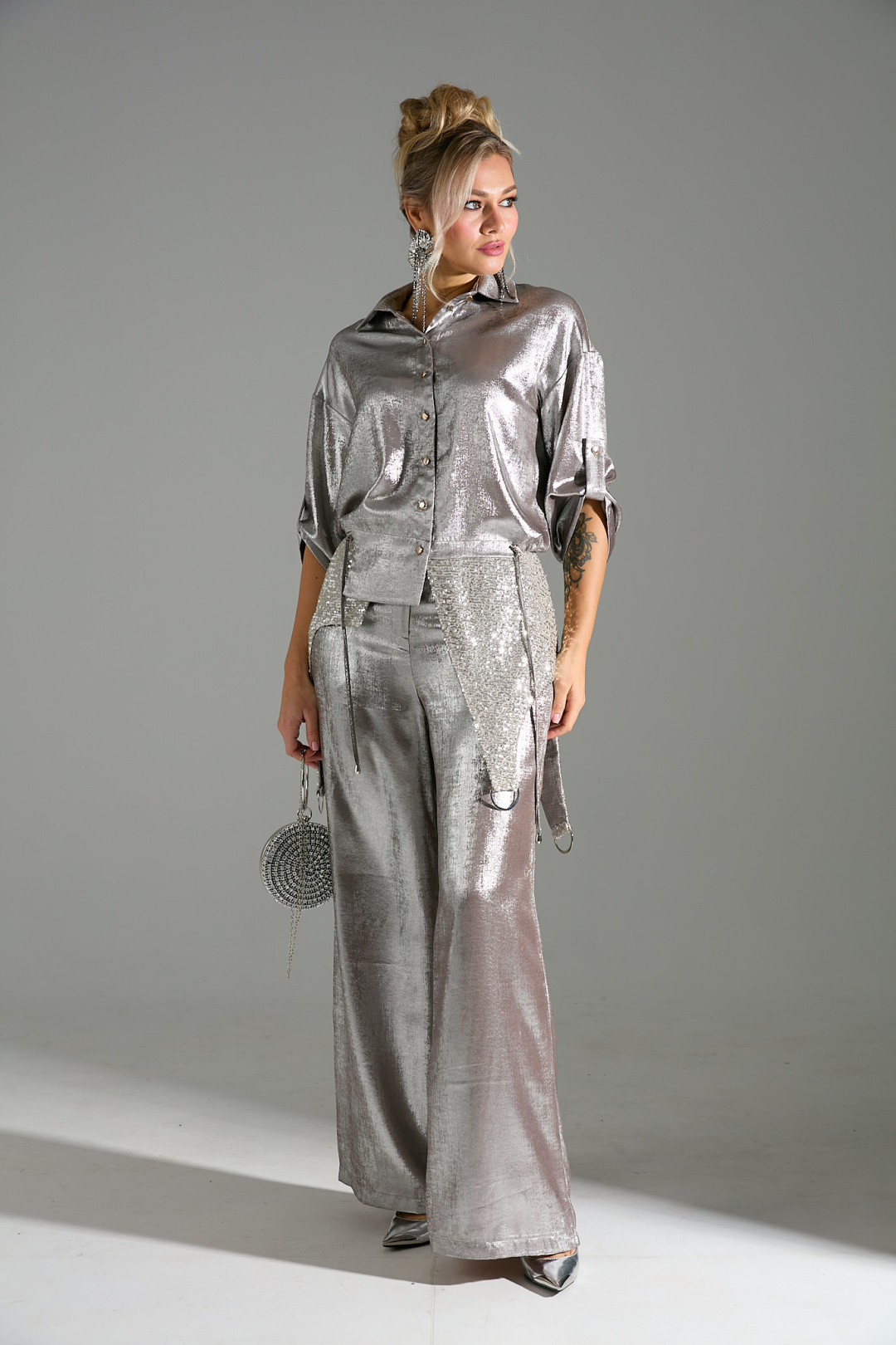 Этот стильный женский брючный костюм включает в себя рубашку и брюки. Костюм выполнен в блестящем серебристом цвете, который придает образу нарядность и элегантность. Рубашка имеет объемный силуэт, классический воротник и застежку на пуговицах, что добавляет изделию утонченности. Рукава рубашки украшены шлейками с кнопками, позволяющими регулировать их объем. Брюки широкого объемного силуэта отличаются прямым кроем, который идеально подчеркивает линию ног, создавая роскошное и современное ощущение. Такой костюм подходит как для официальных мероприятий, так и для вечерних выходов, обеспечивая комфорт и уверенность в каждом движении.