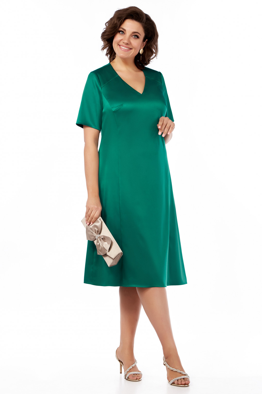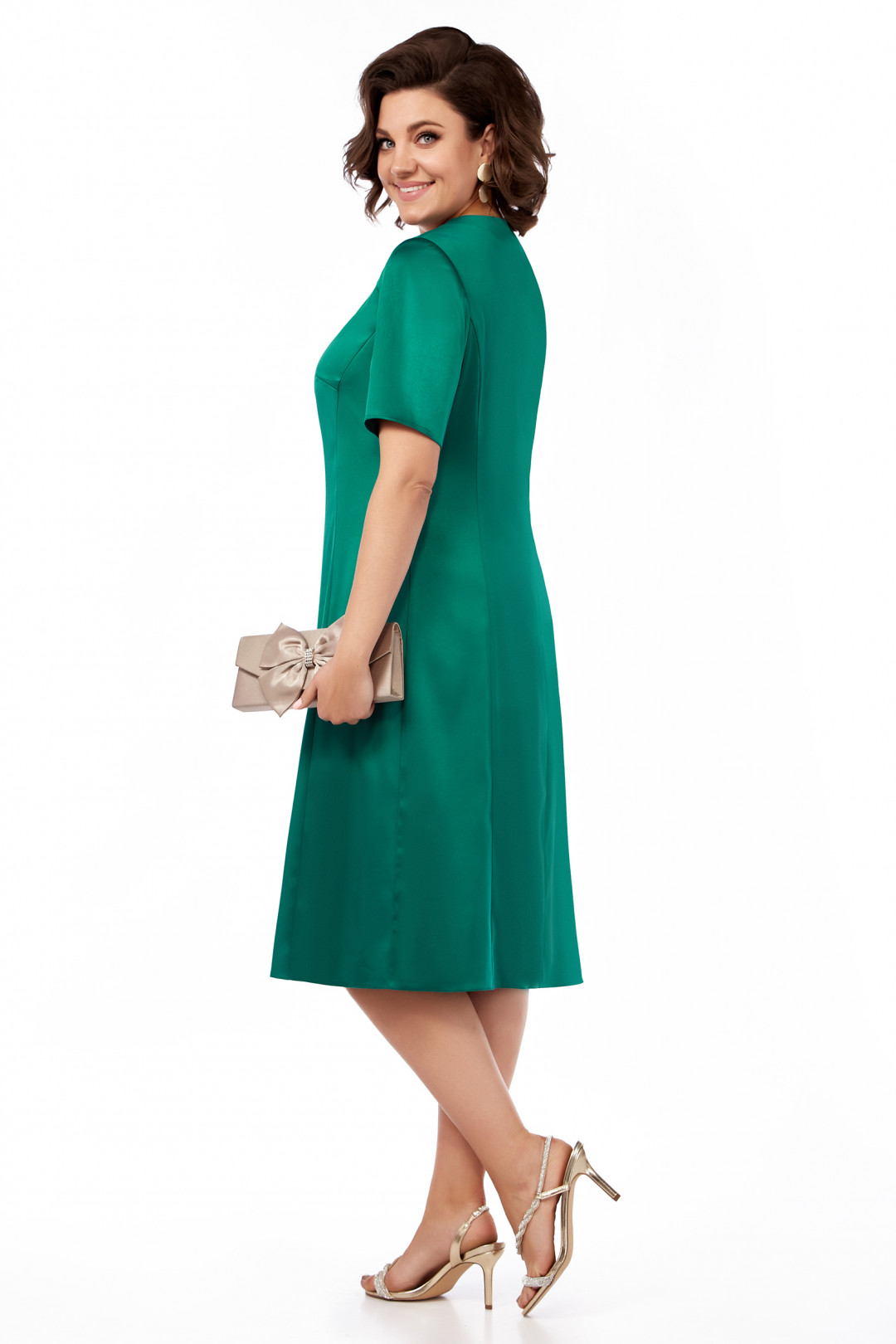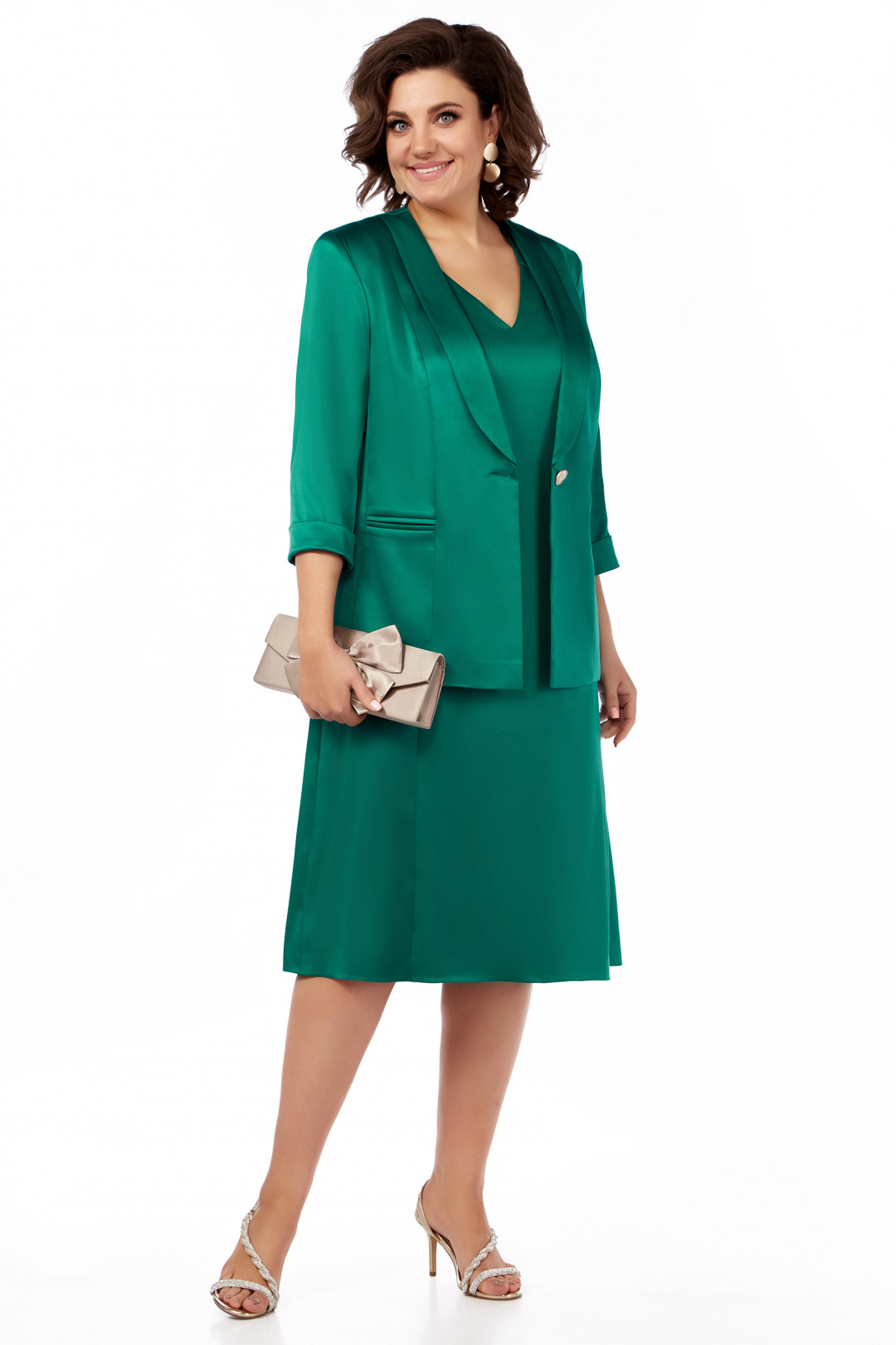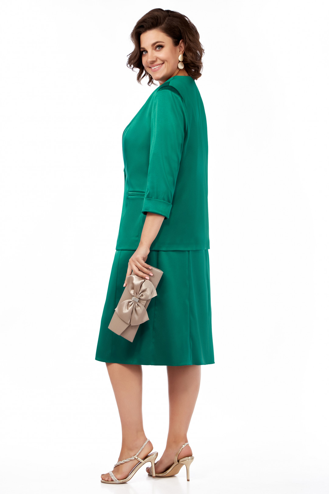 Костюм женский, состоящий из жакета и платья. Жакет прямого силуэта с центральной бортовой застежкой на одну петлю и пуговицу. Спинка жакета со средним швом, на полочках обработаны двойные рельефные швы, идущие от плеча и от пройм, между которыми обработаны карманы в рамку. Воротник «шаль», входящий в плечевые швы. Рукава втачные, двухшовные, длиной ¾, по низу рукавов отложные манжеты. Спинка и полочки жакета – на подкладке. Платье А-силуэта с V-образным вырезом горловины, длиной ниже линии колена, на подкладке. На спинке обработаны средний шов и рельефы от пройм. По переду платья – рельефные швы, идущие от пройм и нагрудные вытачки от рельефов. Рукава платья одношовные, втачные, короткие. Линия плеча в жакете и платье на естественном месте.