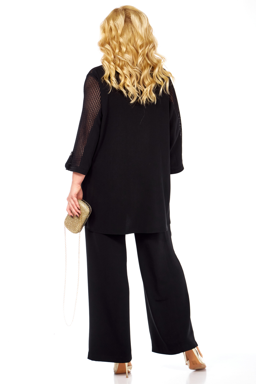 Свободная туника из пластичной струящейся ткани. Горловина V-образная, оформлена бейкой. Впереди кокетка из кружевной ткани, застежка на пуговицы. У кокеток клапаны с декоративными пуговицами. Рукав 3/4. Верхняя часть рукава выполнена из кружева. Низ оформлен бейкой с патой на пуговице. Брюки длинные, прямые, оформлены притачным поясом с широкой резинкой, у боковых швов - внутренние карманы. Универсальный ансамбль для создания элегантного образа с максимальным комфортом.