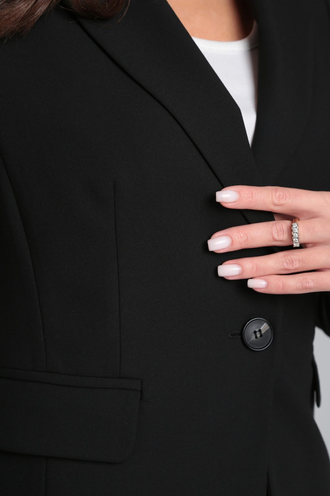Жакет женский на подкладке, полуприлегающего силуэта. По переду функциональные карманы в рамку с клапаном. Спинка со средним швом и рельефами из проймы. Воротник пиджачного типа с закругленными бортами, застежка на одну пуговицу и петлю. Рукава двухшовные длинный.