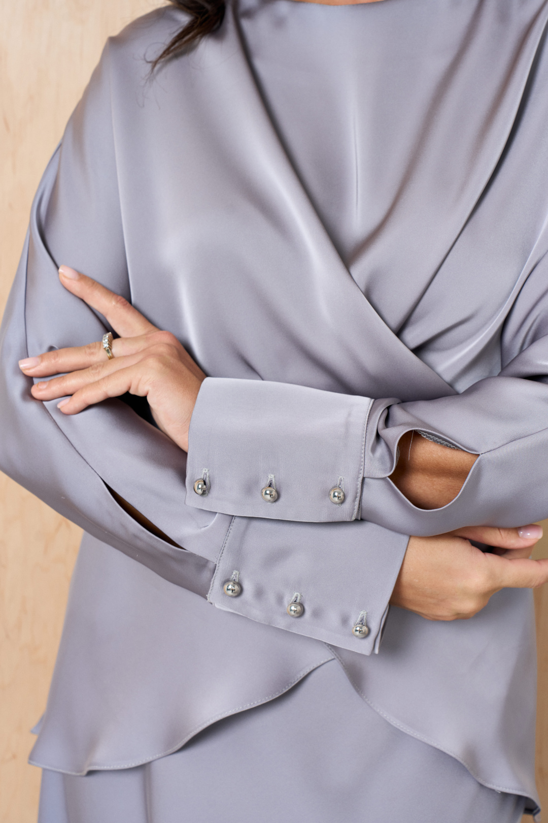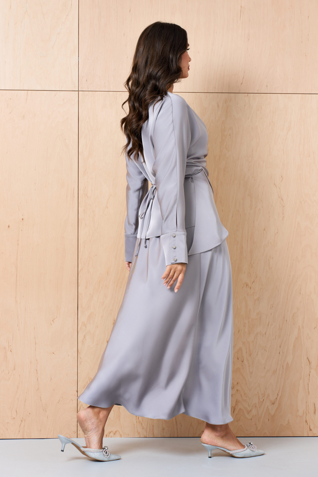 Элегантный женский костюм серого цвета, состоящий из блузы и юбки, выполнен в сдержанном, но изысканном стиле. Блуза обладает цельнокроеными рукавами с манжетами, украшенными пуговицами. Отличительной деталью является фигурный низ блузы, добавляющий изящество образу. Изделие дополнено разрезами по боковым швам, а также элегантными завязками на спинке, подчеркивающими силуэт. Юбка дополняет ансамбль, имея сдержанную длину, оформлена на обтачке и оснащена удобной застежкой на молнию по боковому шву. Этот костюм идеально подойдет для офисных встреч или торжественных мероприятий, подчеркивая женственность и элегантность образа.