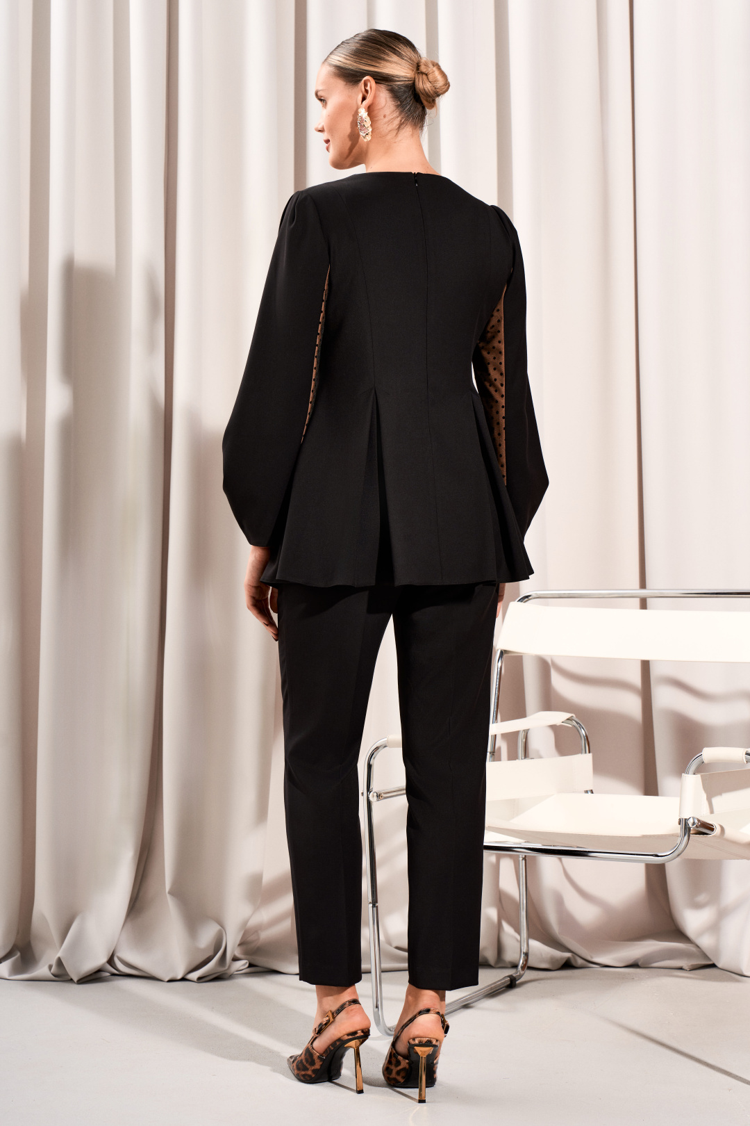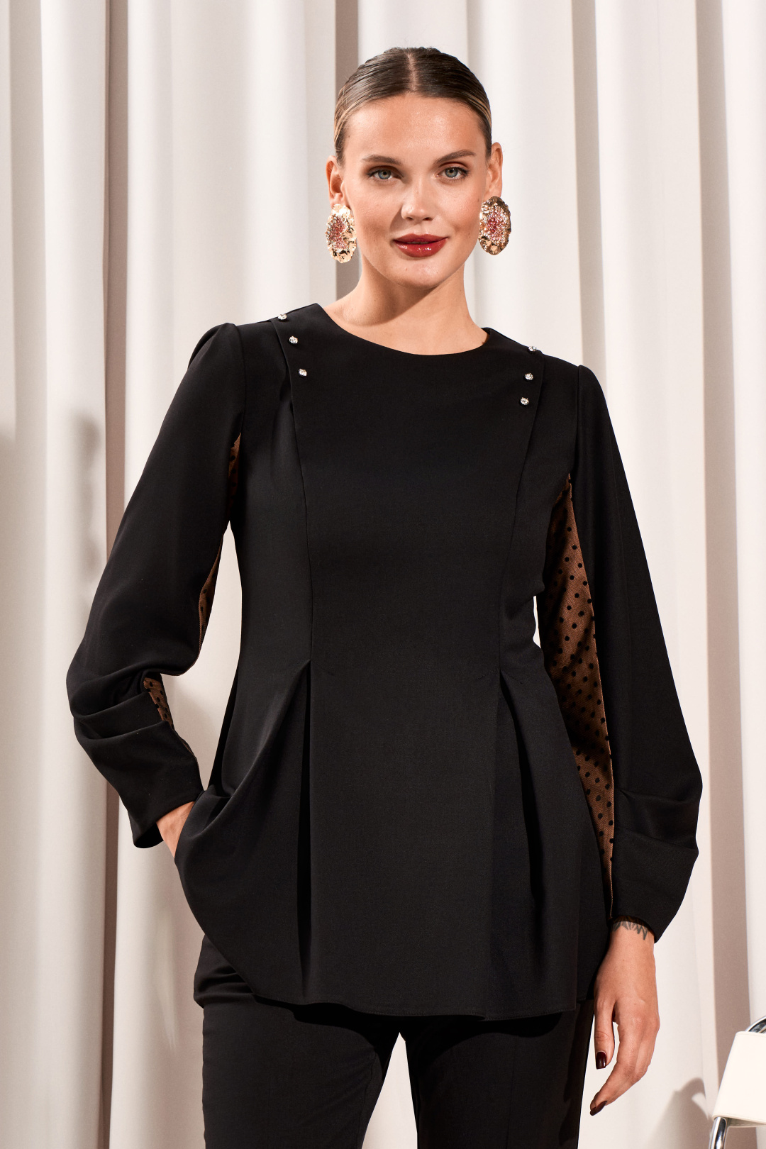 Свитшот с округлым вырезом горловины и складками от рельефов по переду и спинке. Перед со стразами в верхней части. Спинка с потайной молнией в среднем шве. Рукава втачные со складками по окату и со складками нижней части рукава, и с деталью из декоративной сетки и подложки.
