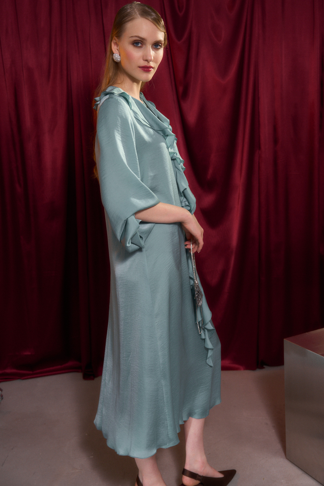 Платье свободного кроя, А силуэта. Рукав втачной на манжете. В Y-образный вырез горловины вшиты воланы. По горловине застежка на завязку.