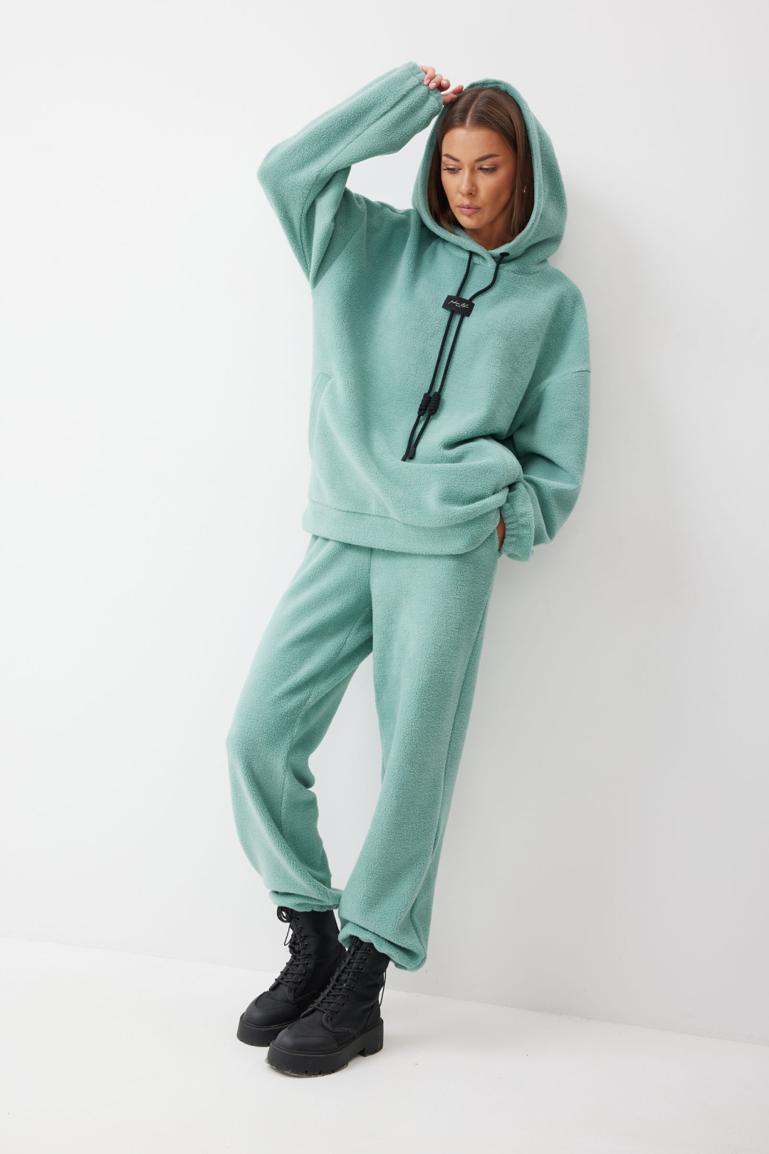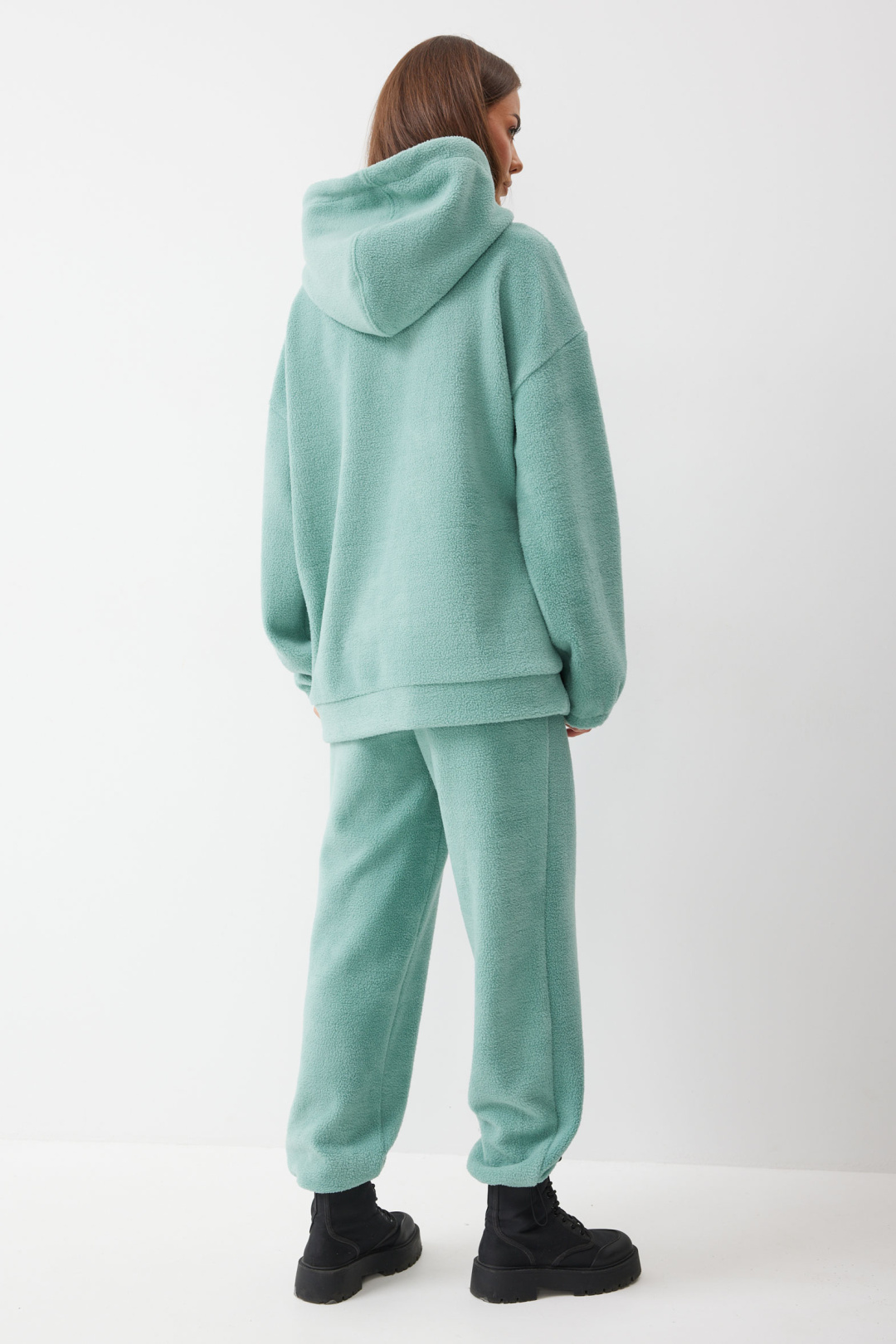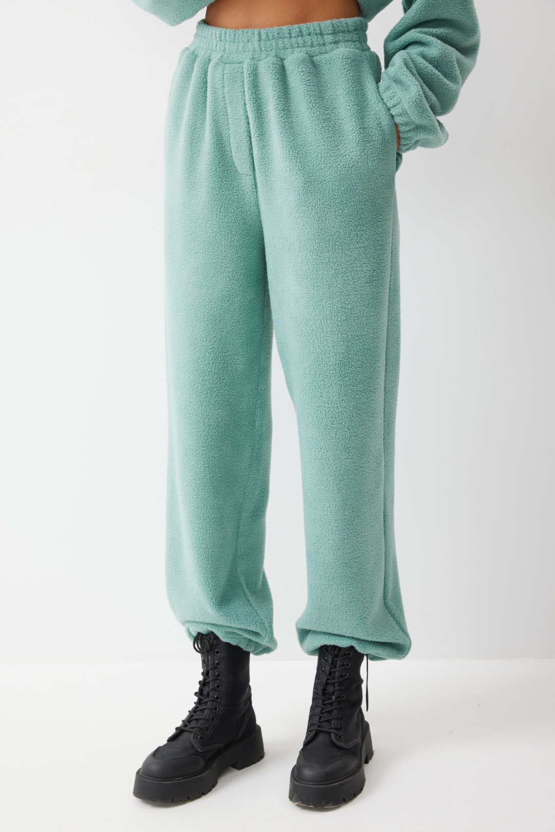 Брюки прямого силуэта из комфортного трикотажного полотна. По верху брюк притачной пояс на резинке. На передних половинках брюк обработаны карманы. Ширина брюк по низу регулируется за счет эластичной тесьмы и фиксаторов.