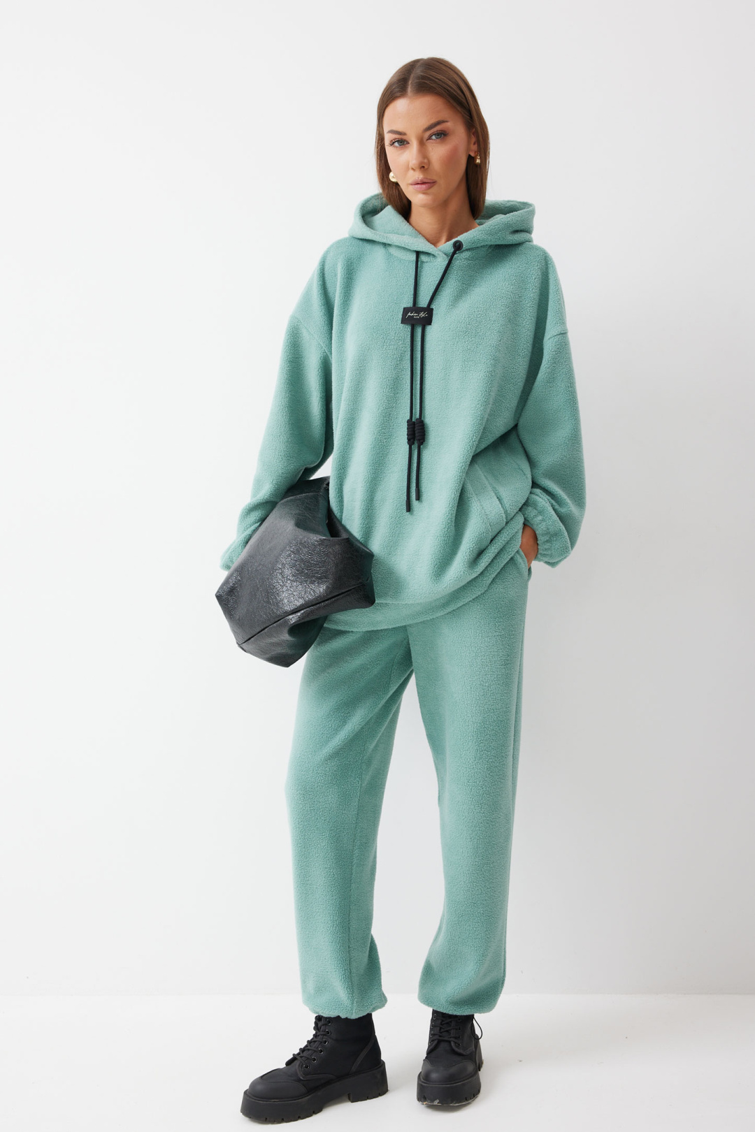 Джемпер прямого силуэта из комфортного трикотажного полотна. Горловина обработана капюшоном. Рукав со спущенной линией плеча, по низу на резинке. По низу джемпера притачной пояс. По переду декоративная нашивка и шнур.