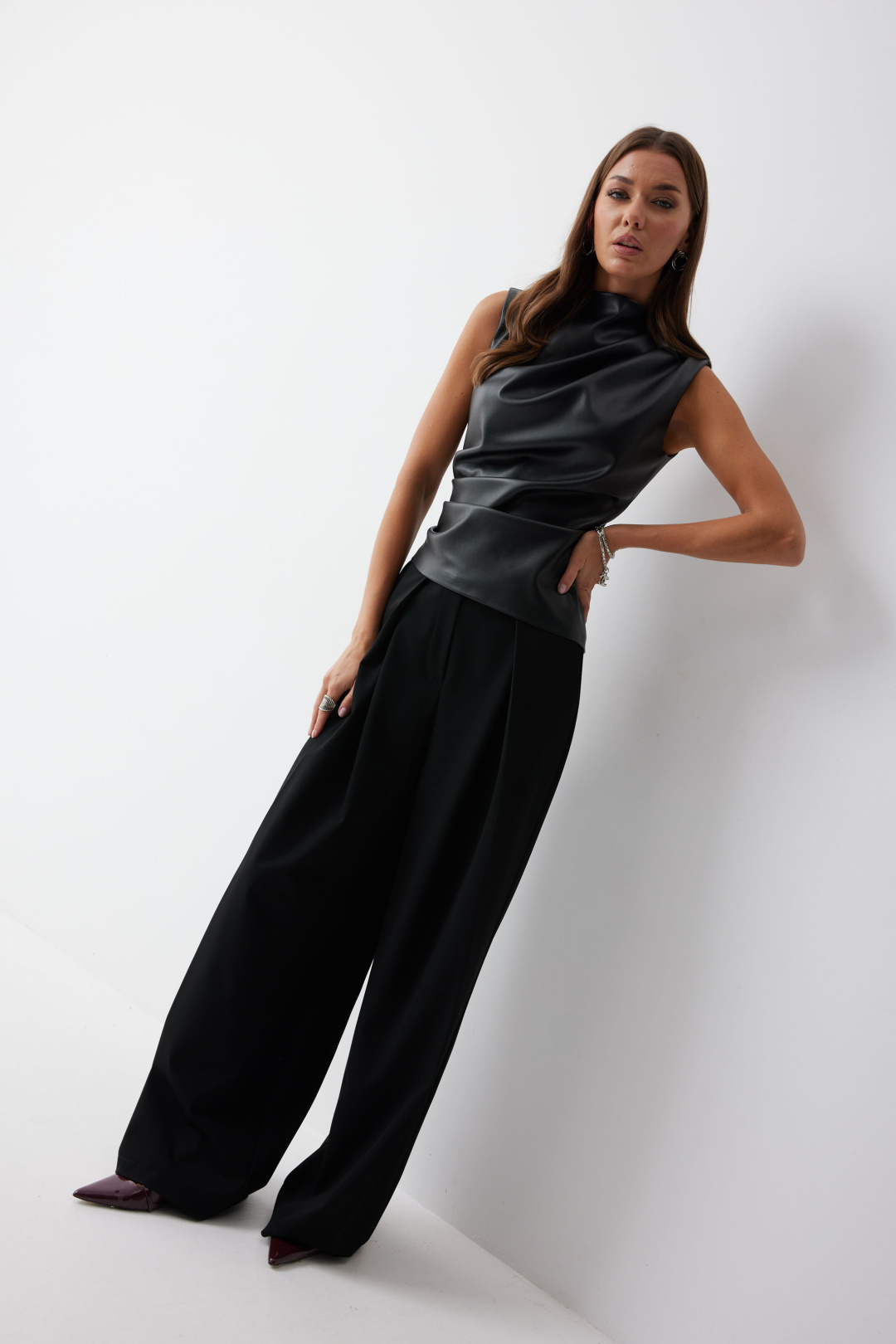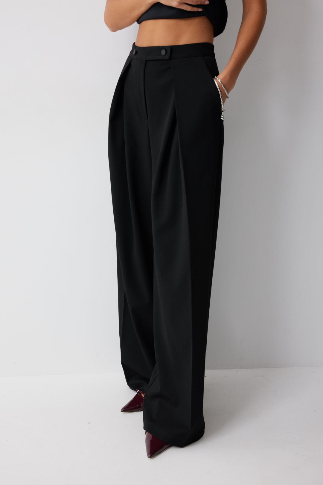 Брюки прямого силуэта расширенные книзу из костюмной ткани. По верху брюк притачной пояс с застежкой на петли и пуговицы. На передних половинках обработана застежка молния в среднем шве. На передних половинках карманы и декоративные складки. По поясу задних половинок брюк резинка и вытачки. Обращаем ваше внимание, что фурнитура может отличаться от фото.