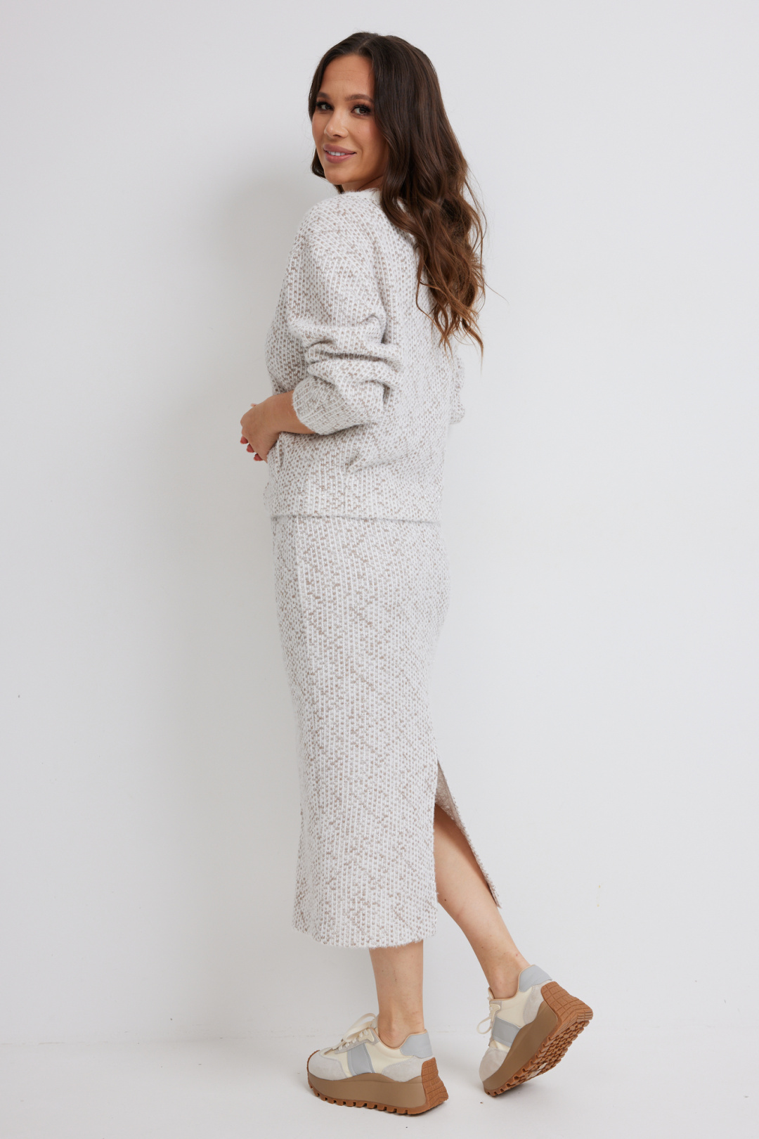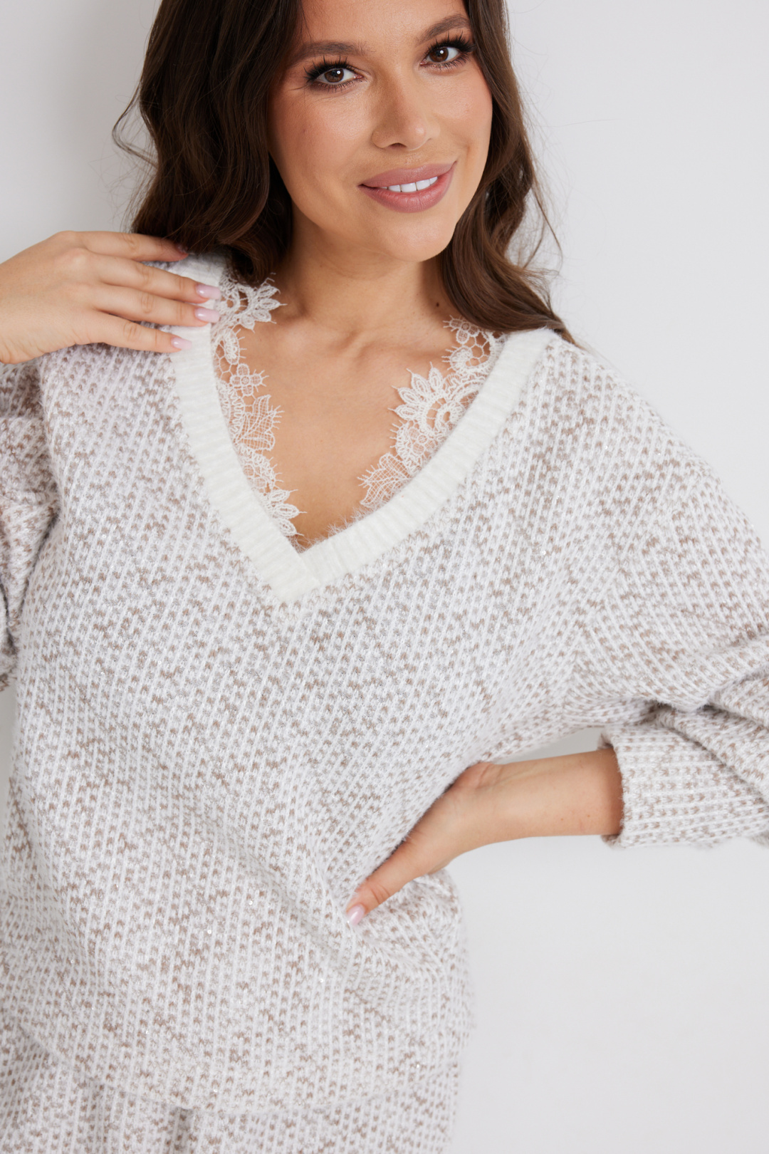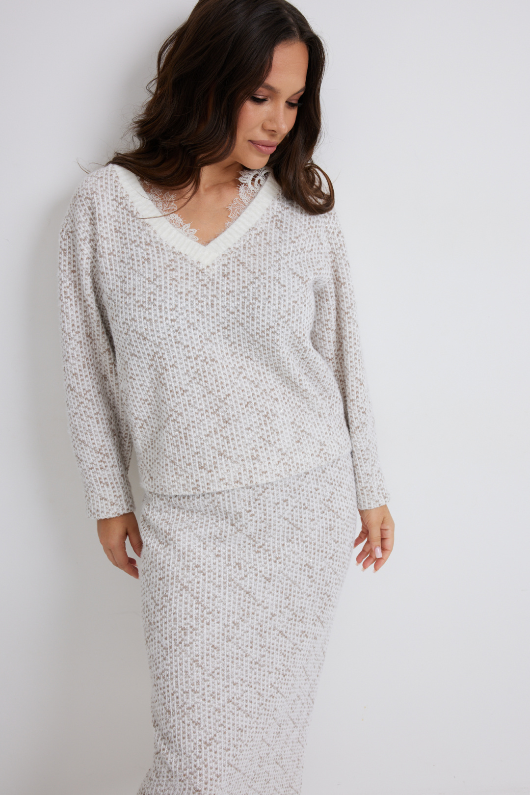 Элегантный и нежный комплект из джемпера и юбки, выполненных из вязаного, слегка пушистого трикотажного полотна с россыпью мелких , слегка мерцающих пришивных пайеток. Джемпер свободного кроя со спущенной линией плеча. Горловина с V- образным вырезом, дополненным нежным кружевом. Юбка прямого классического кроя с притачным поясом, дополненным эластичной тесьмой. Юбка на комфортной трикотажной подкладке. Длина джемпера от плечевого шва 64см. Длина рукава 60см. Длина юбки по боковому шву 79см.