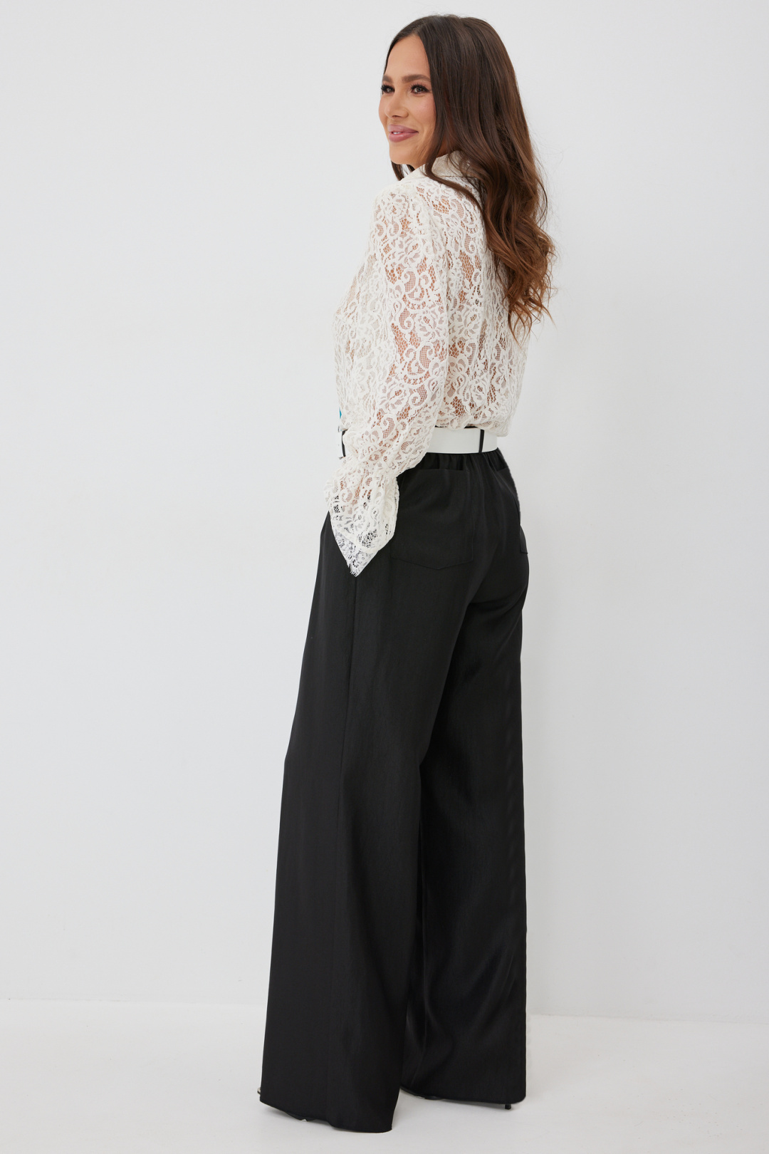 Стильный готовый образ с невероятным сочетанием кружевной блузы в нежном карамельном оттенке с шикарными брюками в красивом молочном цвете. Блуза прямого кроя с нагрудными вытачками. Рукав втачной, по низу присборен на эластичную тесьму и дополнен притачной кружевной манжетой. Застежка центральная на пришивные пуговицы. Воротник отложной на стойке. Блуза выполнена из красивого нежного бархатного кружева премиум качества. Брюки классического прямого кроя. Посадка средняя. Пояс притачной, дополнен эластичной тесьмой. Брюки дополнены удобными боковыми и задними карманами. Застежка гульфик на молнию и пуговицу. Выполнены из красивой гладкой костюмной ткани с жемчужным отливом. Красивый пояс в комплекте. Длина блузы от плечевого шва 67см. Длина рукава 69 см. Длина брюк по боковому шву 107 см.