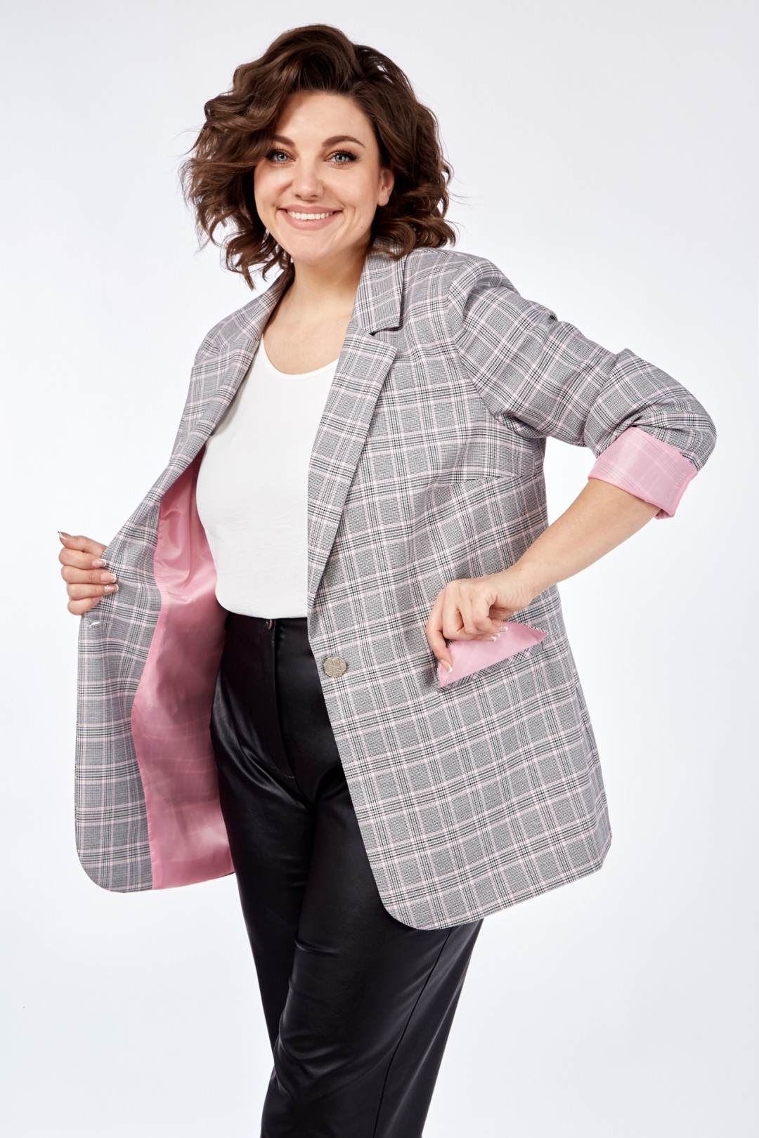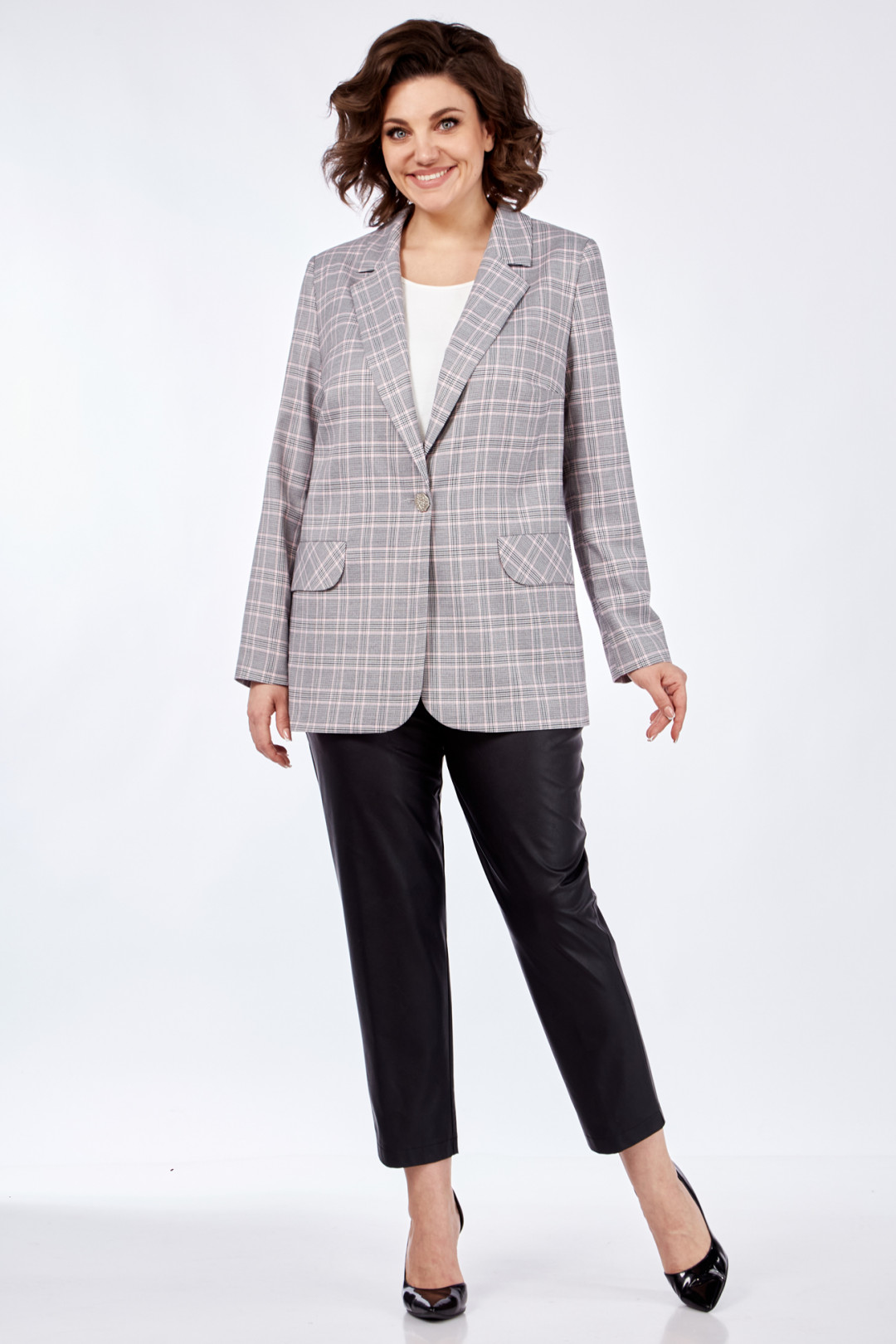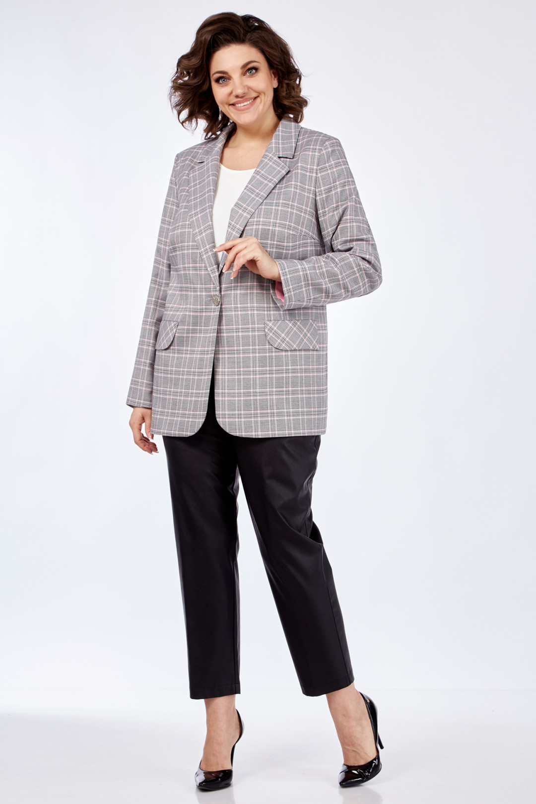 Жакет прямого силуэта, на подкладке с центральной застежкой на петли-пуговицы. По переду на уровне талии выполнены прорезные карманы с листочкой. Рукав втачной, двухшовный с цельнокроеной манжетой.