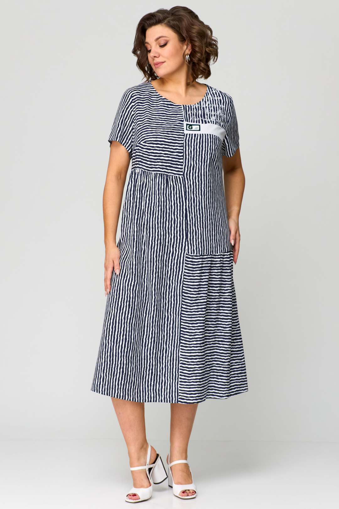 Платье свободного покроя с асимметричными горизонтальными подрезами и кокеткой. Кокетка декорирована печатью и нашивным элементом. Спинка с кокеткой. Рукав втачной одношовный короткий. Длина платья 115 см, длина рукава 22 см. Декоративная нашивка может отлечаться от фото.