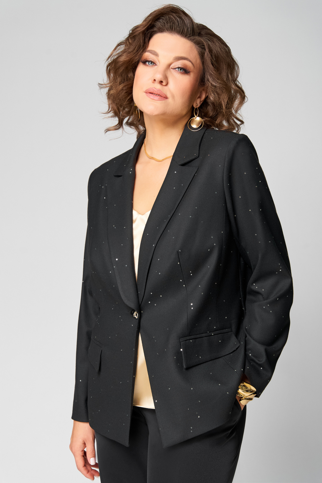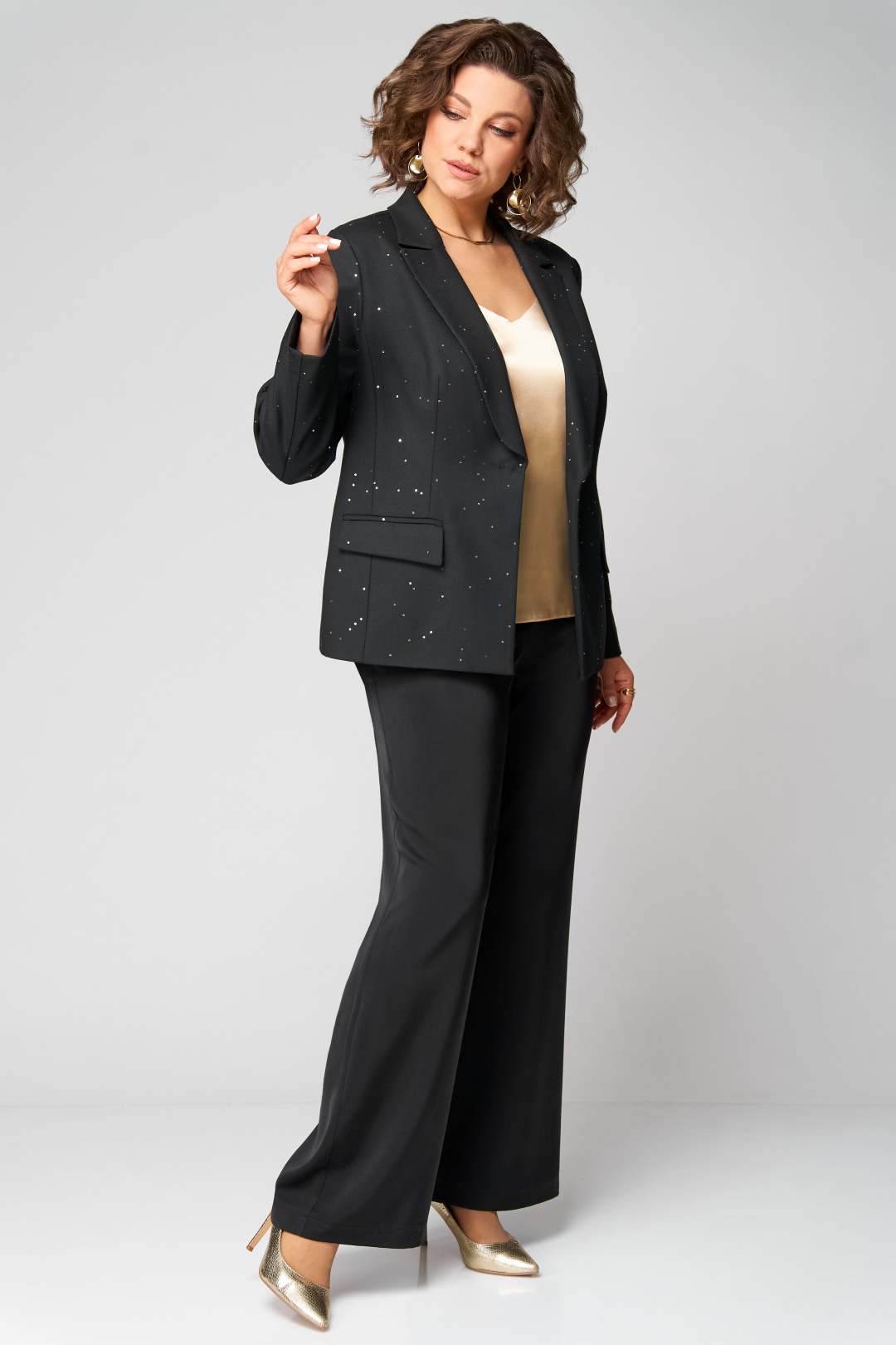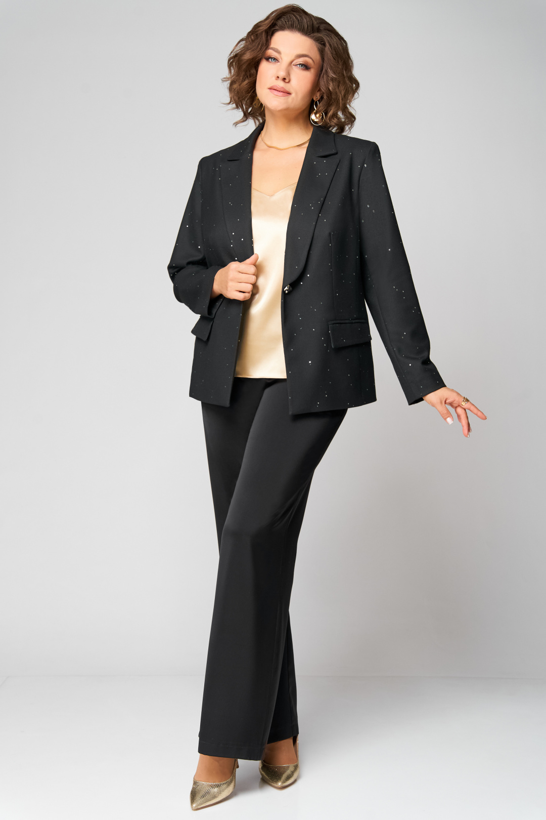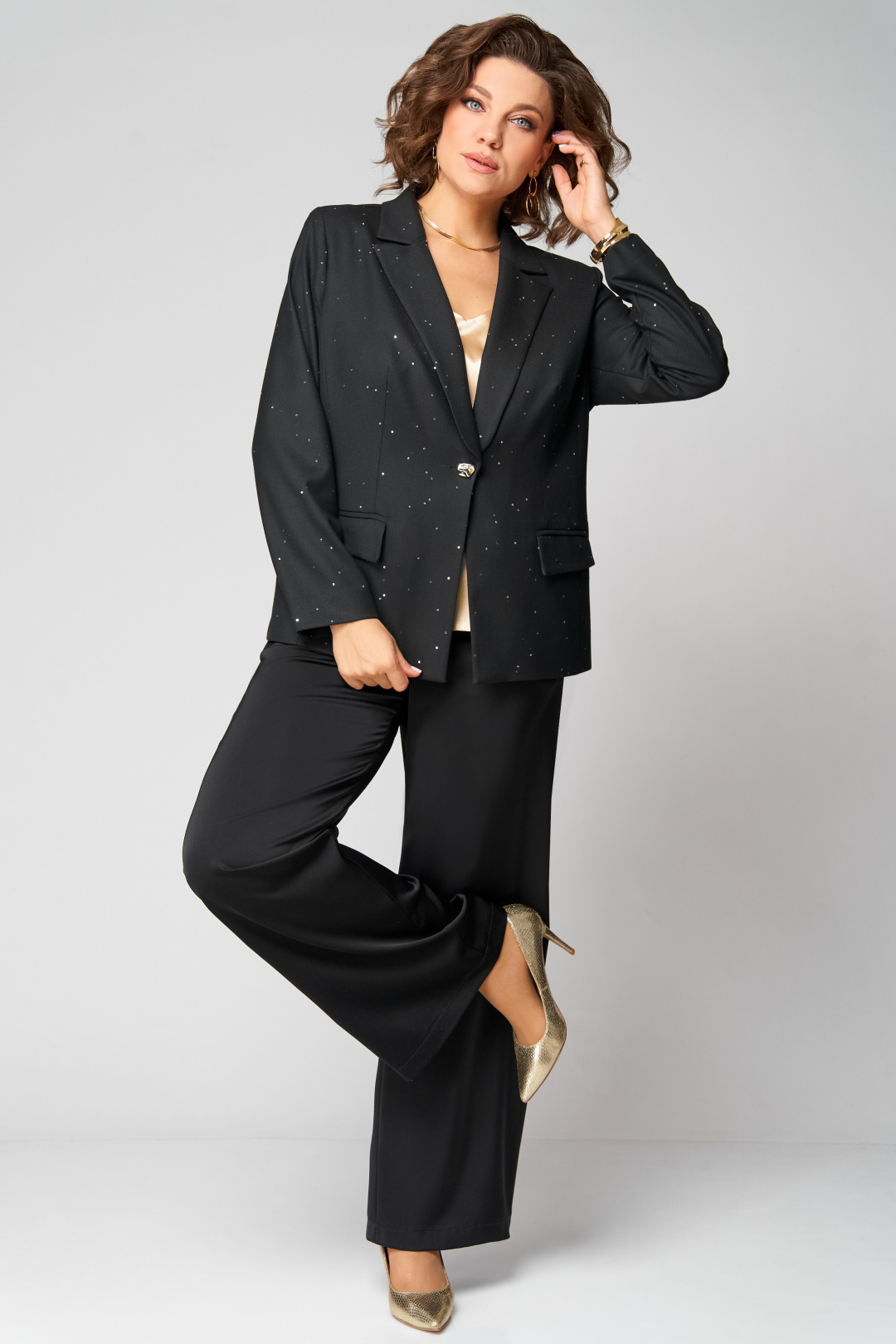 Стильный, женский двухпредметный комплект, жакет и брюки. Жакет выполнен из поли вискозной ткани в расшитые пайетки, частично на подкладке по переду. Воротник отложной с лацканами. По переду прорезные карманы в раму с клапаном. Застежка однобортная на 1 пуговицу и петлю. Спинка со средним швом и талевыми вытачками. Рукав втачной, двухшовный. Брюки прямые из сатина. Брюки на поясе, по бокам резинка и косые карманы.Топ на бретелях с V-образным вырезом по переду и спинке. По переду застрочены нагрудные вытачки.