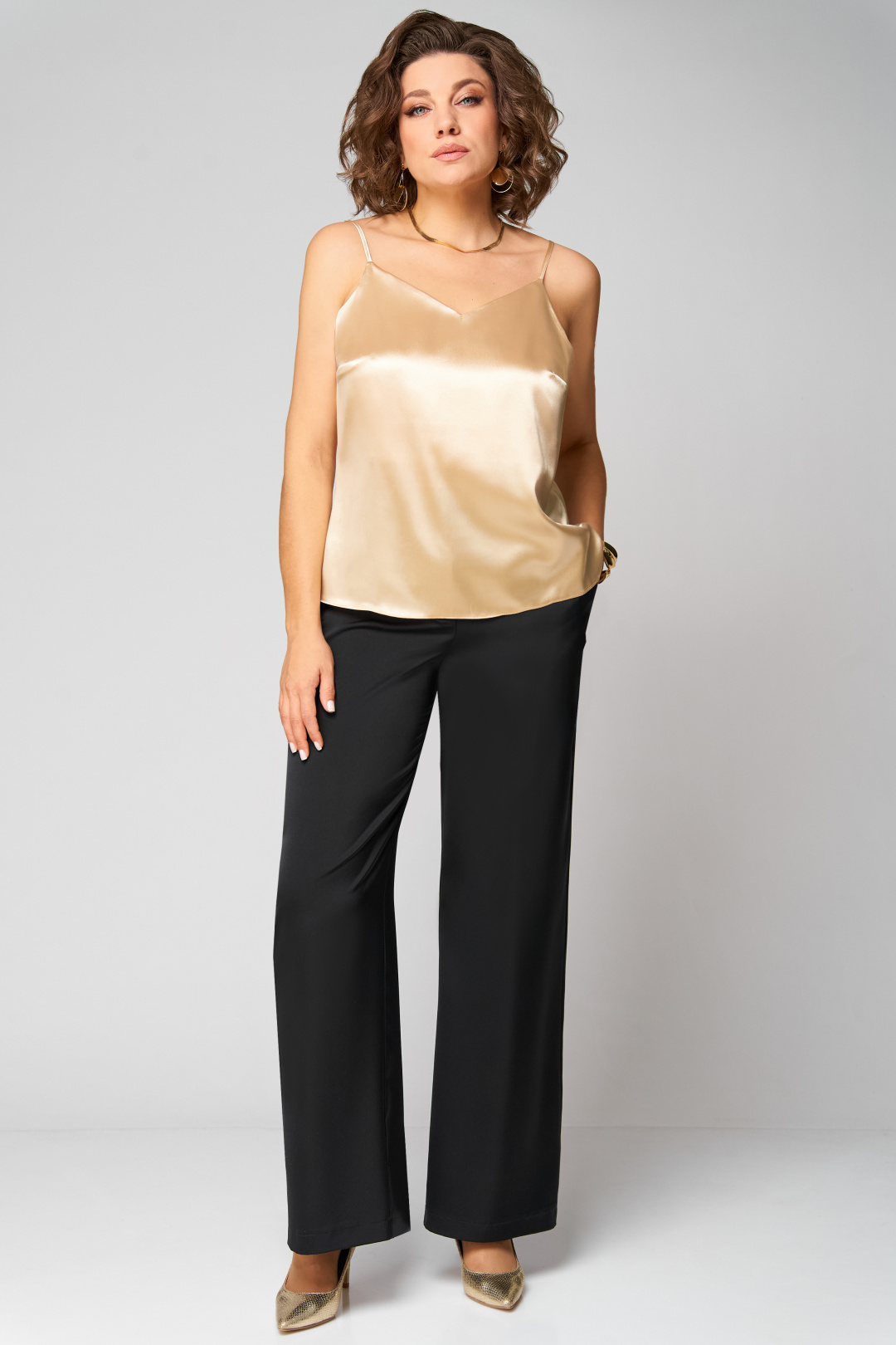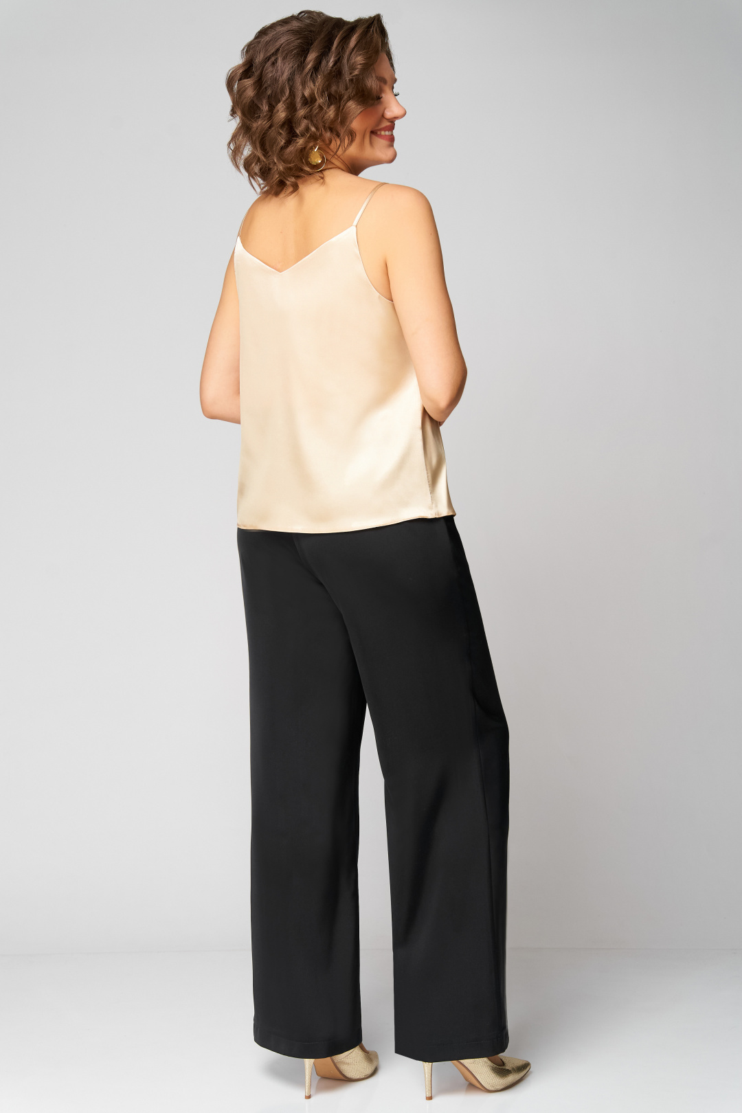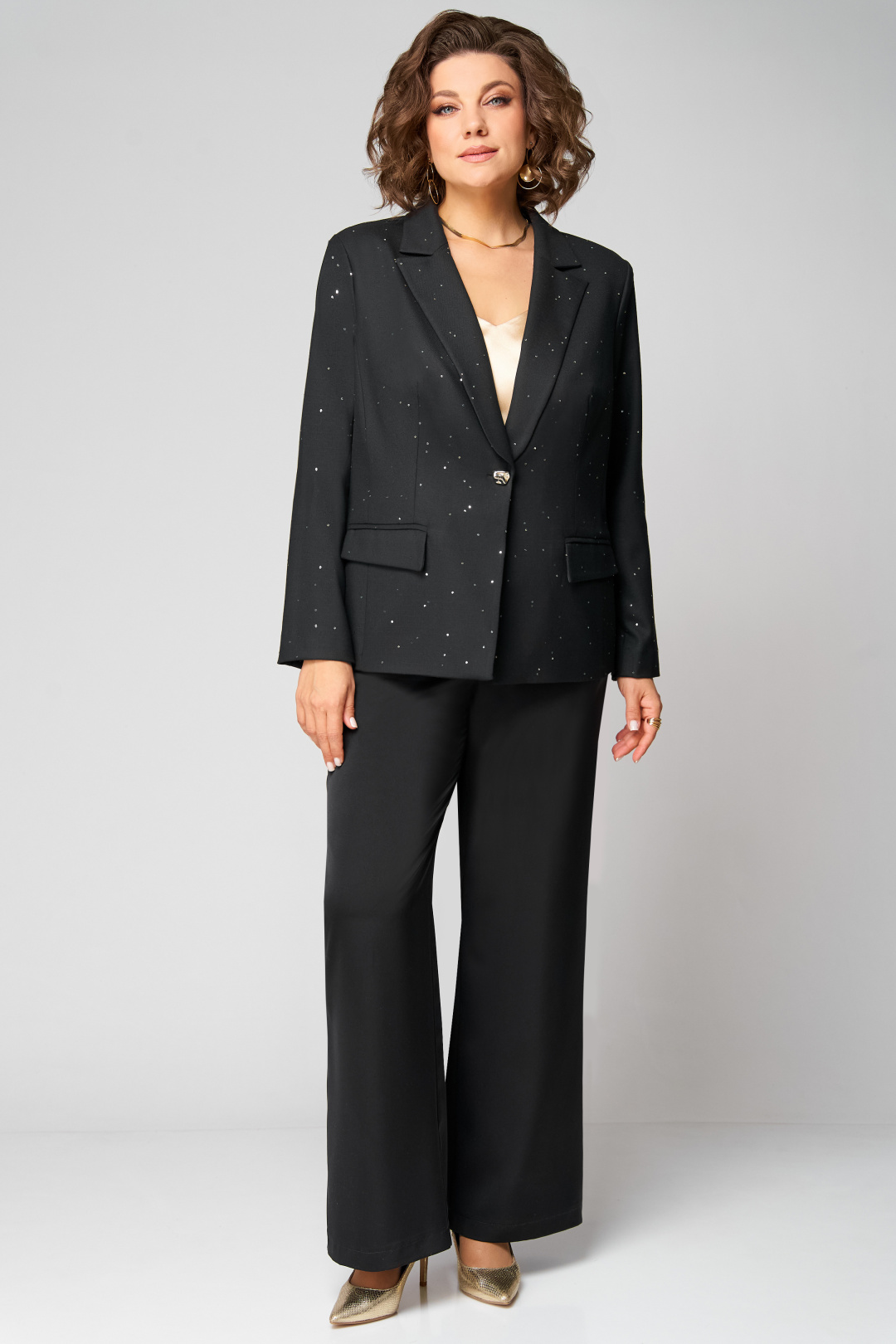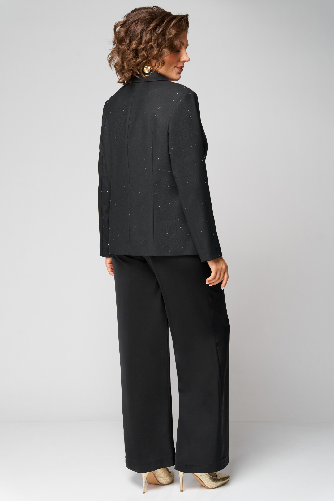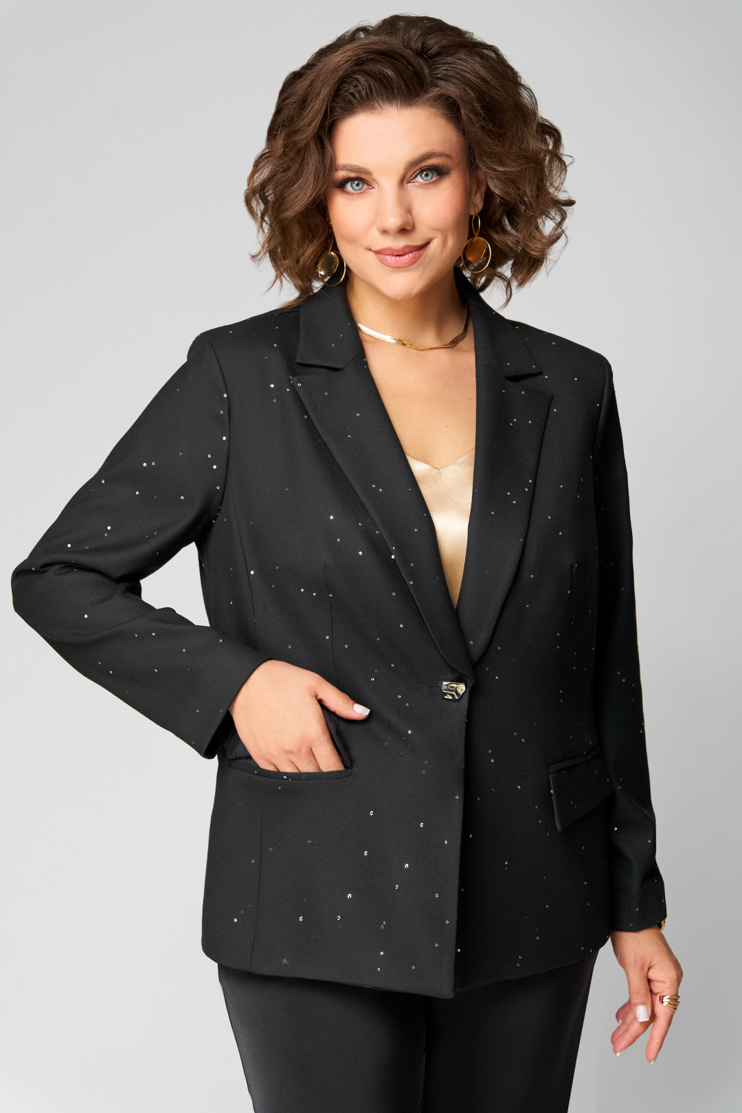 Стильный, женский двухпредметный комплект, жакет и брюки. Жакет выполнен из поли вискозной ткани в расшитые пайетки, частично на подкладке по переду. Воротник отложной с лацканами. По переду прорезные карманы в раму с клапаном. Застежка однобортная на 1 пуговицу и петлю. Спинка со средним швом и талевыми вытачками. Рукав втачной, двухшовный. Брюки прямые из сатина. Брюки на поясе, по бокам резинка и косые карманы.Топ на бретелях с V-образным вырезом по переду и спинке. По переду застрочены нагрудные вытачки.