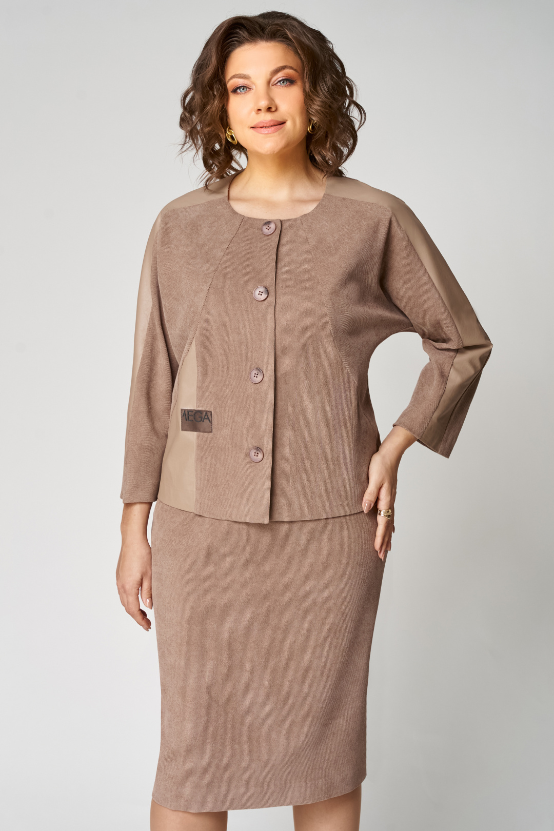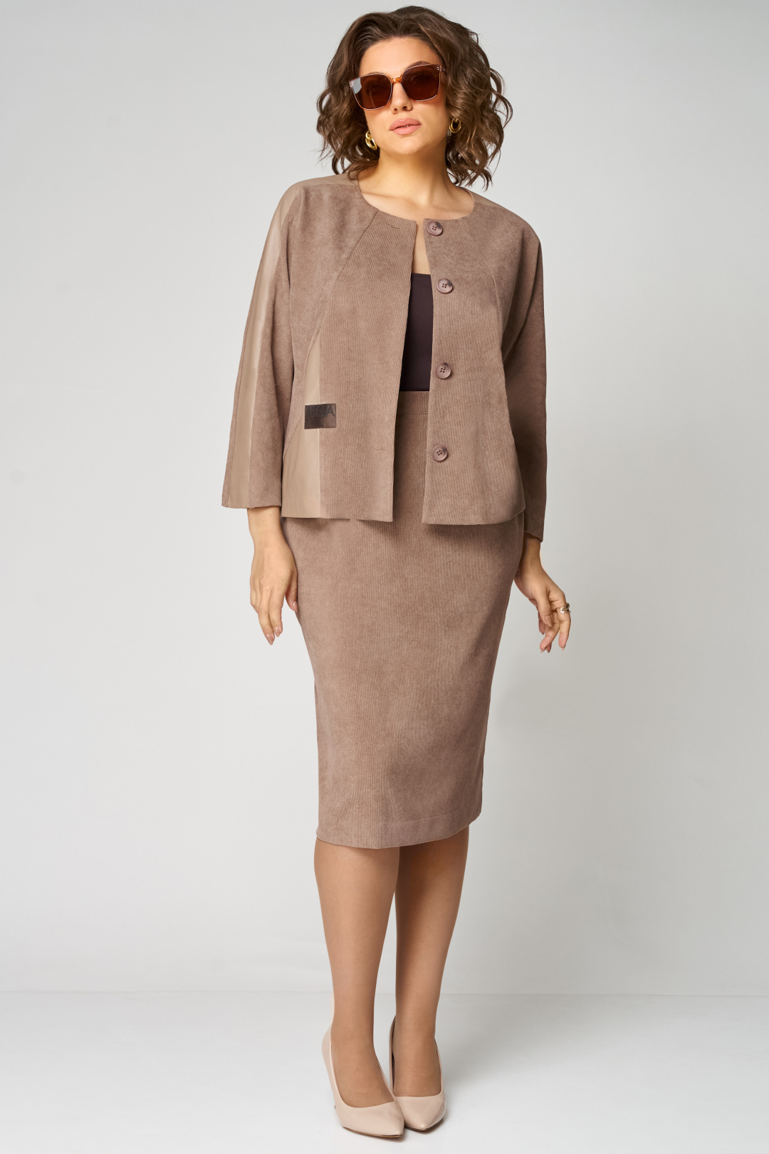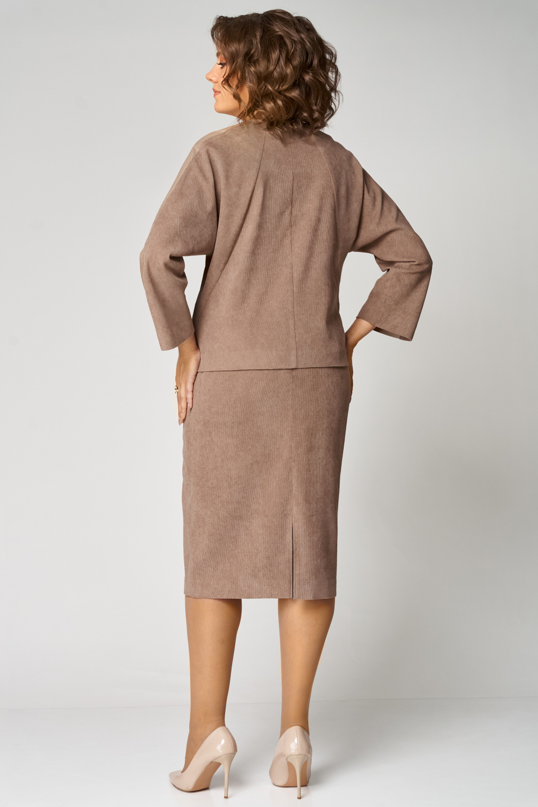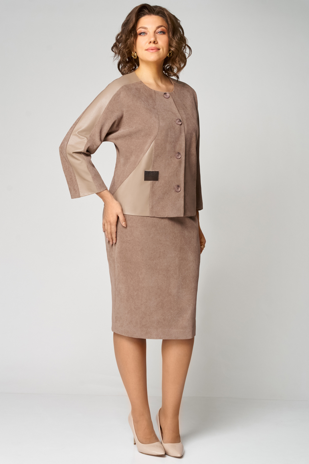Костюм состоит из жакета и юбки. Жакет полуприлегающего силуэта, с цельнокроеным рукавом длиной 7/8. От плеча до низа рукава отделочная вставка из эко-кожи. По переду- фигурные наклонные рельефы. По правой стороне вставка из эко-кожи, настрочена нашивка контрастного цвета. Застёжка центрально-бортовая на 4 петли и 4 пуговицы. Юбка прямая, слегка зауженная к низу, на притачном поясе, по бокам с резинкой. Застёжка на 1 петлю и 1 пуговицу, и потайную молнию сзади в среднем шве, по низу шва разрез. Юбка на подкладке.