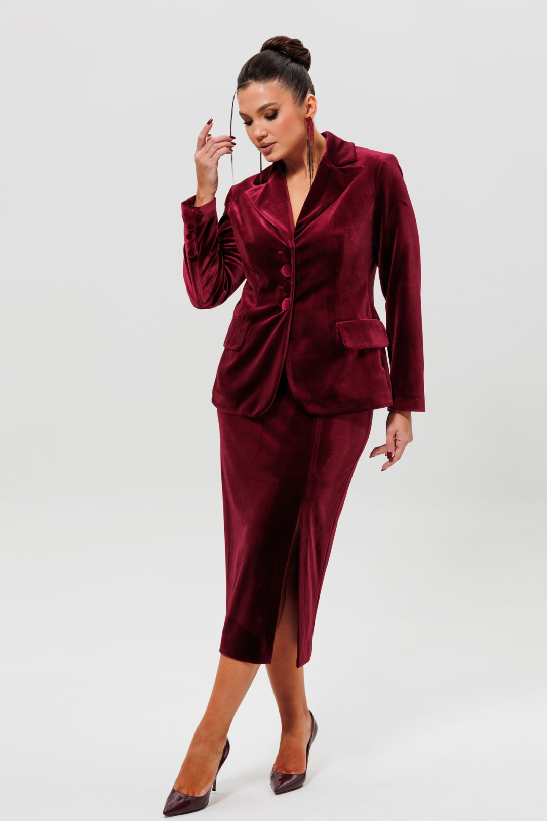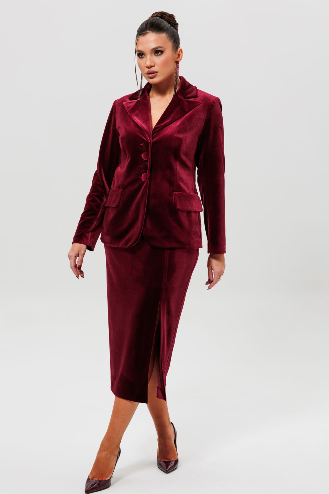 Этот элегантный бордовый костюм с юбкой-карандаш станет основой вашего делового гардероба. Комплект из полуприлегающего жакета и классической юбки выполнен из качественного бархата, что добавляет образу статусности и стиля. Жакет на подкладке с отложным воротником и декоративными пуговицами легко комбинируется с другими вещами, а юбка-карандаш идеально подчеркивает фигуру, оставаясь комфортной для носки в течение всего дня. Данный костюм бордового цвета — прекрасный выбор для работы, деловых встреч, конференций или любого события, где важны безупречный вкус и элегантность.