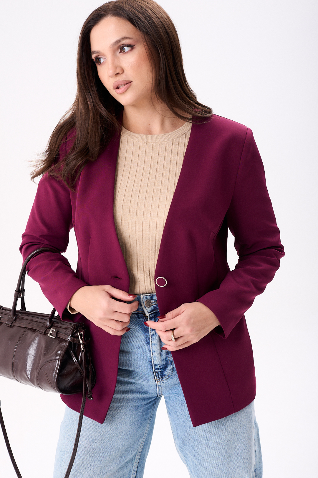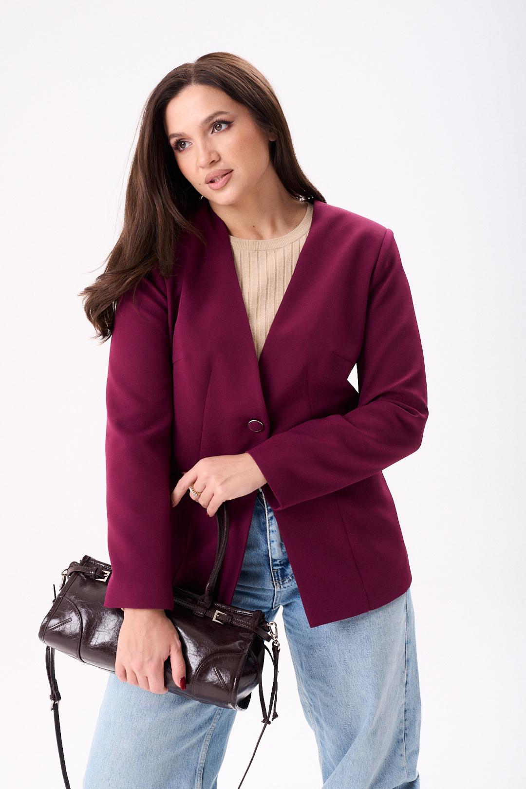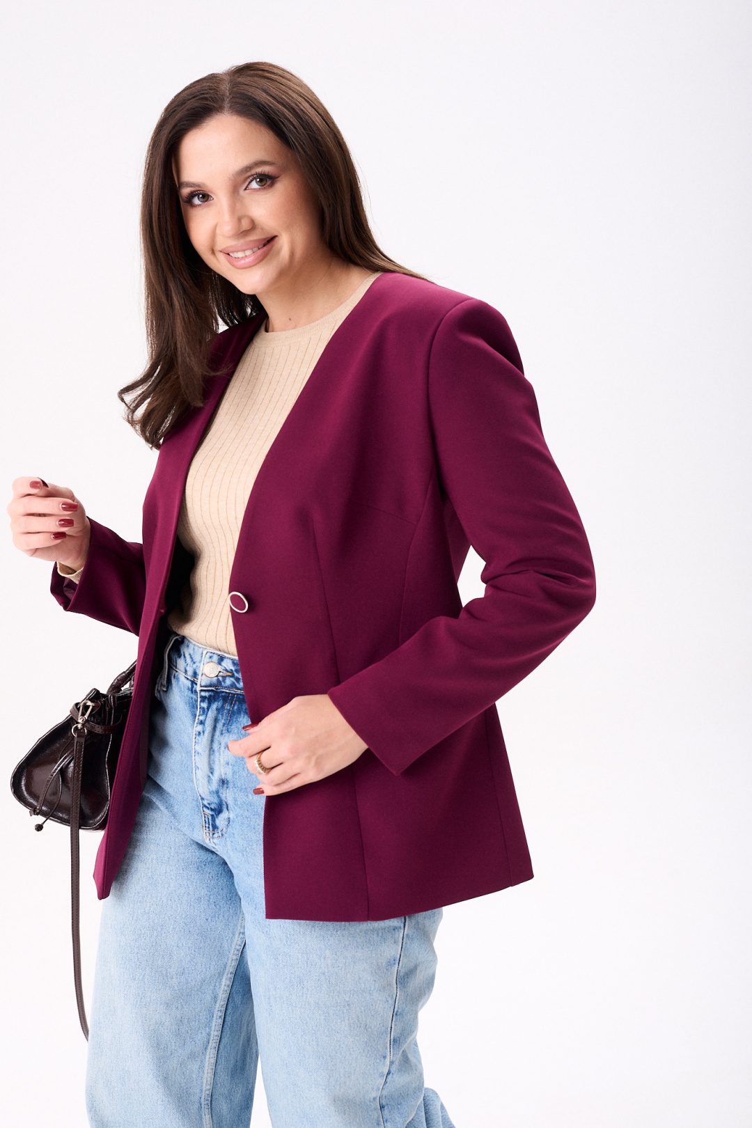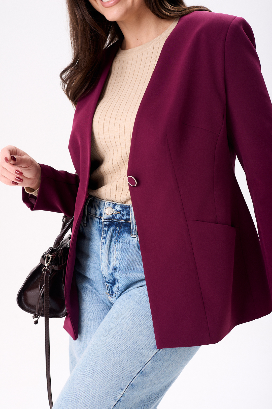 Элегантный женский жакет восхитительного бордового оттенка, идеально подчеркнет стиль своей обладательницы. Модель полуприлегающего кроя на подкладке подчеркивает силуэт благодаря мастерски выполненным нагрудным и талевым вытачкам. Удобные втачные карманы и боковой подрез добавляют функциональности, а центральный шов и рельефы по спинке эффектно формируют фигуру. Рукава жакета длинные, двух шовные, втачные, завершают образ с утонченной аккуратностью. Жакет застегивается на одну петлю и пуговицу, что добавляет изысканности в общий дизайн. Эта модель будет отличным выбором как для деловых встреч, так и для повседневной носки, идеально сочетаясь как с джинсами, так и с более формальным низом.
