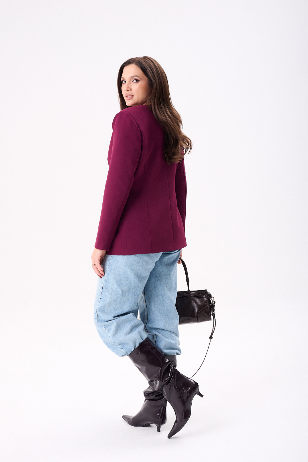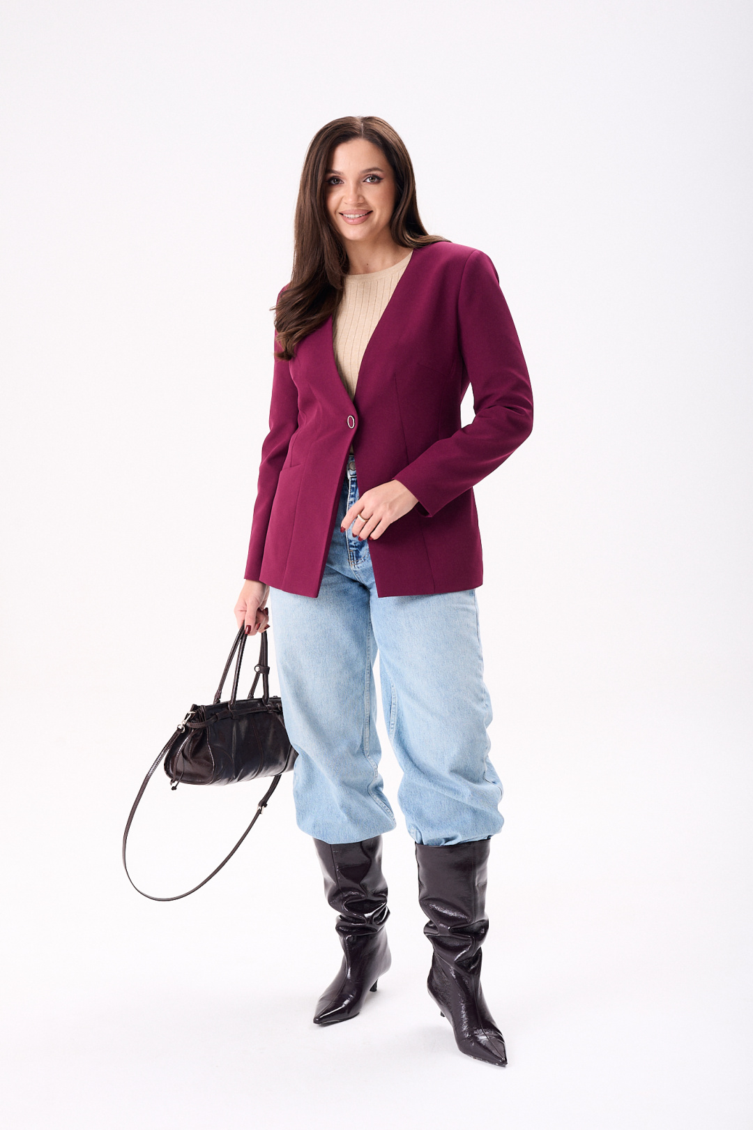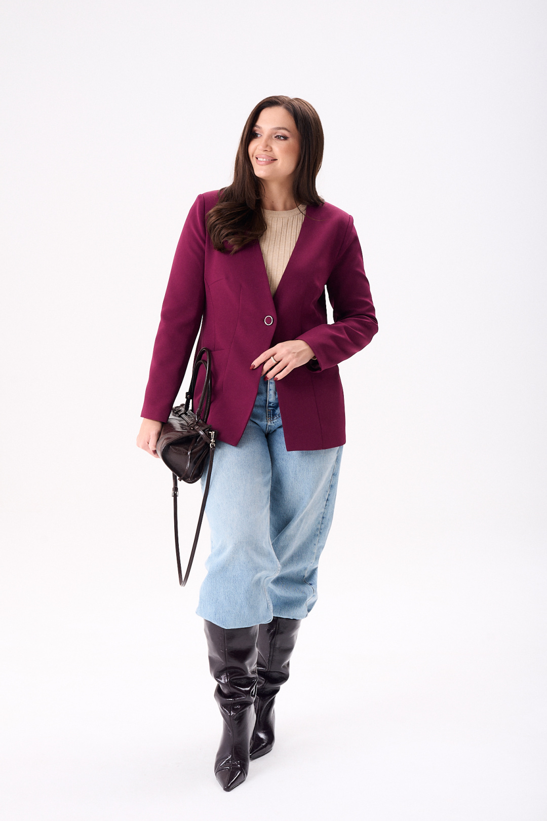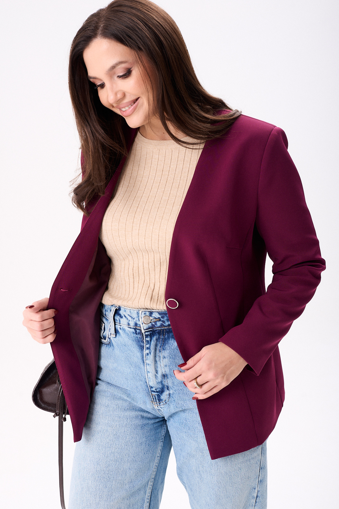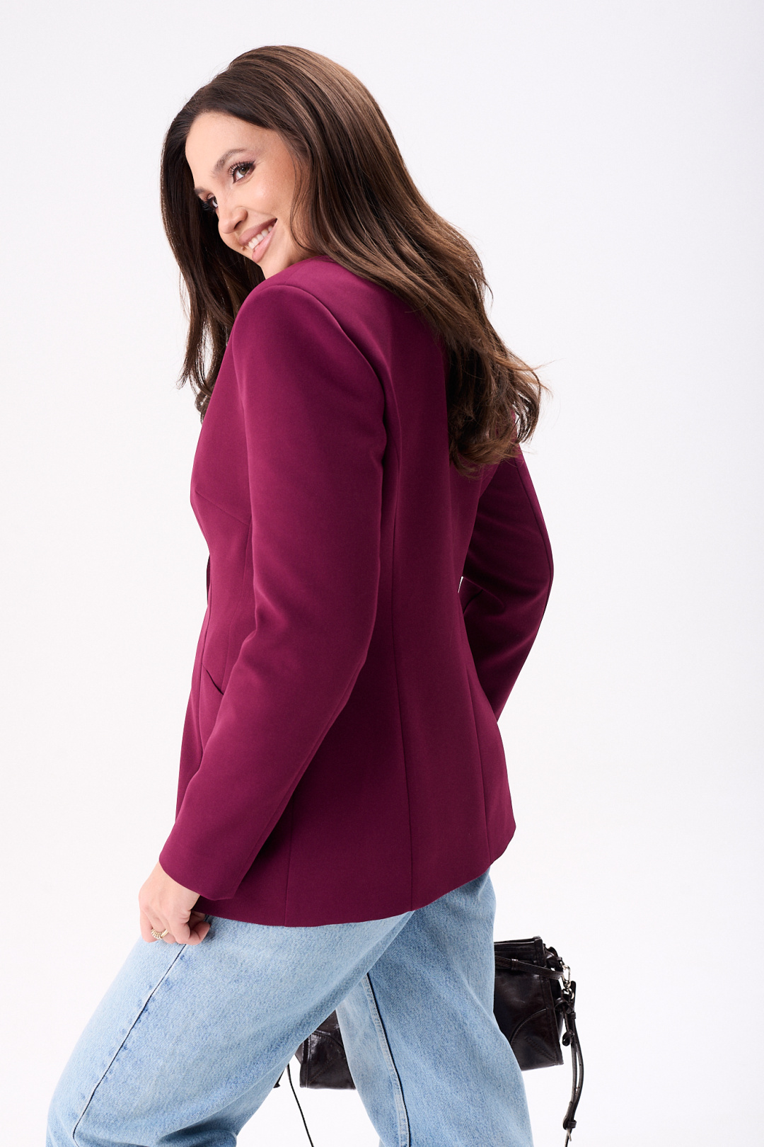 Элегантный женский жакет восхитительного бордового оттенка, идеально подчеркнет стиль своей обладательницы. Модель полуприлегающего кроя на подкладке подчеркивает силуэт благодаря мастерски выполненным нагрудным и талевым вытачкам. Удобные втачные карманы и боковой подрез добавляют функциональности, а центральный шов и рельефы по спинке эффектно формируют фигуру. Рукава жакета длинные, двух шовные, втачные, завершают образ с утонченной аккуратностью. Жакет застегивается на одну петлю и пуговицу, что добавляет изысканности в общий дизайн. Эта модель будет отличным выбором как для деловых встреч, так и для повседневной носки, идеально сочетаясь как с джинсами, так и с более формальным низом.