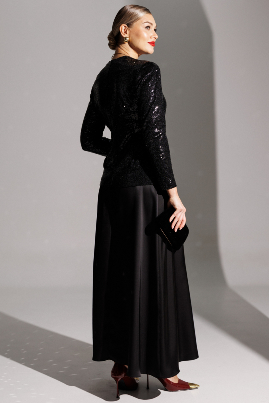 Продолжением нашей нарядной коллекции является роскошный комплект, состоящий из блузы, имитирующей жакет, и невероятной струящейся юбки из атласа длины макси. Блуза из ткани в пайетки с декоративным узлом в области талии. V-образный вырез. Блуза приталенного силуэта с втачными, двухшовными рукавами. Блуза частично на подкладке. Юбка на поясе с резинкой. длина спинки блузона: 62 см