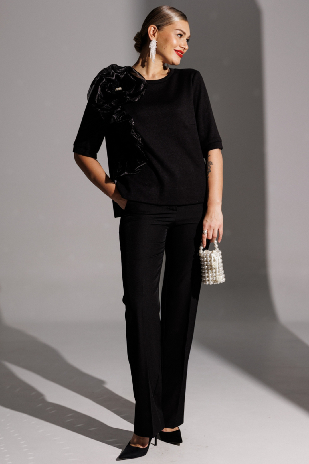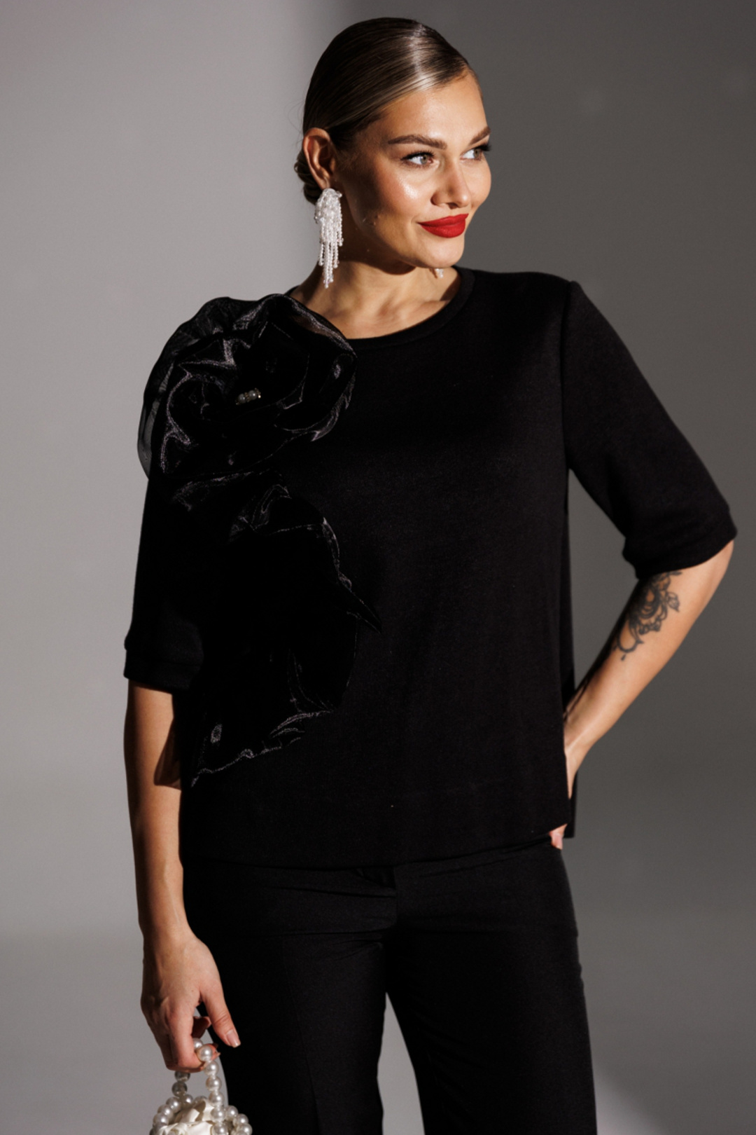 Создать нарядный образ с брюками возможно вместе с нашей новинкой ! Комплект состоит из блузы и брюк. Блуза выполнена из тонкого, струящегося трикотажа, имеющего в составе ангору. Блуза полуприлегающего силуэта, по низу с перепадом длины. Перед декорирован акцентным дизайнерским цветком из органзы. Рукав втачной с манжетой. Брюки классические, прямого силуэта, с заутюженными стрелками, боковыми карманами шлевками для ремня. длина спинки блузона: 67 см длина брюк: 109 см