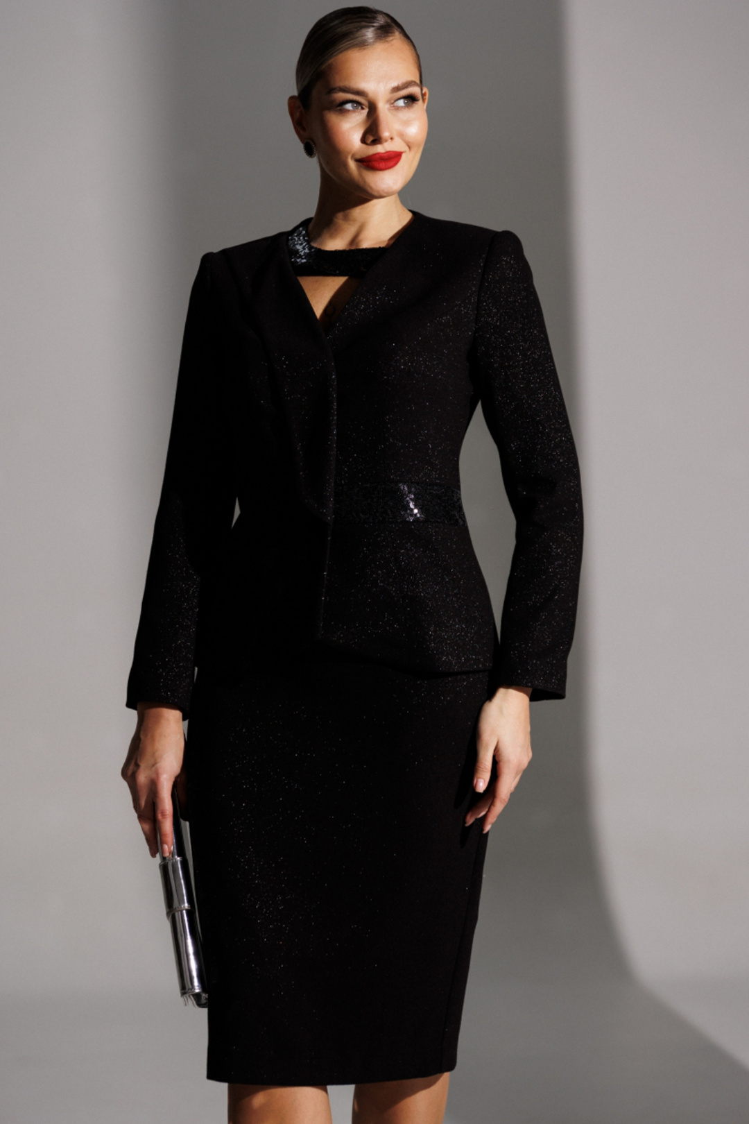 Женственность в каждом шве! Мы предлагаем Вам новинку от бренда "МОДА-ЮРС", которая выделит Ваши лучшие стороны: акцент на талию, плавные линии, идеальная посадка. Забудьте о массивных плечах и прямых линиях - теперь это нежные линии, которые подчеркивают Вашу фигуру и добавляют образу утонченности. Жакет полуприлегающего силуэта с рельефами по переду и спинке. Рукава втачные, двухшовные. Спинка со средним швом. Жакет декорирован отрезными деталями по линии талии и горловине, которые выполнены из ткани в пайетки. Главным акцентом является отрезной лацкан с одной стороны и брошь, декорированная жемчужинами, с другой стороны. Застежка на металлические пришивные кнопки. Юбка прямая, зауженная к низу, сверху на притачном поясе, по бокам с резинками. Застежка на тесьму-молнию в среднем шве. Комплект на подкладке.