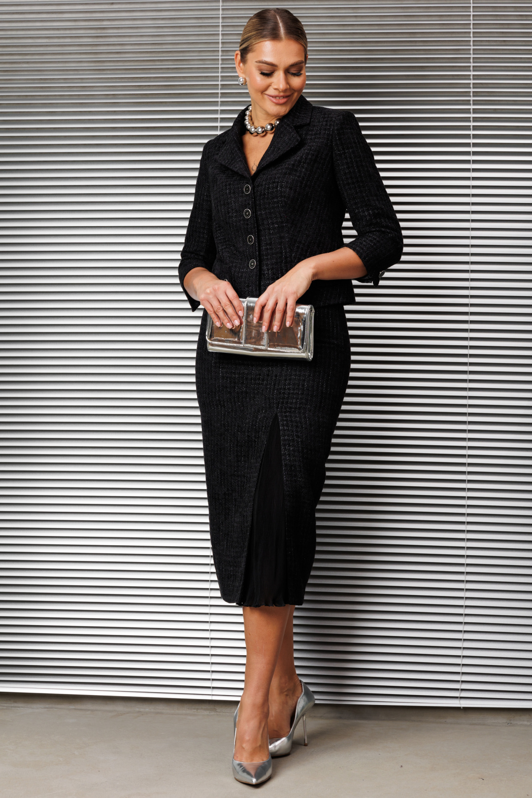 Юбка выполнена в прямом силуэте с эффектным разрезом по переду, который декорирован отделочной тканью «плиссе», придающей дополнительный шарм. Пояс юбки притачной с резинкой сзади обеспечивает комфортную посадку, а боковая молния облегчает надевание. Вся конструкция костюма выполнена на подкладке, что обеспечивает удобство и приятные тактильные ощущения. Такой костюм идеально подходит для офисной обстановки или деловых встреч, сочетая в себе классический стиль и современные акценты.