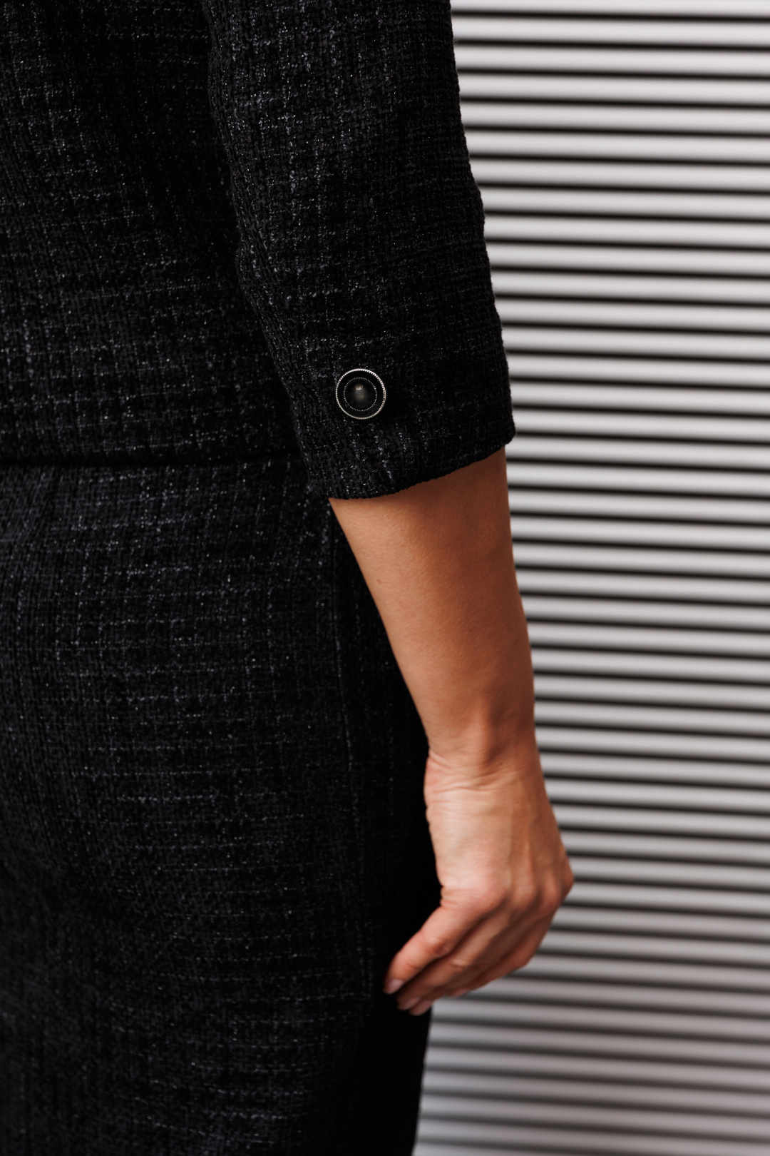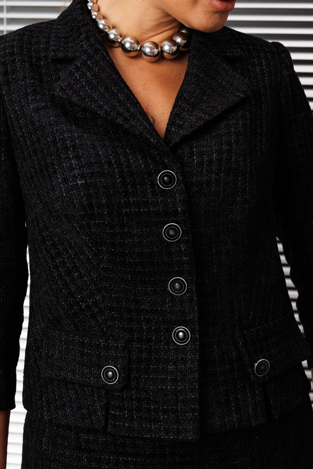 Костюм в стиле Шанель, состоящий из жакета и юбки, представляет собой элегантный и стильный ансамбль. Жакет полу прилегающего силуэта имеет центральную застежку на петли пуговицы, что придает ему изысканный вид. Спинка жакета оформлена средним швом, а передняя часть украшена талиевыми вытачками, заканчивающимися разрезами, над которыми аккуратно настрочены клапаны с пуговицами. Воротник пиджачного типа добавляет строгости, а рукава длиной 3/4 с шлицей в локтевом шве подчеркивают женственность образа.