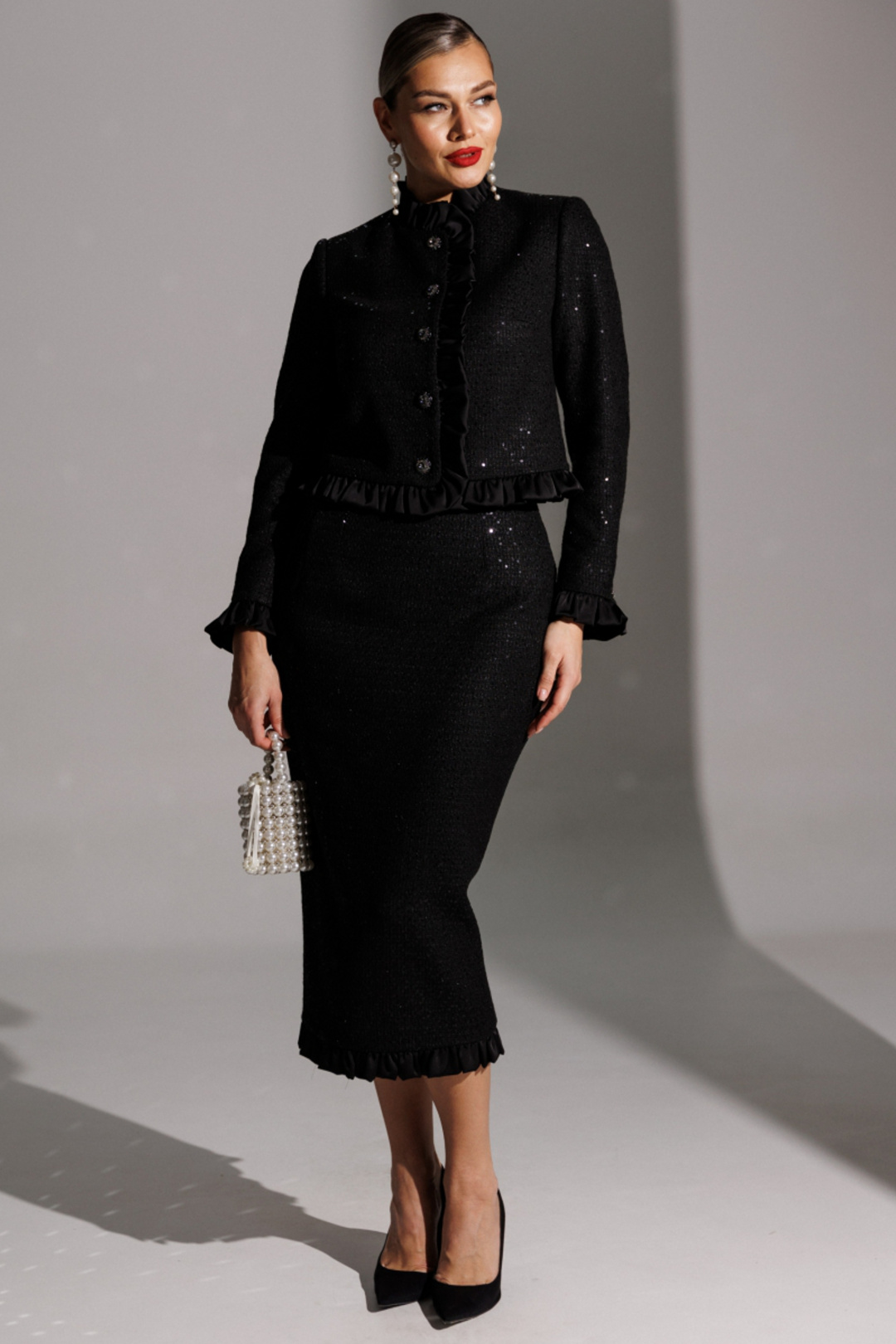 Этот нарядный костюм состоит из жакета и юбки, идеально подходящих для особых случаев. Укороченный жакет полуприлегающего силуэта имеет центральную застежку на пуговицы и детализированную спинку со средним швом и талиевыми вытачками, что подчеркивает фигуру. Перед жакета украшен нагрудными вытачками, а округлый вырез горловины придает ему элегантный вид. Рукава втачные двухшовные, дополненные шлицей в локтевом шве и пуговицами, которые добавляют изящества. Декоративная рюша из атласа обрамляет вырез горловины, край борта, низ жакета и низ рукава, создавая романтичный акцент.