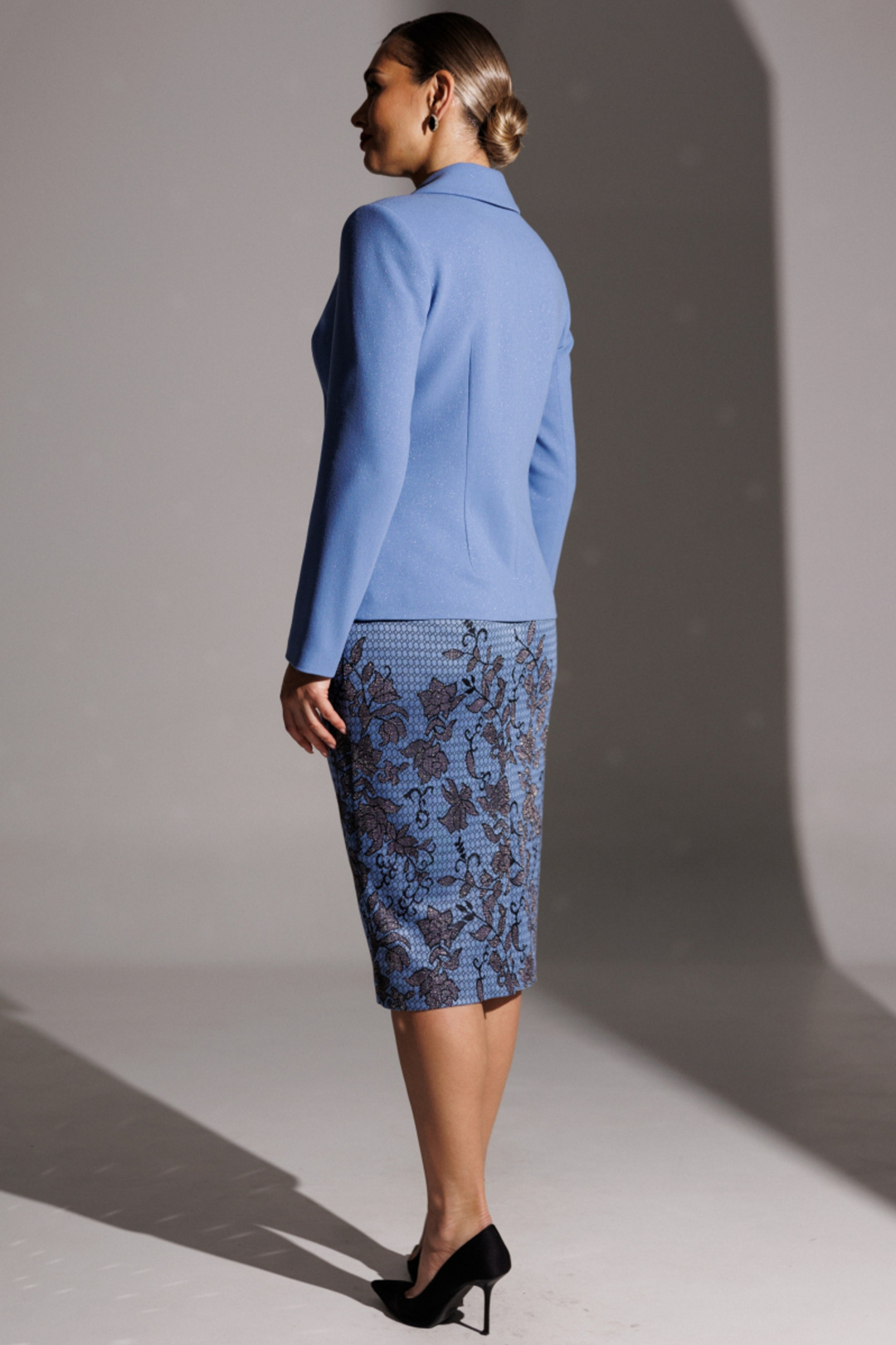 Состав: жакет полиэстер 62%, вискоза 33%, спандекс 3% люрекс 2% юбка полиэстер 68%, вискоза 18%, эластан 7% люрекс 7%