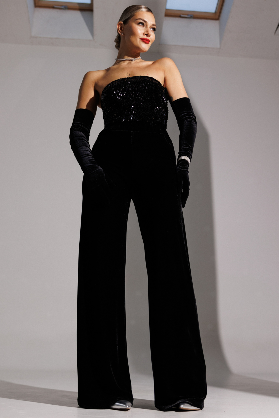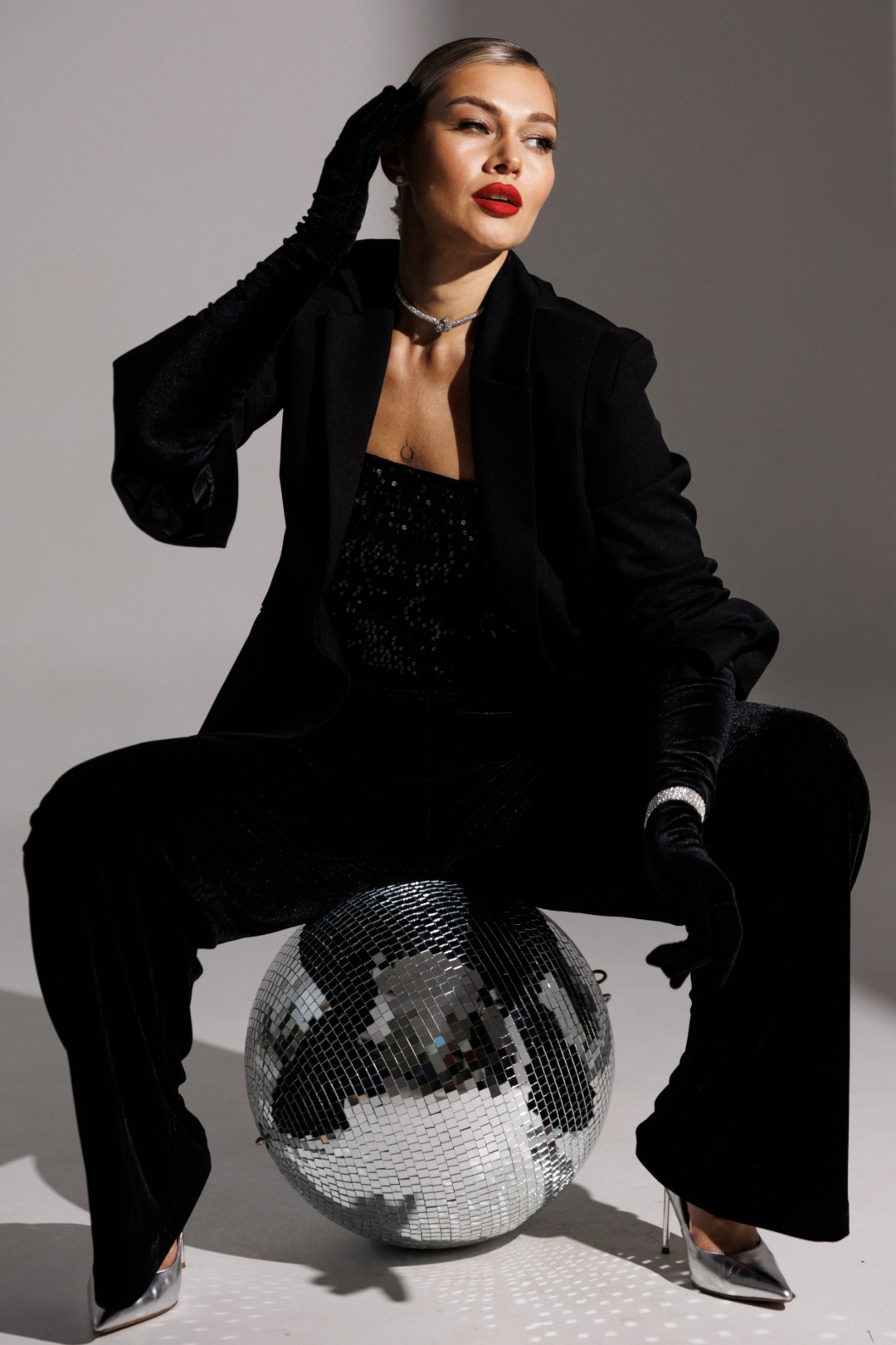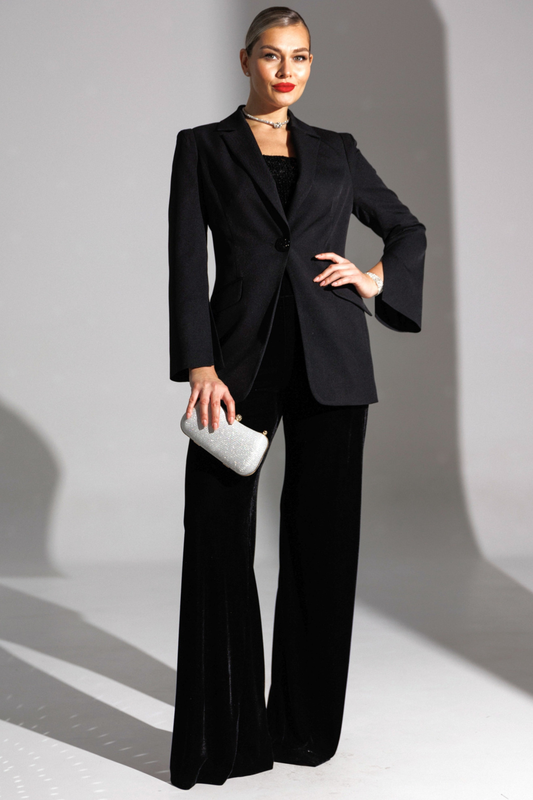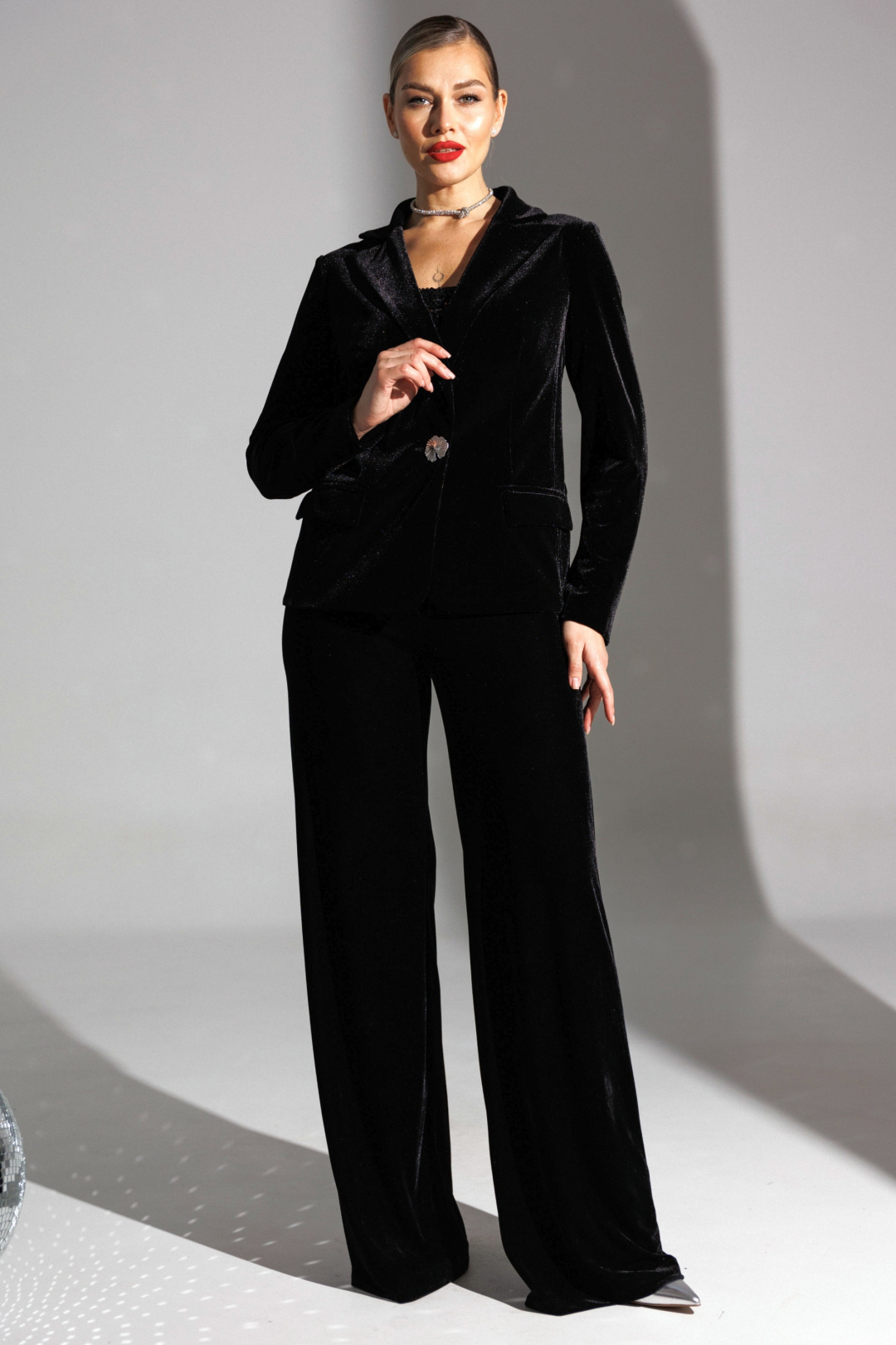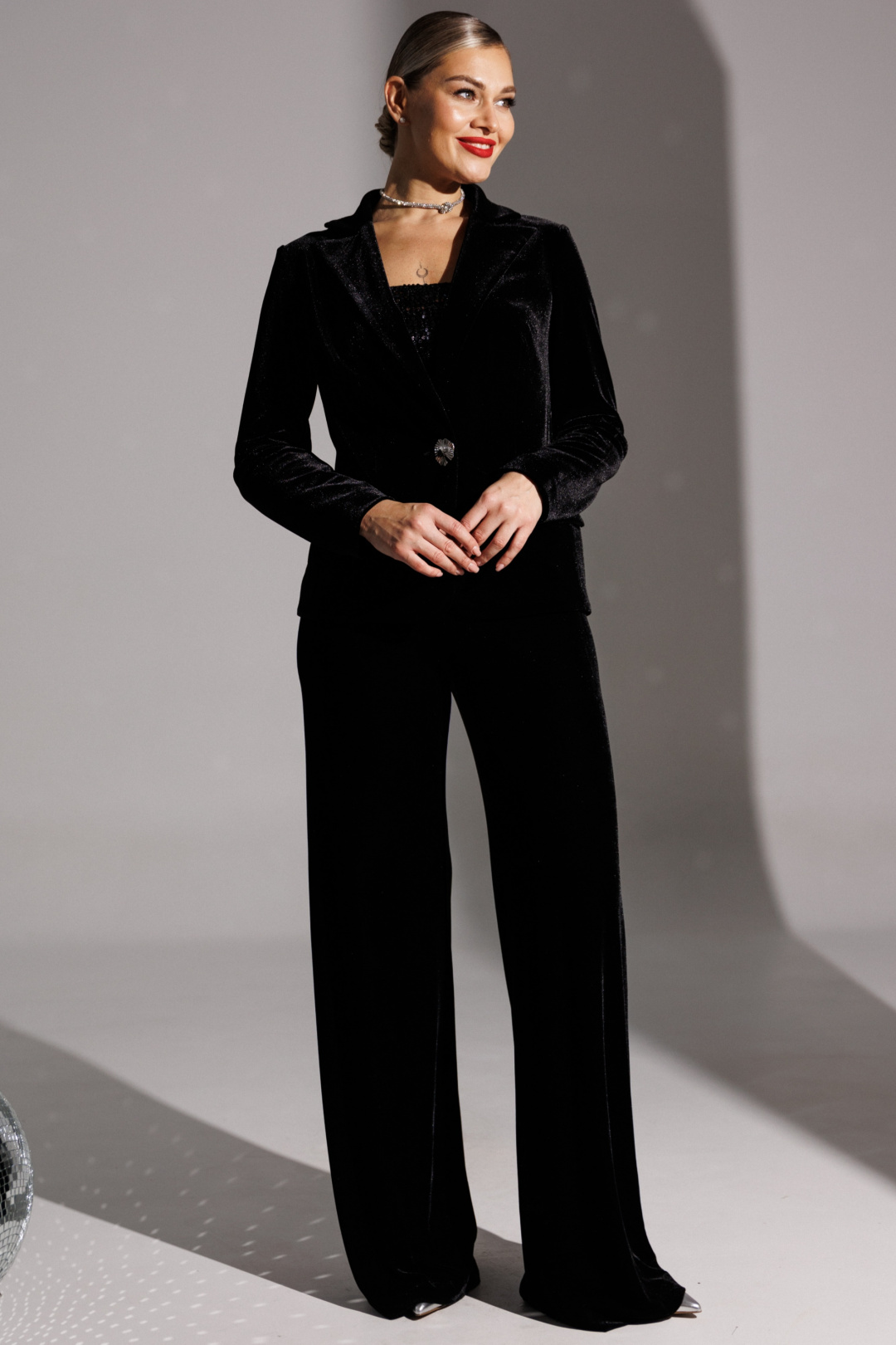 В предпраздничной суете так важно чувствовать себя комфортно, не жертвуя шиком. Наши велюровые брюки созданы именно для этого. Их струящийся силуэт и мягкий, глубокий черный цвет добавляют образу лоска, а тактильное наслаждение от ткани останется с Вами на весь вечер. Брюки с высокой посадкой, с притачным поясом на резинке, без боковых швов, слегка расширенные к низу. Наденьте наш бархатный жакет с велюровыми брюками - и Вы получите ансамбль тотальной гармонии. Дополните образ топом из пайеток - образ получается смелым. Легкая небрежность велюра и безупречная линия костюмного жакета создают тот самый сплав комфорта и стиля.