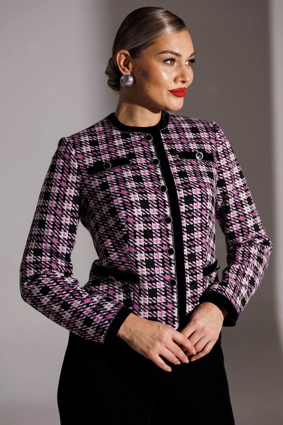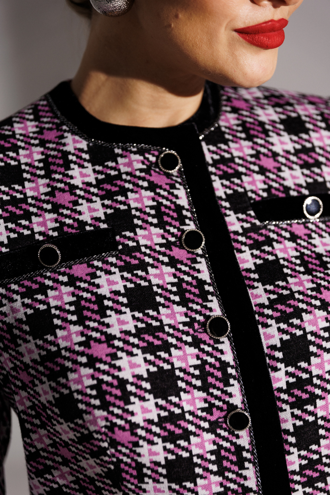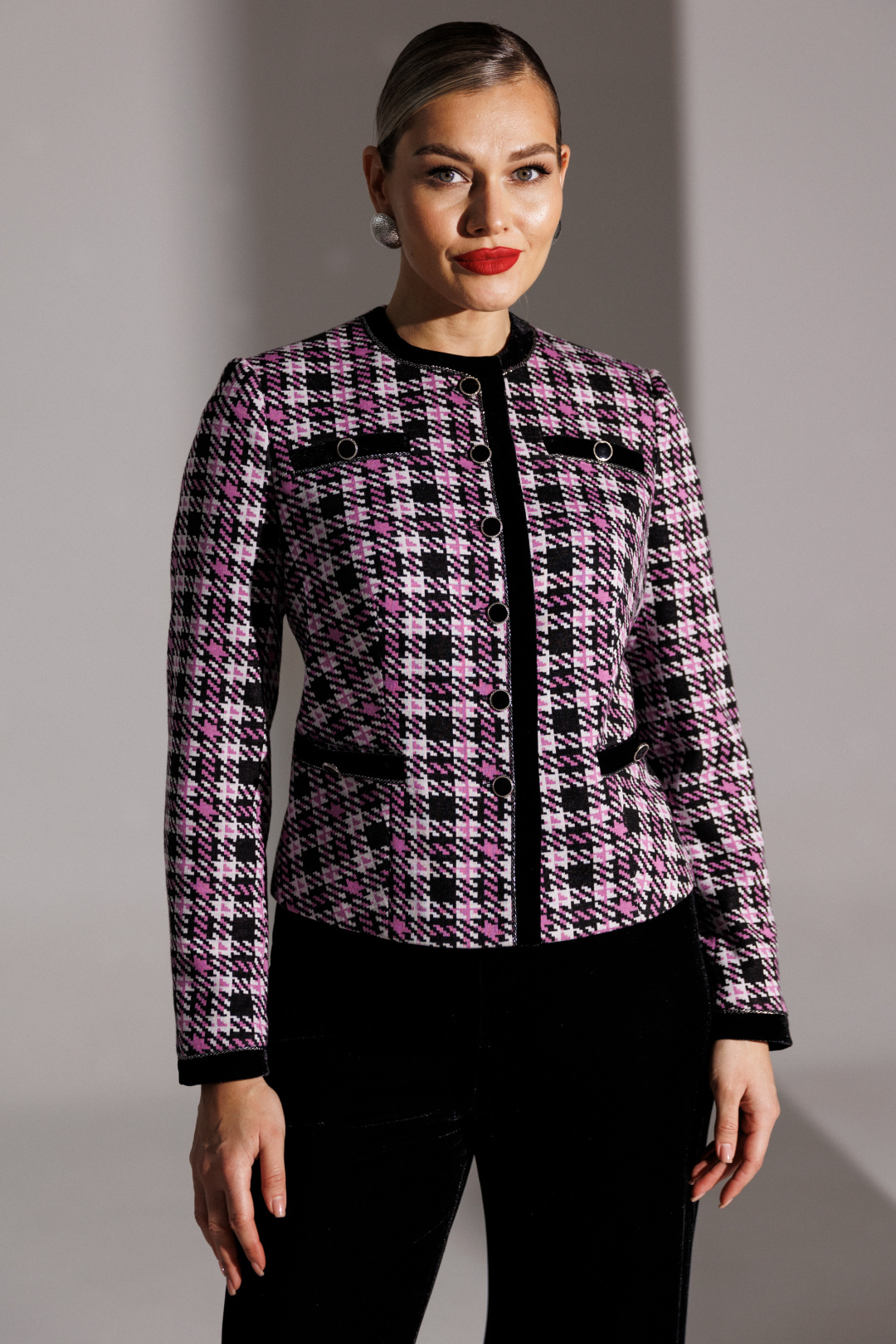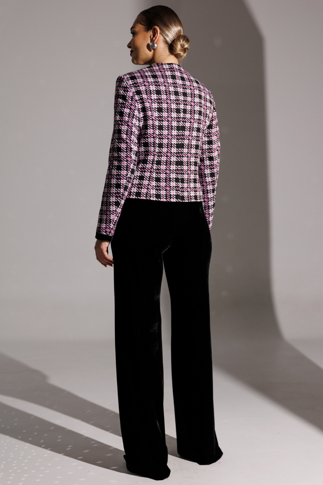 Брючный костюм в стиле Шанель представляет собой элегантное сочетание классики и современности. Жакет выполнен из трикотажного полотна с актуальным принтом «гусиная лапка», имеет полуприлегающий силуэт и центральную застежку на пуговицы. Спинка оформлена средним швом и талиевыми вытачками, что обеспечивает идеальную посадку. Передняя часть также украшена талиевыми вытачками, а округлая горловина подчеркивает женственность образа.