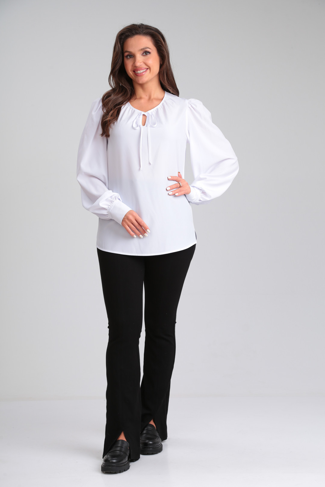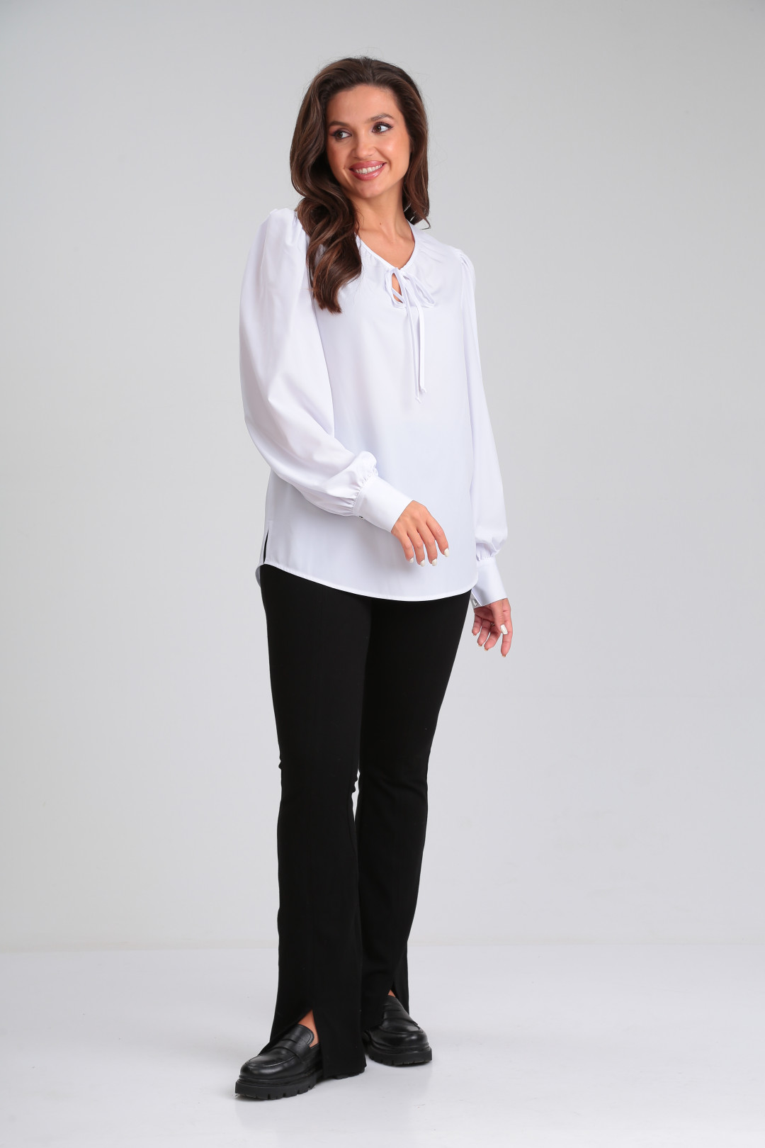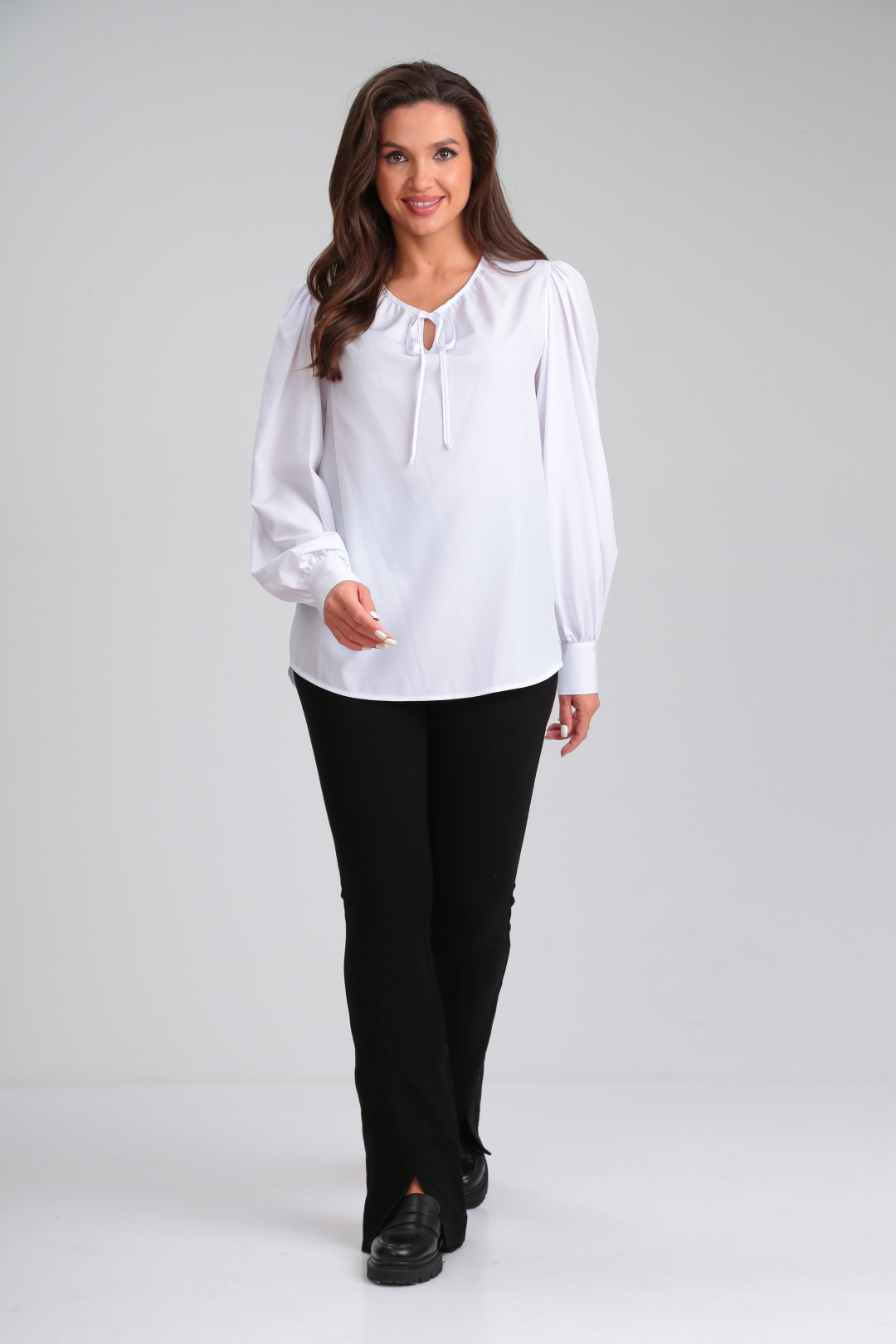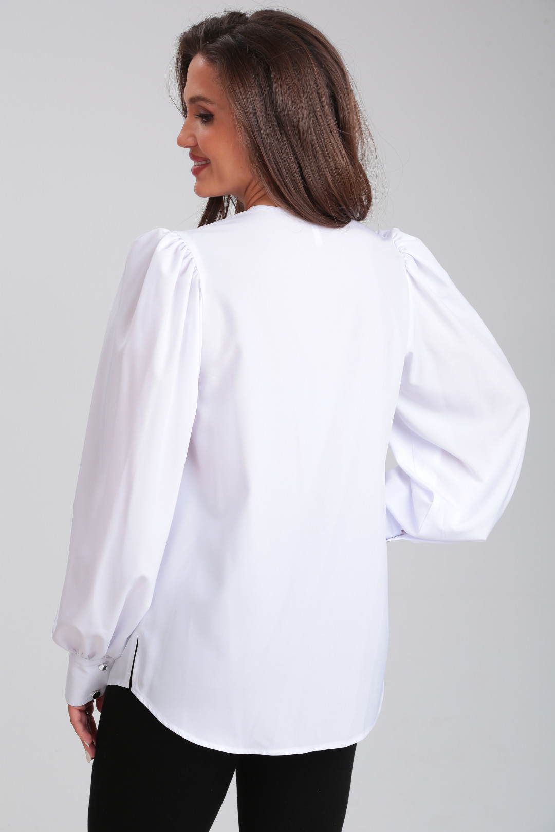 Стильная блузка прямого силуэта. По переду изделия сборка по горловине. Горловина окантована, концы окантовки завязываются в бант. Рукав втачной с широкой притачной манжетой и сборкой по окату и низу. Спинка цельная.