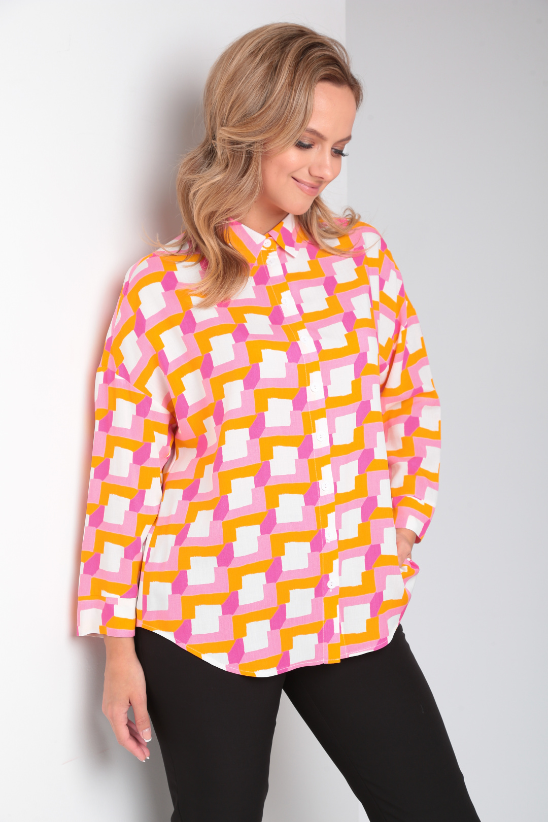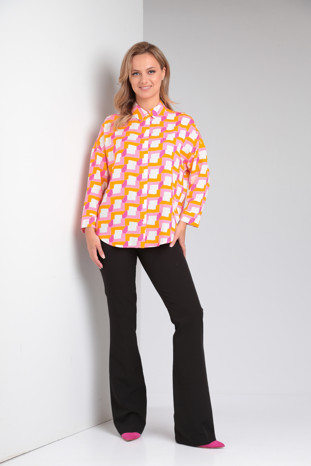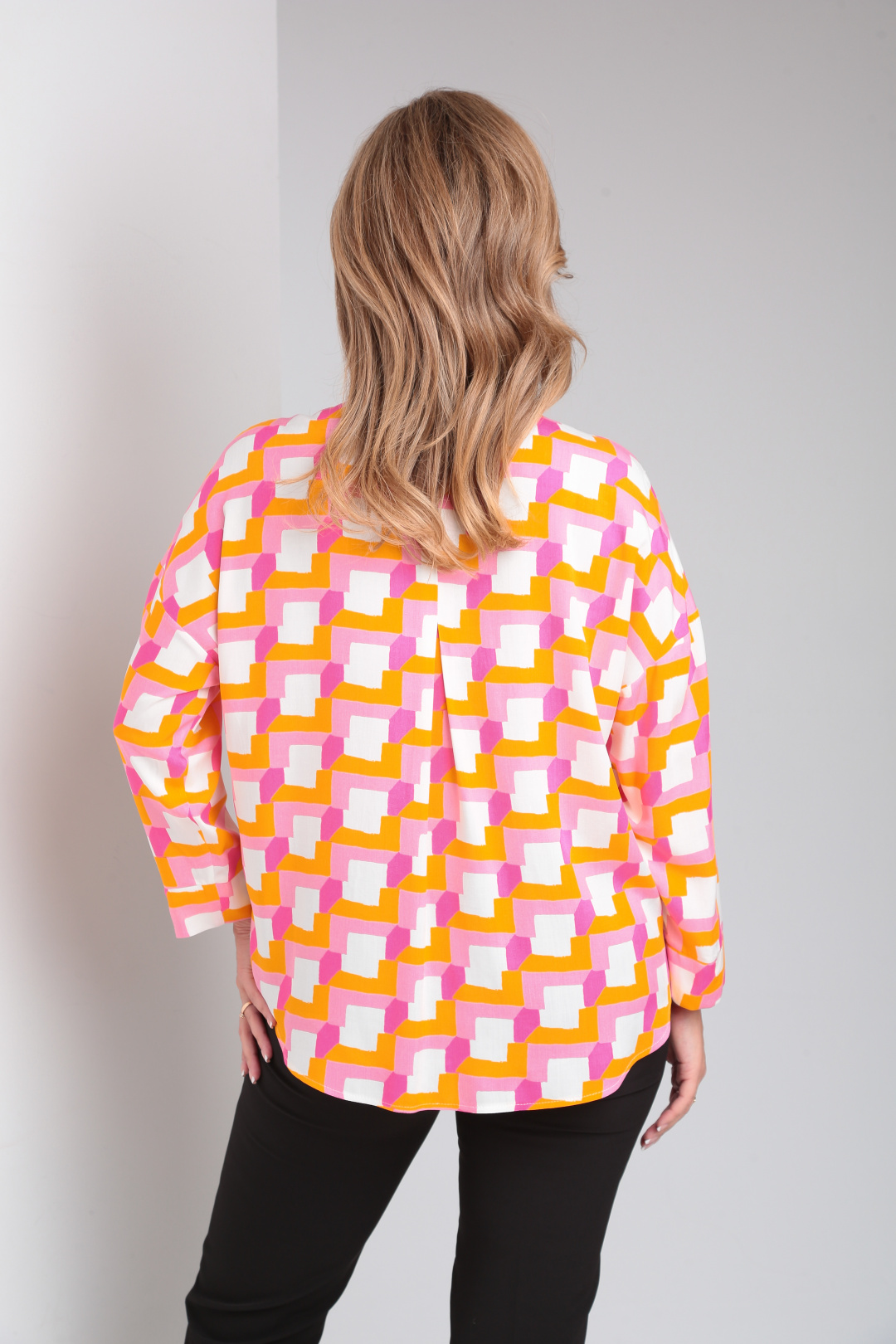 Стильная блузка полуприлегающего силуэта с втачным коротким рукавом. Модель c рубашечным воротником. По переду блузки нагрудные вытачки. По спинке планка с застежкой на пуговицы. По боковым швам разрезы.