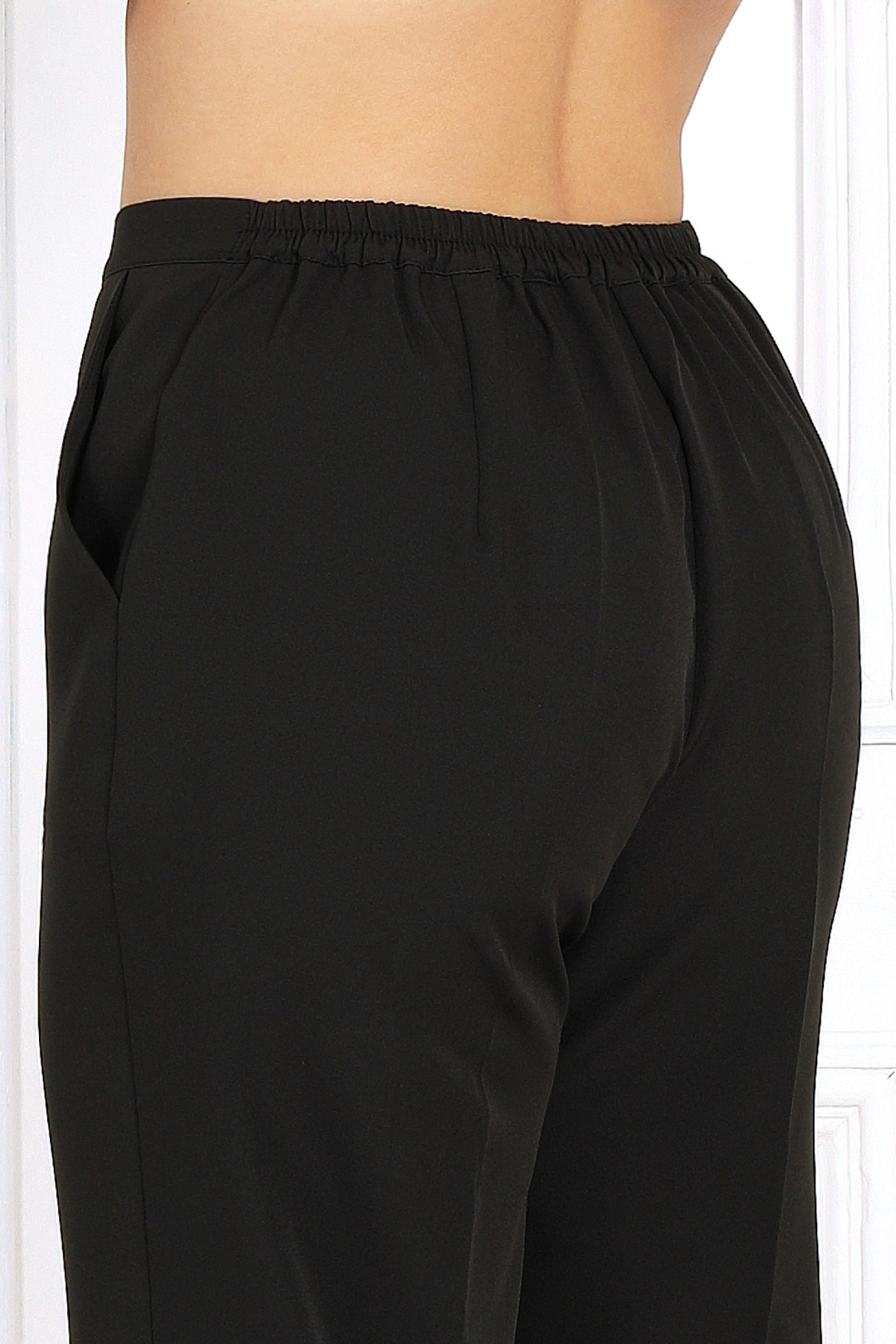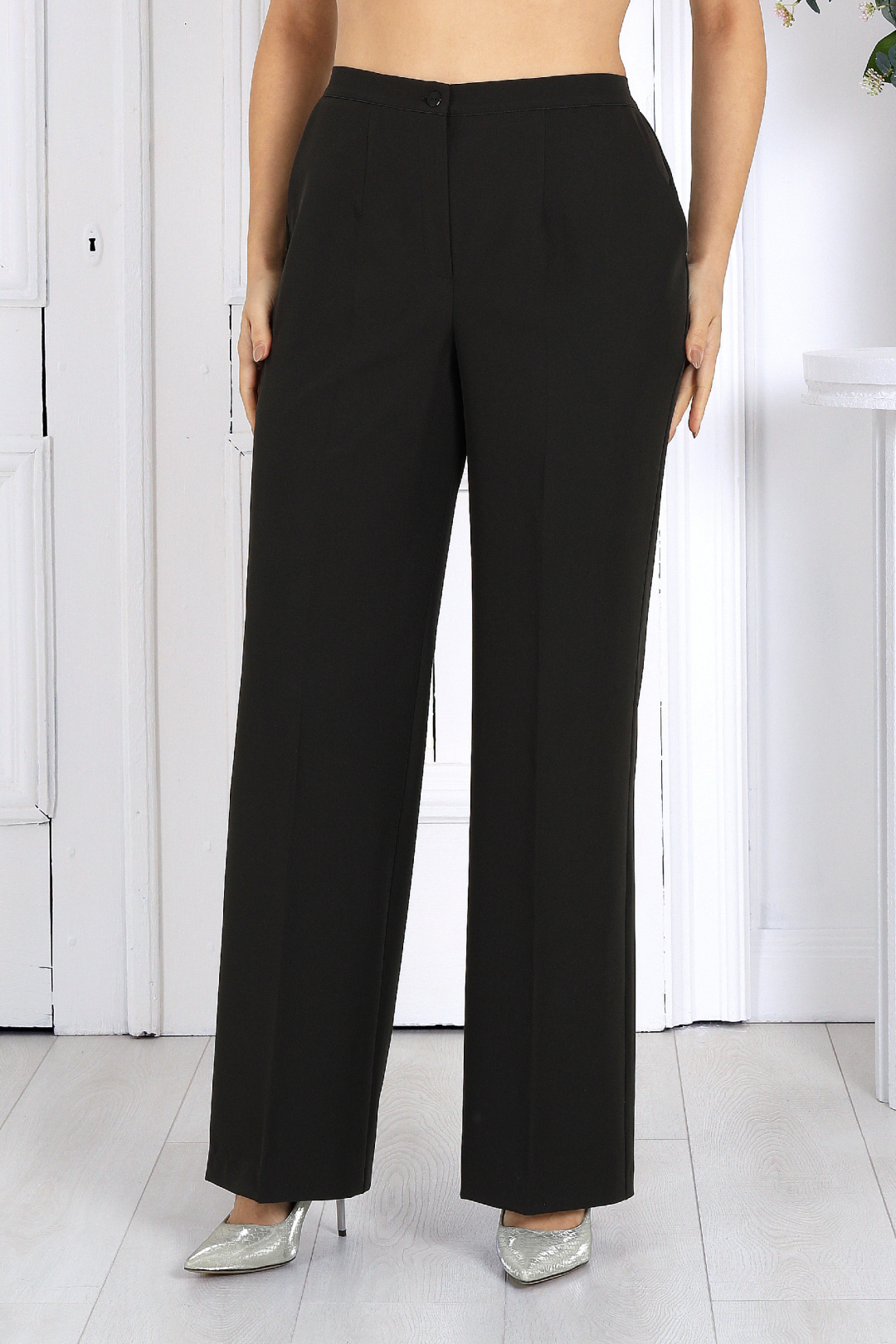 Этот праздничный костюм двойка для полных женщин — воплощение современного понимания нарядной элегантности: лёгкий, удобный, стильный и бесконечно женственный. Блузка выполнена из изысканной сетки-гофре с люрексом, которая мягко переливается при каждом движении, создавая благородное сияние. Внутренняя трикотажная подкладка обеспечивает комфорт и делает посадку идеальной даже для полных женщин. Фигурный крой и драпированный пояс с перекрутом формируют женственный силуэт — акцентируют талию, визуально вытягивая фигуру и делая её стройнее. Рукава особого фасона с разрезом добавляют легкости и движения образу, придавая наряду современное звучание и ощущение воздушности. Брюки из костюмной ткани идеально дополняют верх, создавая лаконичную вертикаль, которая делает образ ещё более пропорциональным. Этот костюм станет вашим универсальным решением: праздничный вечер, деловая встреча, торжественный ужин или новогодний приём — он уместен везде. Блузка с благородным мерцанием делает образ утончённым и эффектным, придавая нотку торжественности без излишнего блеска. Комплект брючный 2-х предметный, состоящий из блузки и брюк. Блузка женская, приталенного силуэта, выполнена из сетки-гофре с нитью «люрекс». Модель на трикотажной подкладке, без застежки и плечевых накладок. Перед дополнен задрапированным поясом с перекрутом, концы которого входят в боковые швы. Для лучшего прилегания по линии талии спинки предусмотрена кулиса с протянутой внутрь эластичной лентой. Горловина округлая, окантована узкой косой бейкой из основного материала. Рукав короткий, расширенный, с фигурным низом, переходящим в разрез, края которого по окату скреплены на запах. Длина блузки – 70 см; длина рукава (на продолжении плечевого шва) – 32 см. Брюки классические, длинные, с посадкой на талии, выполнены из костюмно- плательной ткани. Модель со стрелками. Передние и задние половинки брюк с талиевыми вытачками, направленными от пояса вниз. Спереди обработаны наклонные боковые карманы и центральная застёжка на тесьму-«молнию». Притачной пояс застегивается на 1 петлю и 1 пуговицу; для лучшего прилегания по линии талии в притачном поясе предусмотрена эластичная лента, вставленная по спинке. Длина брюк по боковому (с поясом) – 107 см (50-52 р-р), 108 см (54-58 р-р).