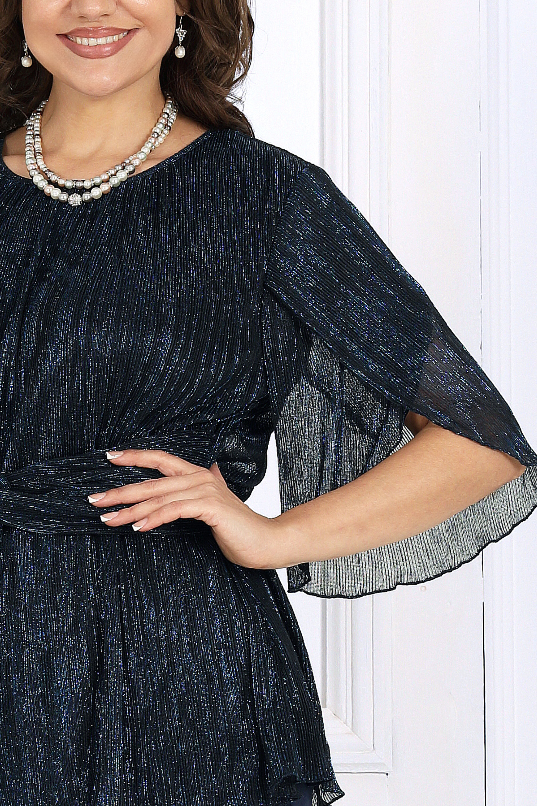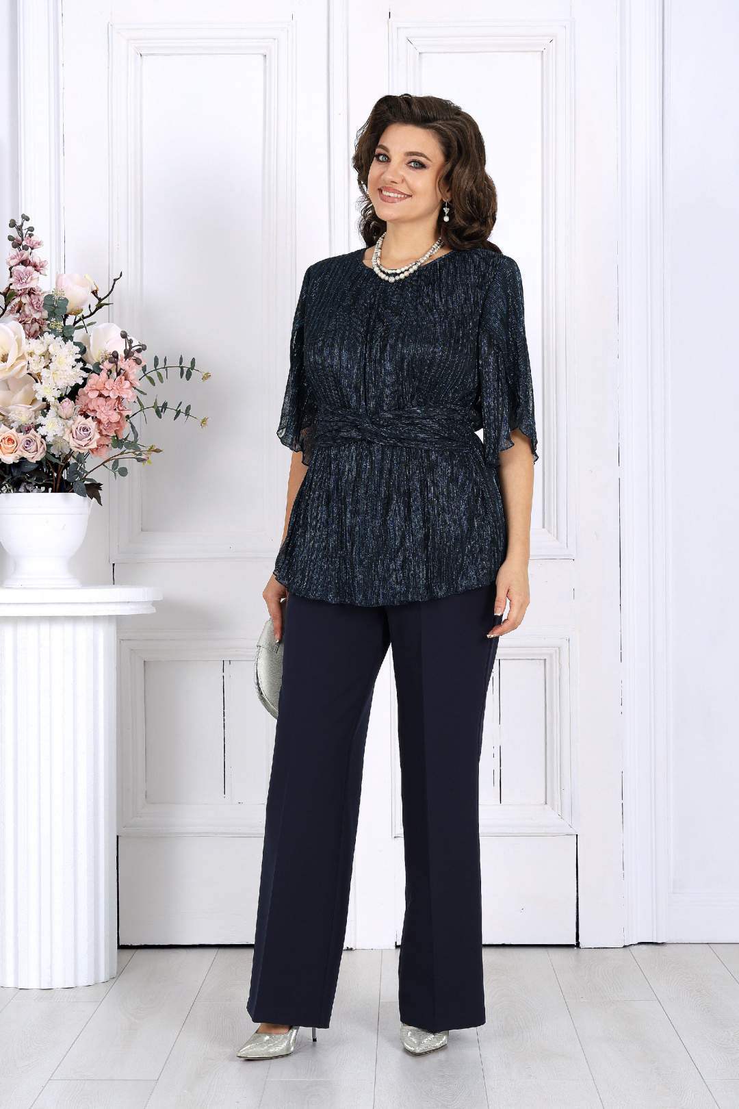 Этот праздничный костюм двойка для полных женщин — воплощение современного понимания нарядной элегантности: лёгкий, удобный, стильный и бесконечно женственный. Блузка выполнена из изысканной сетки-гофре с люрексом, которая мягко переливается при каждом движении, создавая благородное сияние. Внутренняя трикотажная подкладка обеспечивает комфорт и делает посадку идеальной даже для полных женщин. Фигурный крой и драпированный пояс с перекрутом формируют женственный силуэт — акцентируют талию, визуально вытягивая фигуру и делая её стройнее. Рукава особого фасона с разрезом добавляют легкости и движения образу, придавая наряду современное звучание и ощущение воздушности. Брюки из костюмной ткани идеально дополняют верх, создавая лаконичную вертикаль, которая делает образ ещё более пропорциональным. Этот костюм станет вашим универсальным решением: праздничный вечер, деловая встреча, торжественный ужин или новогодний приём — он уместен везде. Блузка с благородным мерцанием делает образ утончённым и эффектным, придавая нотку торжественности без излишнего блеска. Комплект брючный 2-х предметный, состоящий из блузки и брюк. Блузка женская, приталенного силуэта, выполнена из сетки-гофре с нитью «люрекс». Модель на трикотажной подкладке, без застежки и плечевых накладок. Перед дополнен задрапированным поясом с перекрутом, концы которого входят в боковые швы. Для лучшего прилегания по линии талии спинки предусмотрена кулиса с протянутой внутрь эластичной лентой. Горловина округлая, окантована узкой косой бейкой из основного материала. Рукав короткий, расширенный, с фигурным низом, переходящим в разрез, края которого по окату скреплены на запах. Длина блузки – 70 см; длина рукава (на продолжении плечевого шва) – 32 см. Брюки классические, длинные, с посадкой на талии, выполнены из костюмно- плательной ткани. Модель со стрелками. Передние и задние половинки брюк с талиевыми вытачками, направленными от пояса вниз. Спереди обработаны наклонные боковые карманы и центральная застёжка на тесьму-«молнию». Притачной пояс застегивается на 1 петлю и 1 пуговицу; для лучшего прилегания по линии талии в притачном поясе предусмотрена эластичная лента, вставленная по спинке. Длина брюк по боковому (с поясом) – 107 см (50-52 р-р), 108 см (54-58 р-р).