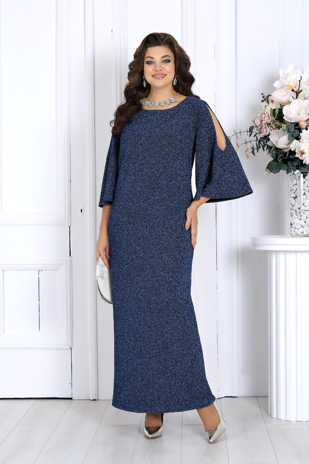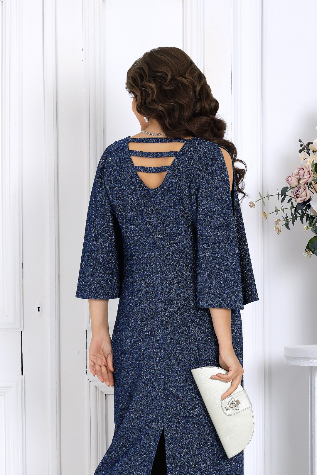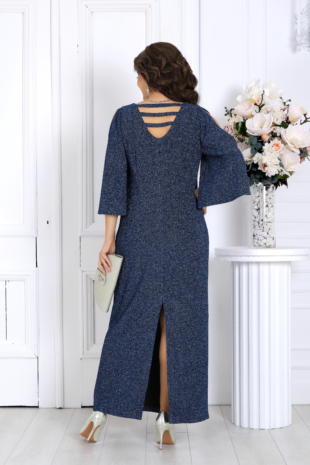 Платье женское полуприлегающего силуэта, выполнено из трикотажного полотна с фактурной лицевой стороной «люрекс». Модель на трикотажной подкладке, без застежки и плечевых накладок. Перед платья с нагрудными вытачками, направленными от проймы. Спинка с талиевыми вытачками и разрезом в нижней части среднего шва.  Края V-образной горловины спинки фиксируются тремя перемычками из основного материала; горловина переда круглой формы. Рукав трехчетвертной, расширенный, с вырезом «капля» от плеча. Длина платья -- 144 см; длина рукава - 49 см.