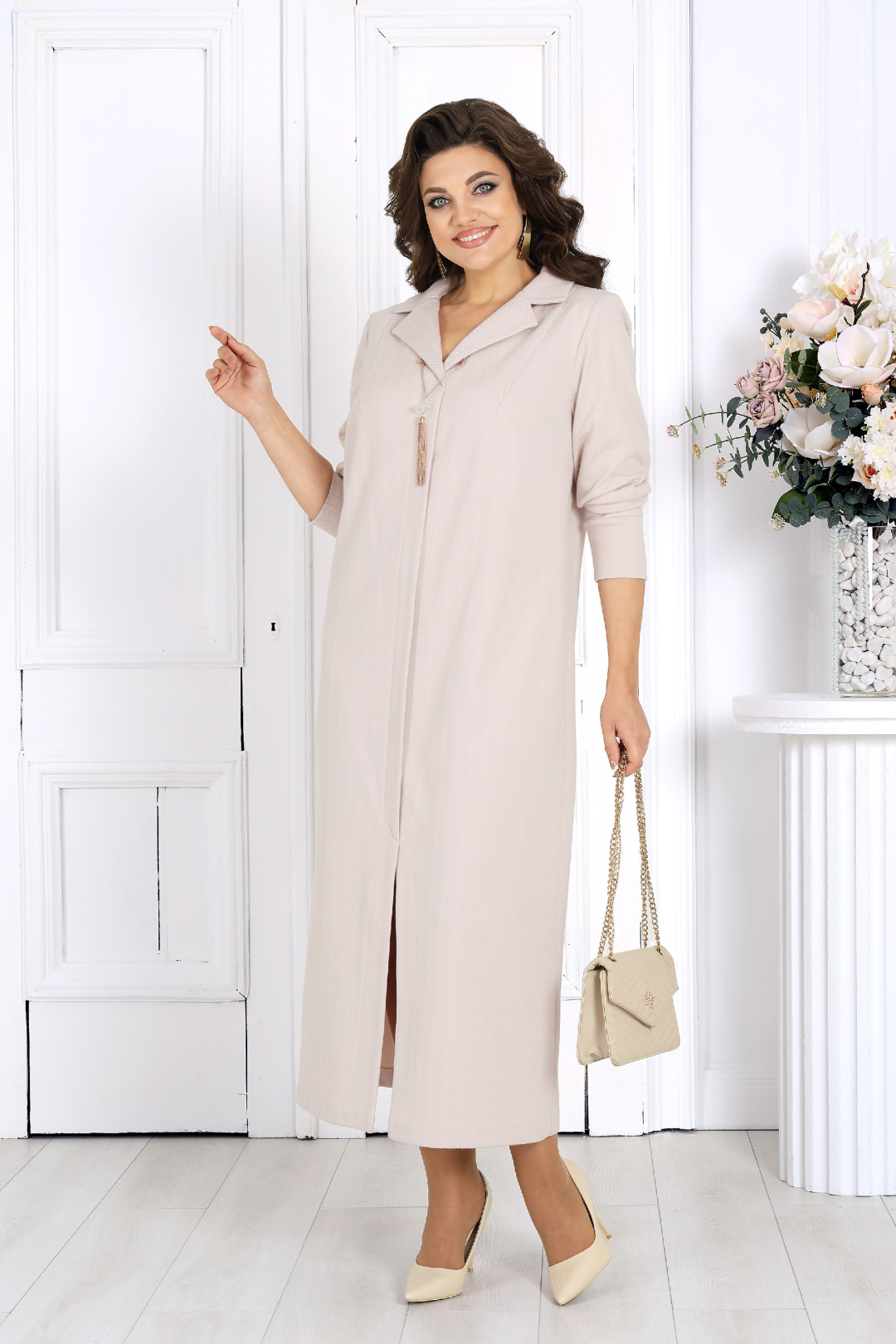 Платье женское прямого силуэта, выполнено из трикотажного полотна «елочка». Модель без подкладки, без застежки. В боковых швах платья обработаны карманы. По переду – имитация потайной бортовой застежки; от плечевых швов к центру груди направлены вытачки. Спинка со средним швом. Воротник пиджачного типа. Рукав втачной, длинный, с притачной, замкнутой манжетой по низуДлина платья – 123 см.; длина рукава – 59 см.