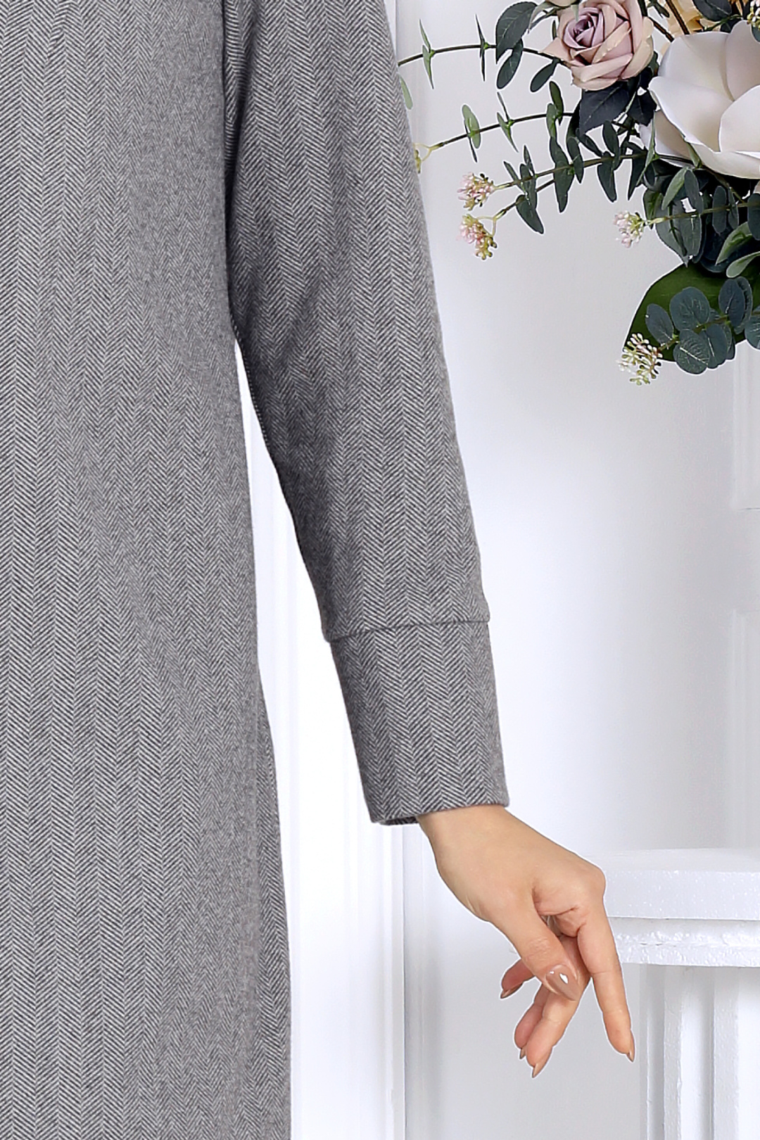Платье женское прямого силуэта, выполнено из трикотажного полотна «елочка». Модель без подкладки, без застежки. В боковых швах платья обработаны карманы. По переду – имитация потайной бортовой застежки; от плечевых швов к центру груди направлены вытачки. Спинка со средним швом. Воротник пиджачного типа. Рукав втачной, длинный, с притачной, замкнутой манжетой по низуДлина платья – 123 см.; длина рукава – 59 см.