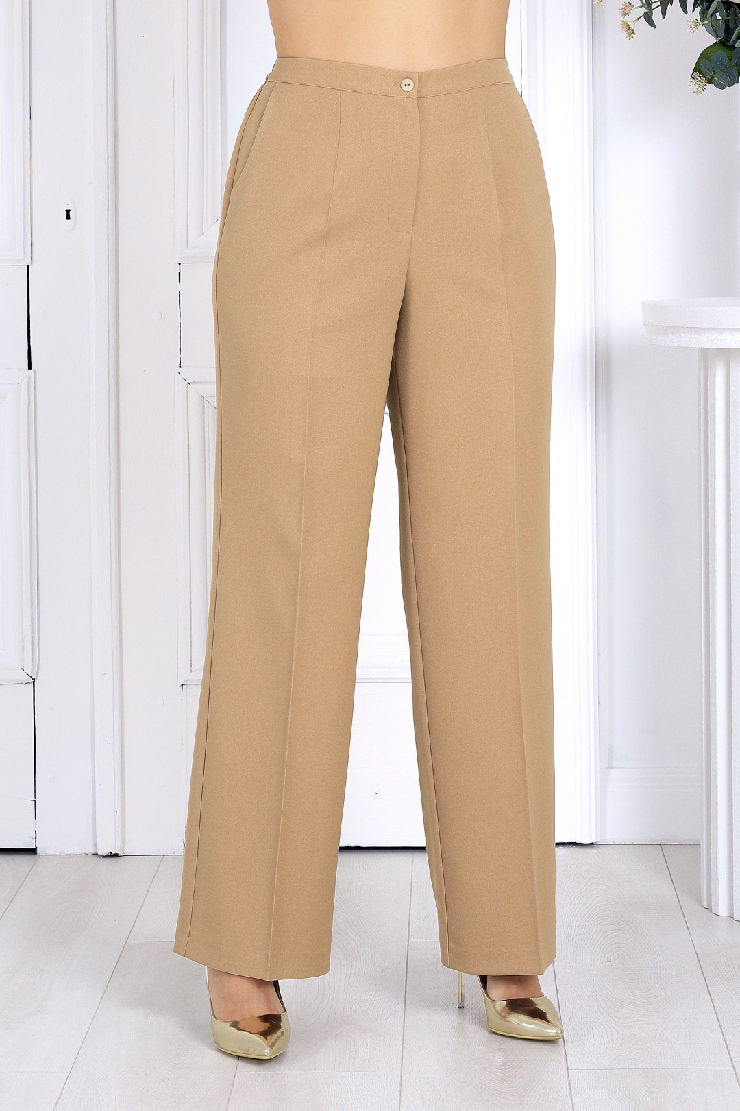 Брюки классические, с кантами и посадкой на талии, выполнены из костюмной поливискозы. Модель с центральной застёжкой на тесьму-«молнию», на притачном поясе, застегивающемся на петлю и пуговицу. Передние и задние половинки брюк с талиевыми вытачками, направленными от пояса вниз. Спереди обработаны боковые наклонные карманы. Для лучшего прилегания брюк в области талии в поясе по задним половинкам вставлена эластичная лента.