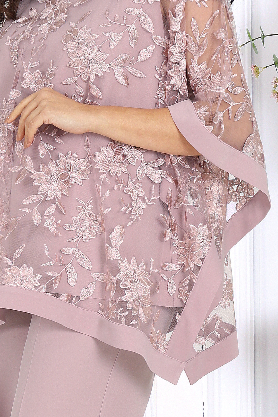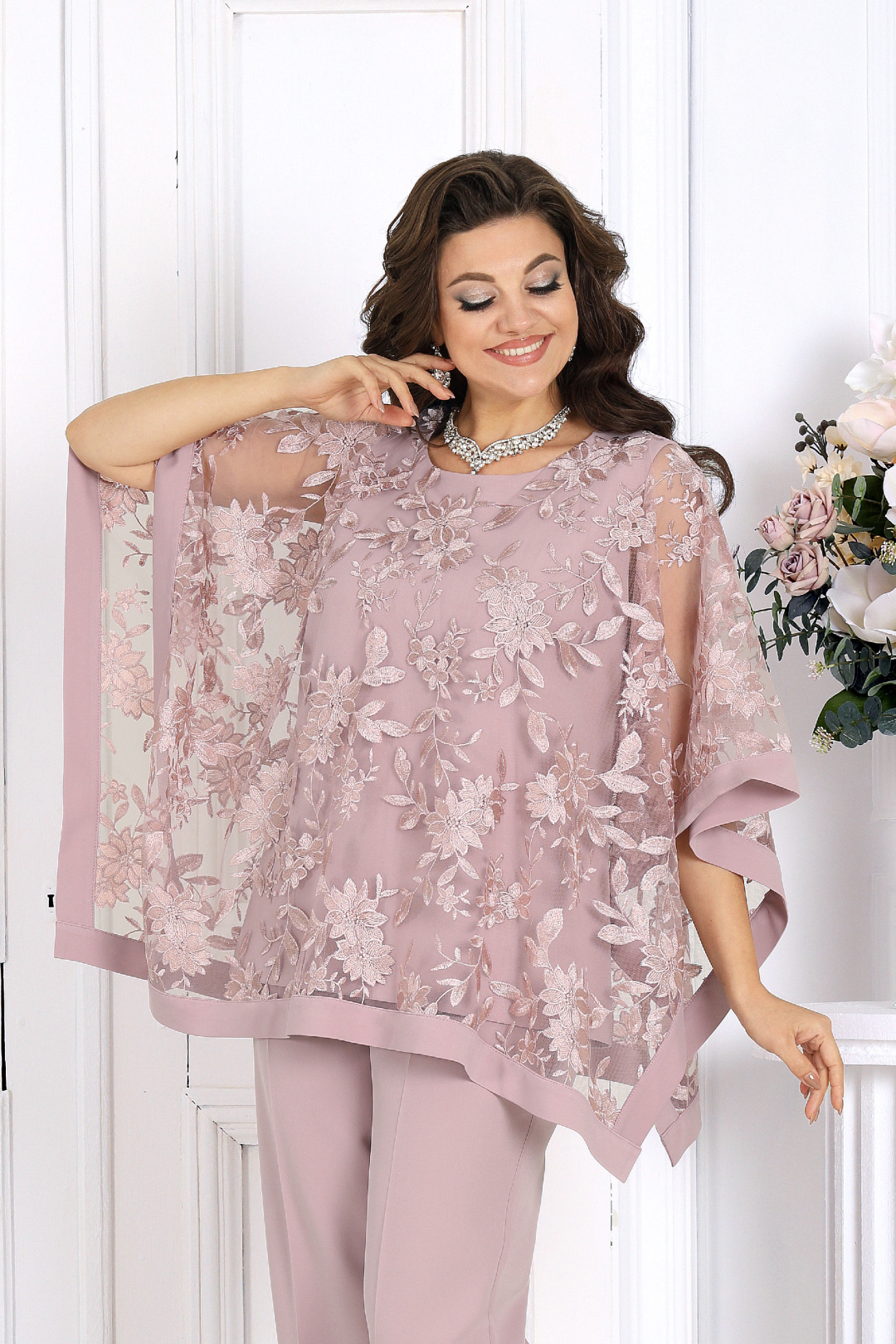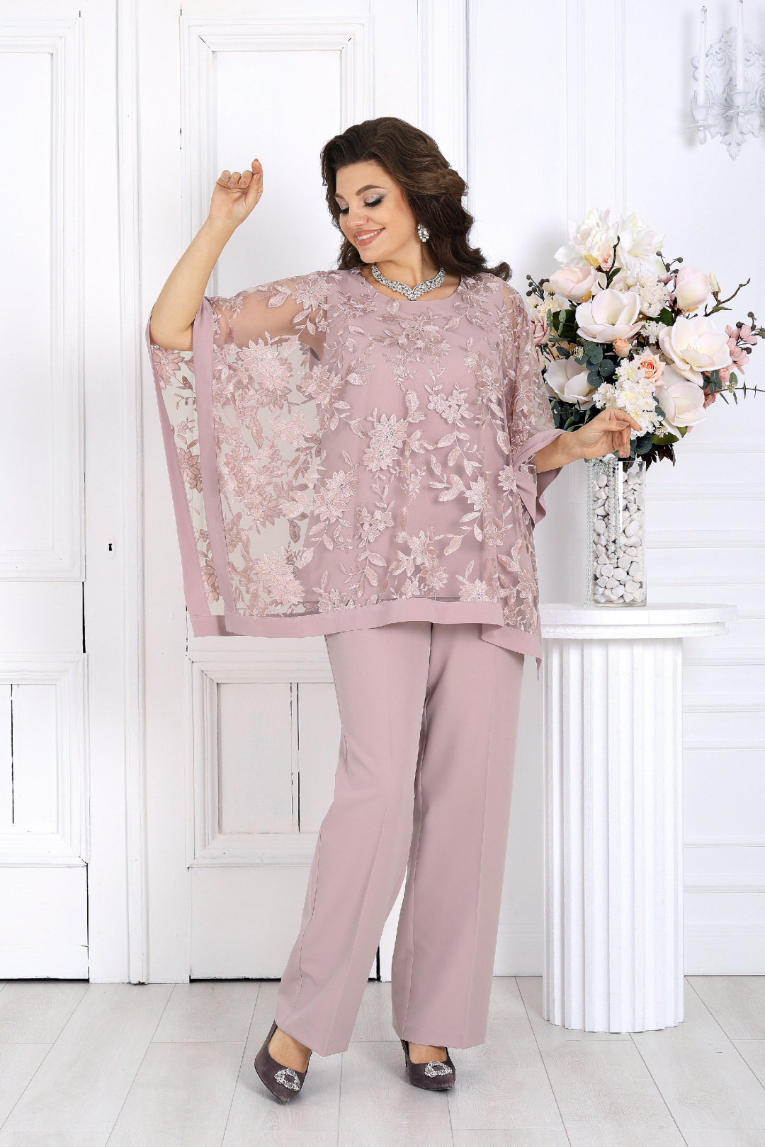 Элегантный костюм, который создан, чтобы подчеркнуть красоту и уверенность женщины в любой ситуации. Воздушный гипюр и струящиеся ткани создают утончённый образ, идеально подходящий для торжеств, свадеб, юбилеев и праздничных вечеров. Свободный крой и продуманная посадка делают костюм комфортным для женщин с формами — он не сковывает движения и красиво драпируется, визуально вытягивая силуэт. Верх выполнен в виде эффектной блузки из гипюра, которая мягко скрывает зону рук и талии, а классические брюки со стрелками придают образу стройность и изящество. Комплект брючный 2-х предметный, состоящий из блузки и брюк. Блузка, комбинированная, выполнена из костюмно-плательной ткани и гипюра. Модель без застежки и воротника, без рукавов и плечевых накладок. Блузка состоит из двух слоев: нижний представляет собой блузку полуприлегающего силуэта, с нагрудными вытачками по переду и талиевыми – по спинке; верхний слой выполнен в виде пончо прямоугольной формы с притачной бейкой по всем краям. Горловина круглой формы, углубленная спереди. Длина блузки – 65 см. Брюки классические, длинные, с посадкой на талии, выполнены из костюмно- плательной ткани. Модель со стрелками. Передние и задние половинки брюк с талиевыми вытачками, направленными от пояса вниз. Спереди обработаны наклонные боковые карманы и центральная застёжка на тесьму-«молнию». Притачной пояс застегивается на 1 петлю и 1 пуговицу; для лучшего прилегания по линии талии в притачном поясе предусмотрена эластичная лента, вставленная по спинке. Длина брюк по боковому (с поясом) – 107 см.