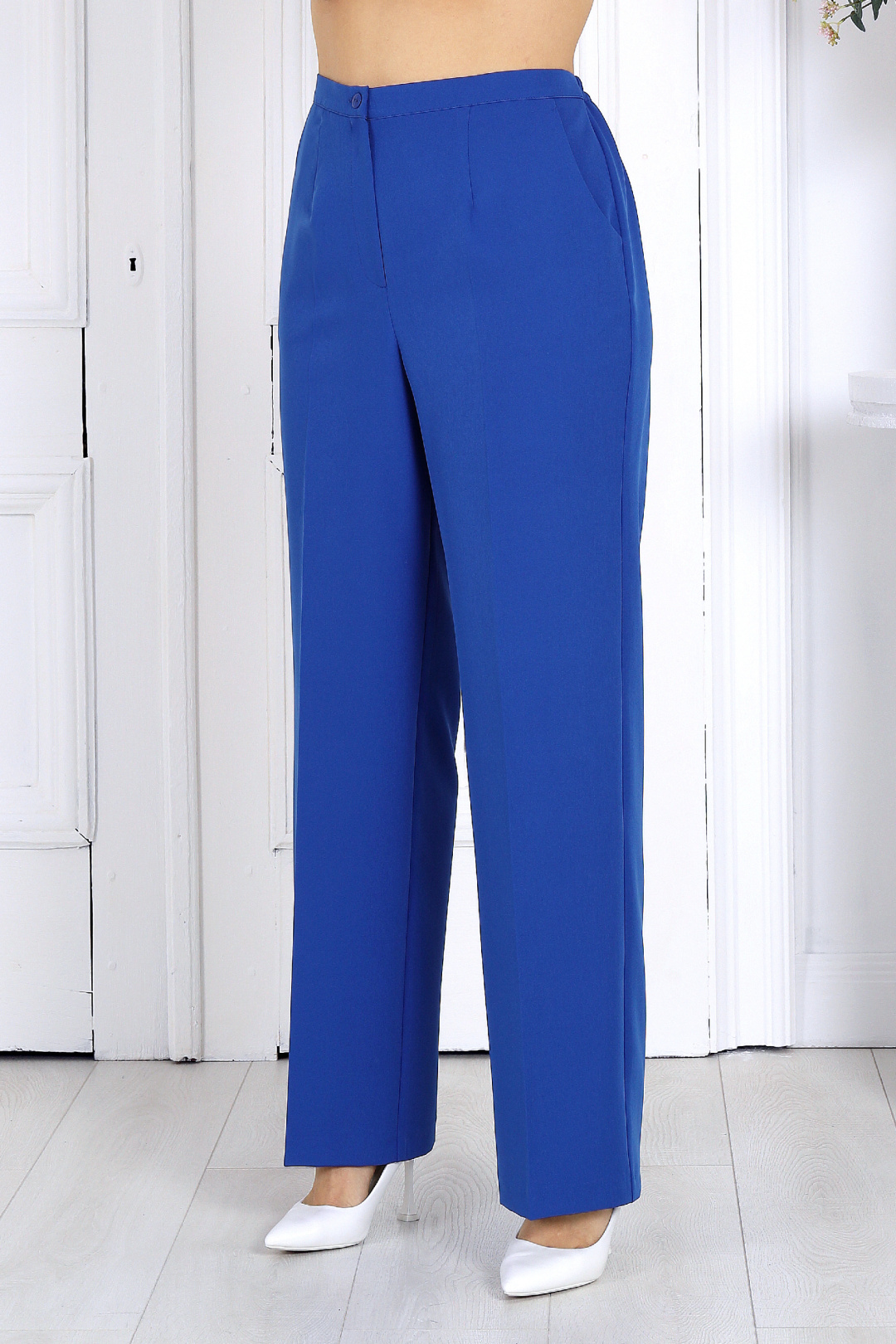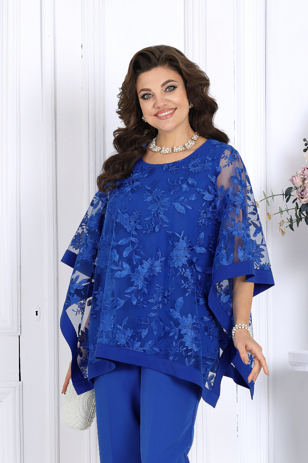 Элегантный костюм, который создан, чтобы подчеркнуть красоту и уверенность женщины в любой ситуации. Воздушный гипюр и струящиеся ткани создают утончённый образ, идеально подходящий для торжеств, свадеб, юбилеев и праздничных вечеров. Свободный крой и продуманная посадка делают костюм комфортным для женщин с формами — он не сковывает движения и красиво драпируется, визуально вытягивая силуэт. Верх выполнен в виде эффектной блузки из гипюра, которая мягко скрывает зону рук и талии, а классические брюки со стрелками придают образу стройность и изящество. Комплект брючный 2-х предметный, состоящий из блузки и брюк. Блузка, комбинированная, выполнена из костюмно-плательной ткани и гипюра. Модель без застежки и воротника, без рукавов и плечевых накладок. Блузка состоит из двух слоев: нижний представляет собой блузку полуприлегающего силуэта, с нагрудными вытачками по переду и талиевыми – по спинке; верхний слой выполнен в виде пончо прямоугольной формы с притачной бейкой по всем краям. Горловина круглой формы, углубленная спереди. Длина блузки – 65 см. Брюки классические, длинные, с посадкой на талии, выполнены из костюмно- плательной ткани. Модель со стрелками. Передние и задние половинки брюк с талиевыми вытачками, направленными от пояса вниз. Спереди обработаны наклонные боковые карманы и центральная застёжка на тесьму-«молнию». Притачной пояс застегивается на 1 петлю и 1 пуговицу; для лучшего прилегания по линии талии в притачном поясе предусмотрена эластичная лента, вставленная по спинке. Длина брюк по боковому (с поясом) – 107 см.