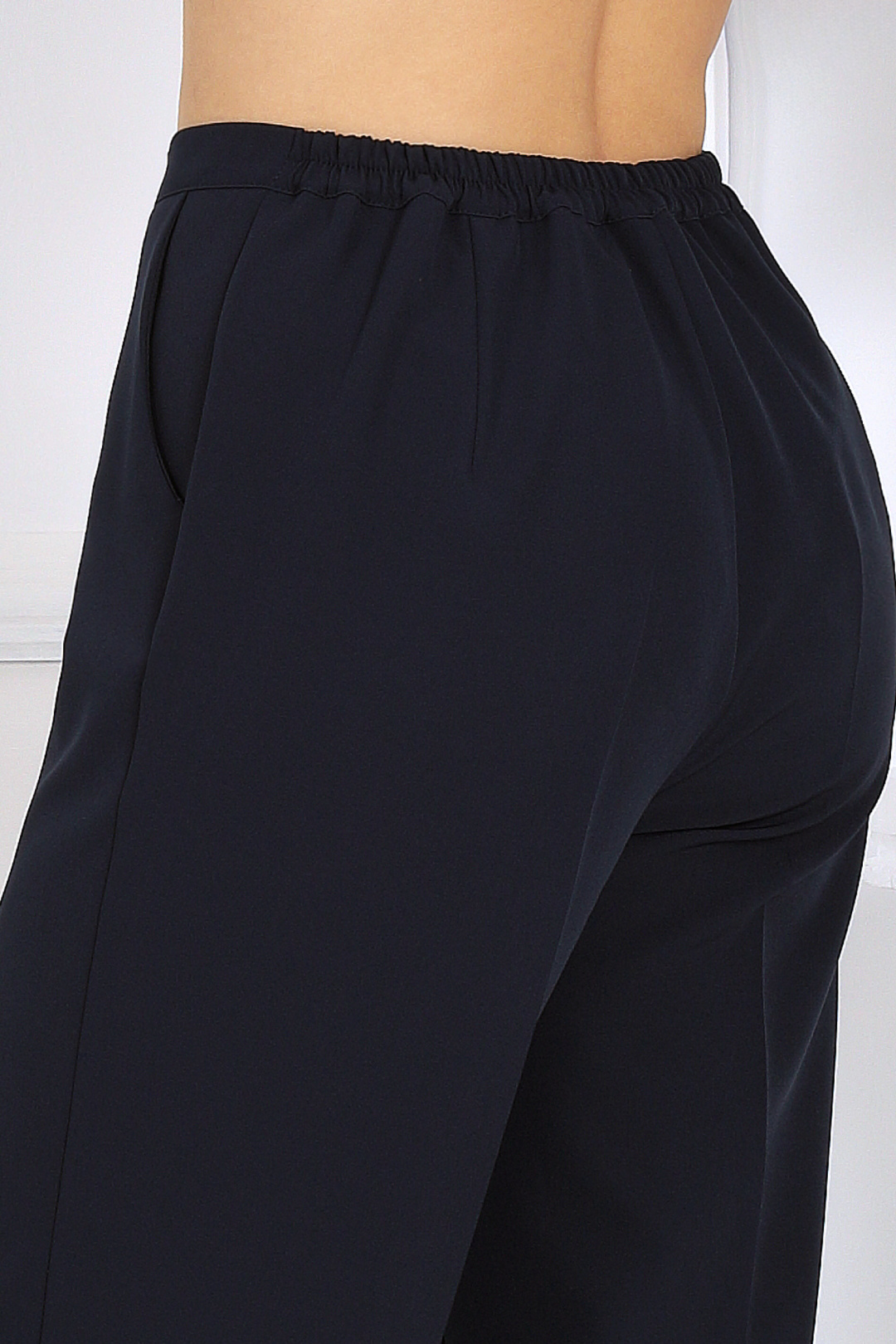Брюки классические, длинные, с посадкой на талии, выполнены из костюмно- плательной ткани. Модель со стрелками. Передние и задние половинки брюк с талиевыми вытачками, направленными от пояса вниз. Спереди обработаны наклонные боковые карманы и центральная застёжка на тесьму-«молнию». Притачной пояс застегивается на 1 петлю и 1 пуговицу; для лучшего прилегания по линии талии в притачном поясе предусмотрена эластичная лента, вставленная по спинке. Длина брюк по боковому (с поясом) -- 107 см.