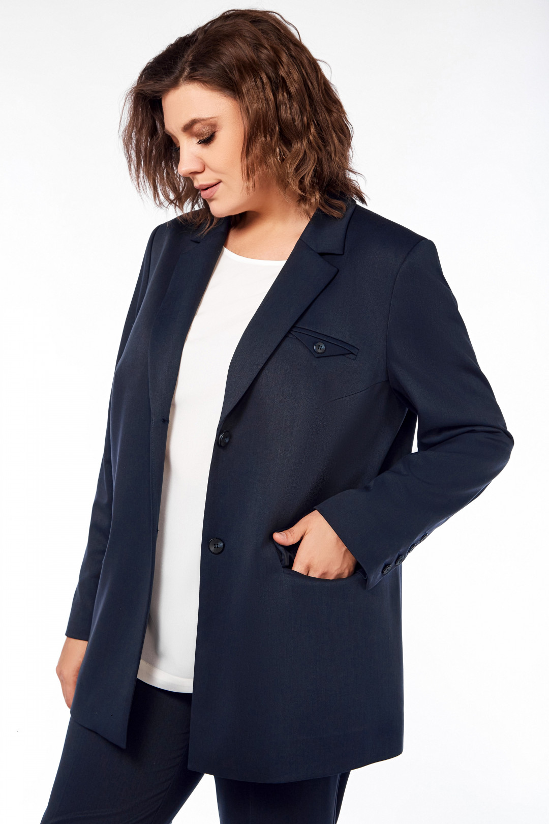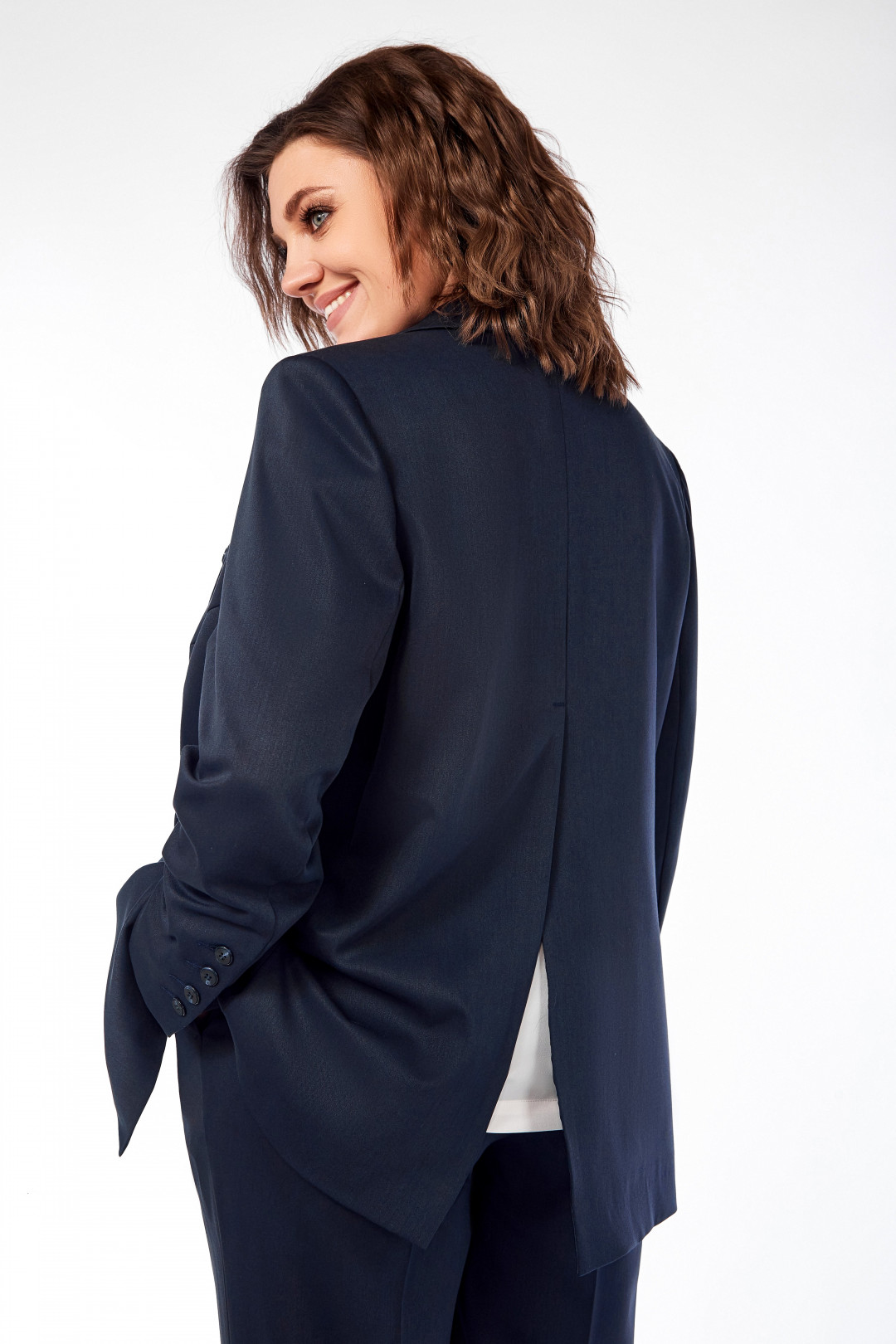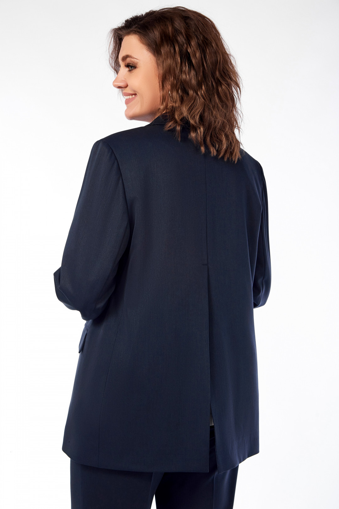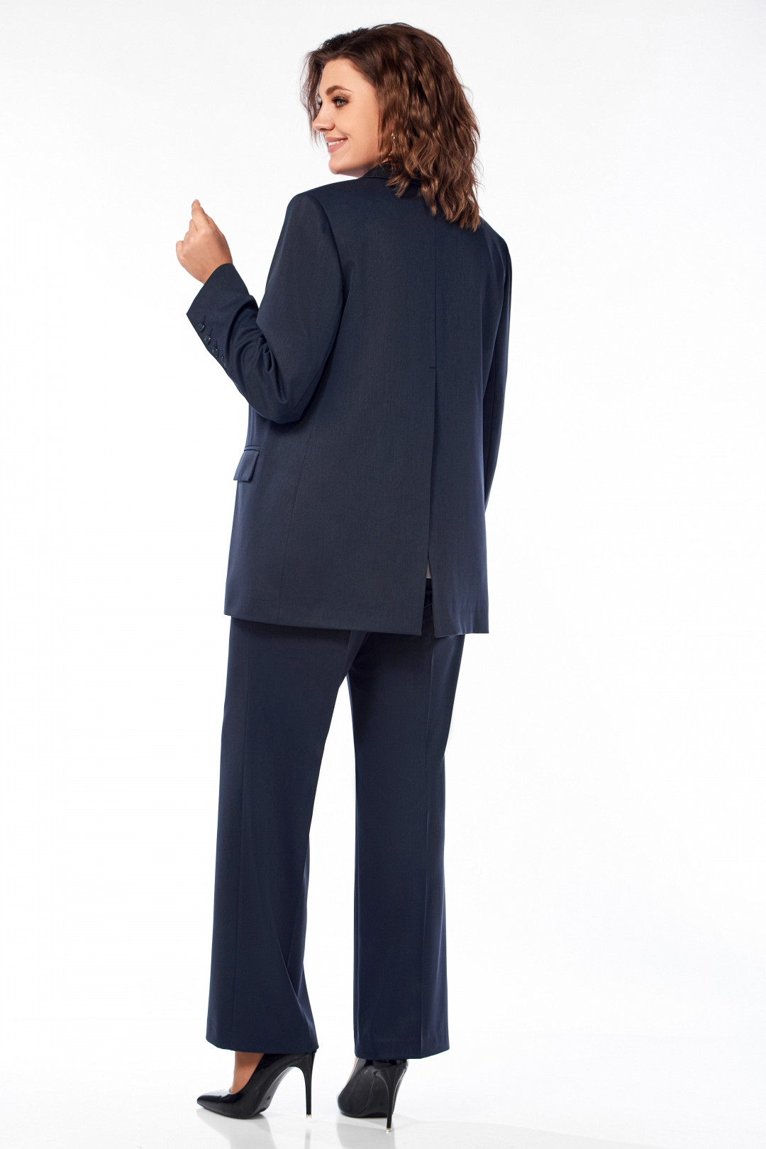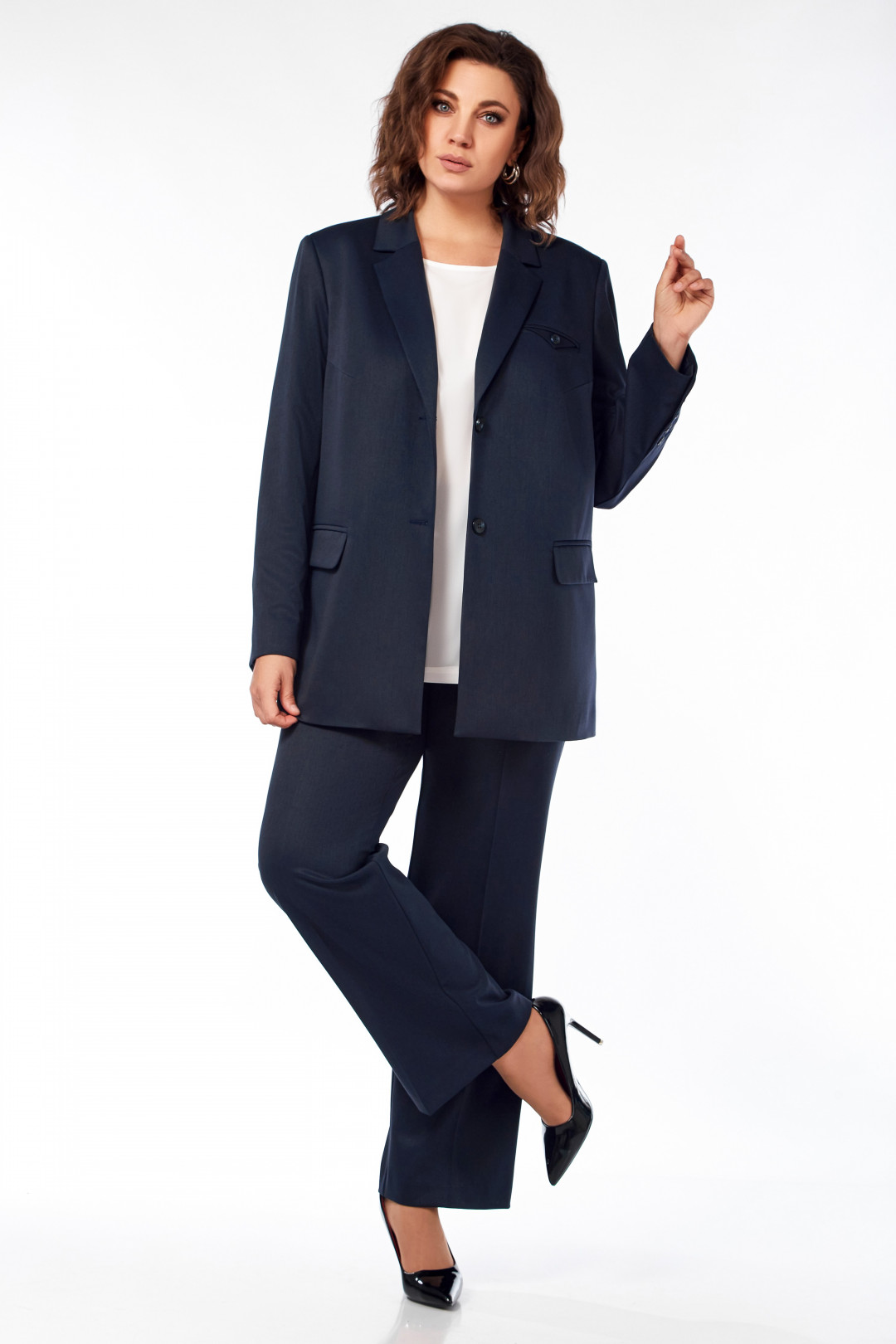 Костюм трехпредметный: жакет, блузка, брюки. Жакет прямого силуэта, на подкладке, с нагрудными вытачками, карманы с клапанами в рамку, в верхней части декоративная листочка с пуговицей, по спинке средний шов с глубокой шлицей, начинается на уровне лопаток. Рукав двухшовный, по локтевому шву шлицы с застежкой на четыре пуговицы. Блузка прямого силуэта, с нагрудными вытачками, разрезами в боковых швах, без рукава. Брюки слегка заужены к низу, на поясе, по спинке резинка, застежка на пуговицу и тесьму-молнию, с наклонными карманами к боковому шву, справа на заднем полотнище декоративный карман в рамку с пуговицей. Дл жакета 75см, дл рукава 62,5см, дл брюк с учетом пояса 110 см, дл блузки 65см.