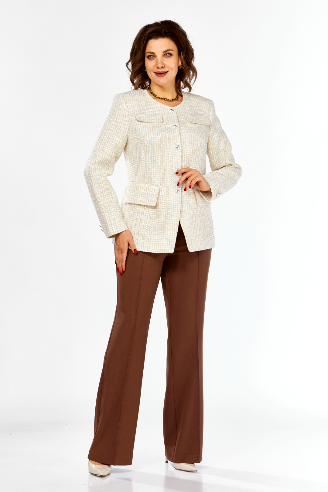 | Очень элегантный костюм, жакет в стиле Шанель. Жакет полуприлегающего силуэта, с застежкой на петли и пуговицы. Вырез горловины округлой формы. По переду рельефы, карманы с клапанами в низу, в верхней части декоративные клапаны. Спинка со средним швом. Рукав втачной со шлицами. На подкладке. Брюки прямые со стрелками, стрелки по переду застрочены. Пояс притачной по спинке на резинке. Боковые карманы. |