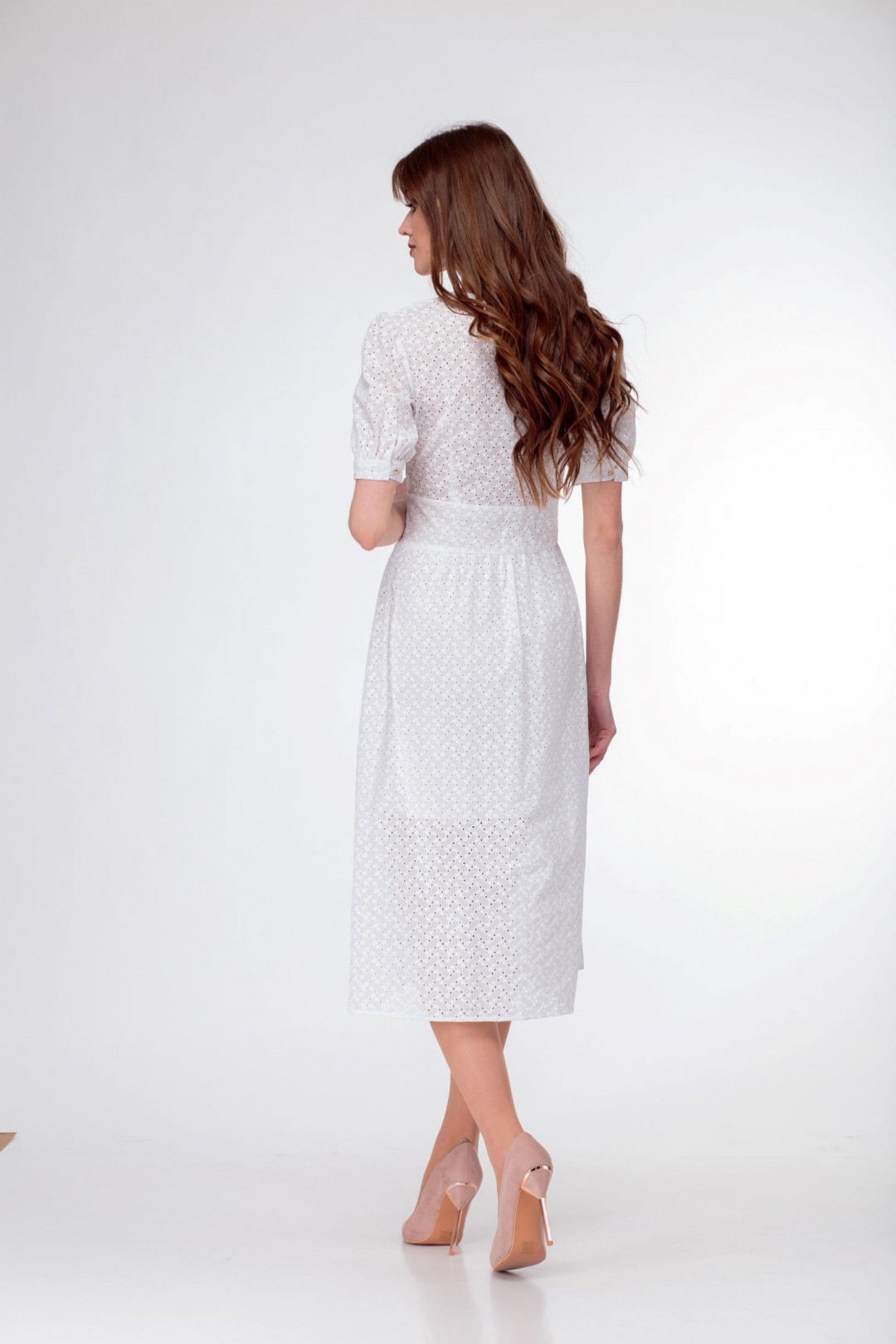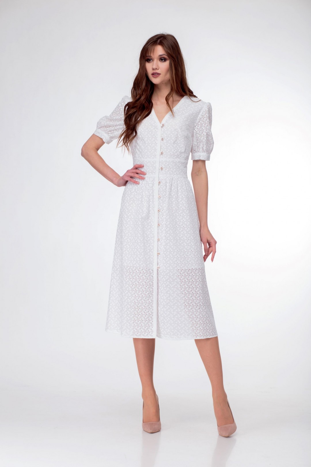 Хлопоковое ришелье на подкладкесо сквозной застёжкой спереди на навесные петли и пуговицы. Рукава фанариками.